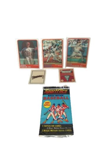 1 OPEN pack of 1988 Sportflics Magic Motion Baseball cards, featuring 3 Superstar cards and 2 Magic Motion Trivia cards: Mike Boddicker - Orioles, John Tudor - STL, Harold Baines - White Sox