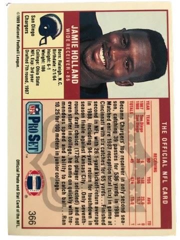 Jamie Holland #86 Chargers Pro Set NFL trading card 366. Condition: near mint.