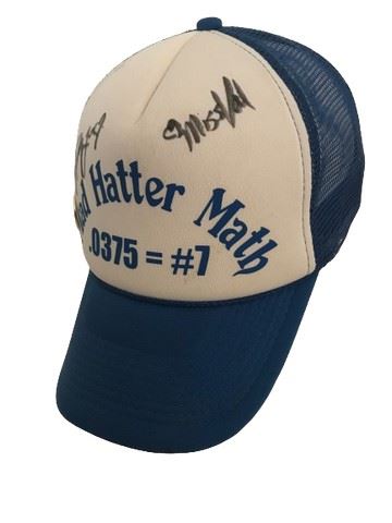 Blue and white mesh trucker hat marked Mad Hatter math .0375 equals #1. Includes UCLA gymnastics national champions button in gold button with blue enamel pin. Signed by Miss Val and one other signature.