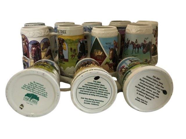 Lot of 12 limited edition Santa Anita Park Stein mugs, commission by Oak Tree Racing Association. Mugs feature colorful artwork honoring horses and jockeys from several races in cups between 1999 and 2008.