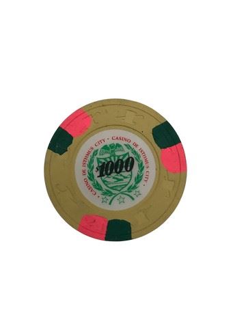 James Bond License to Kill - Screen used "1000 "Poker Chip from Casino De Isthmus City. Hand painted on the edges in dark green and neon pink around the edge (1.5" diameter).