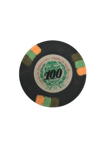 James Bond License to Kill - Screen used "100 "Poker Chip from Casino De Isthmus City. Hand painted on the edges in orange, light green and gold around the edge (1.5" diameter).