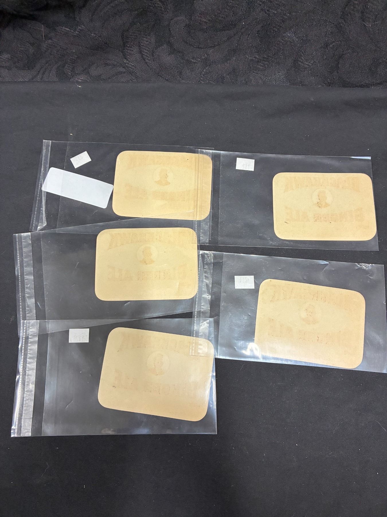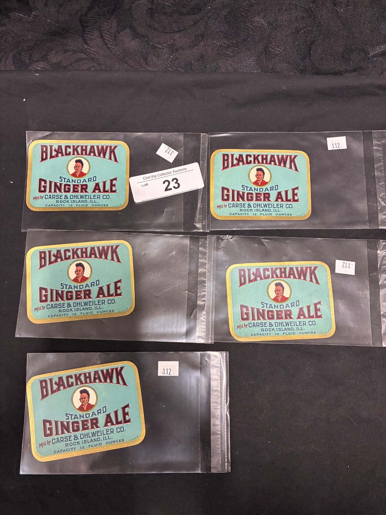 Lot 23 NOS 1920s Blackhawk ginger ale paper bottle labels, great native graphics