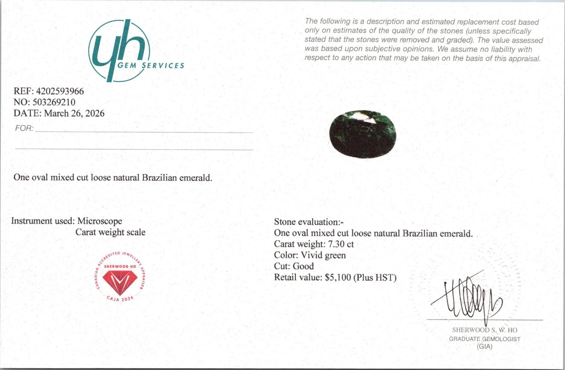 Lot 39 7.3 ct Certified Emerald gemstone ($5,100 Appraisal)