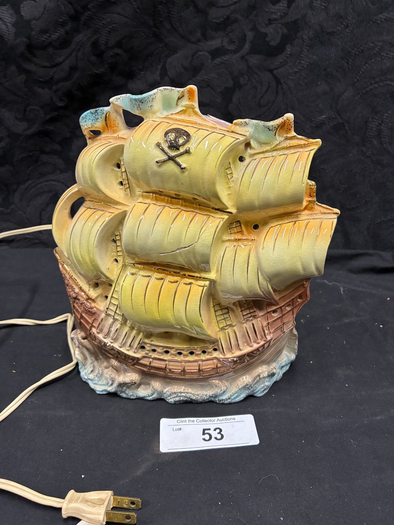 Lot 53 Unique pirate ship lamp, works, has been repaired, 9"