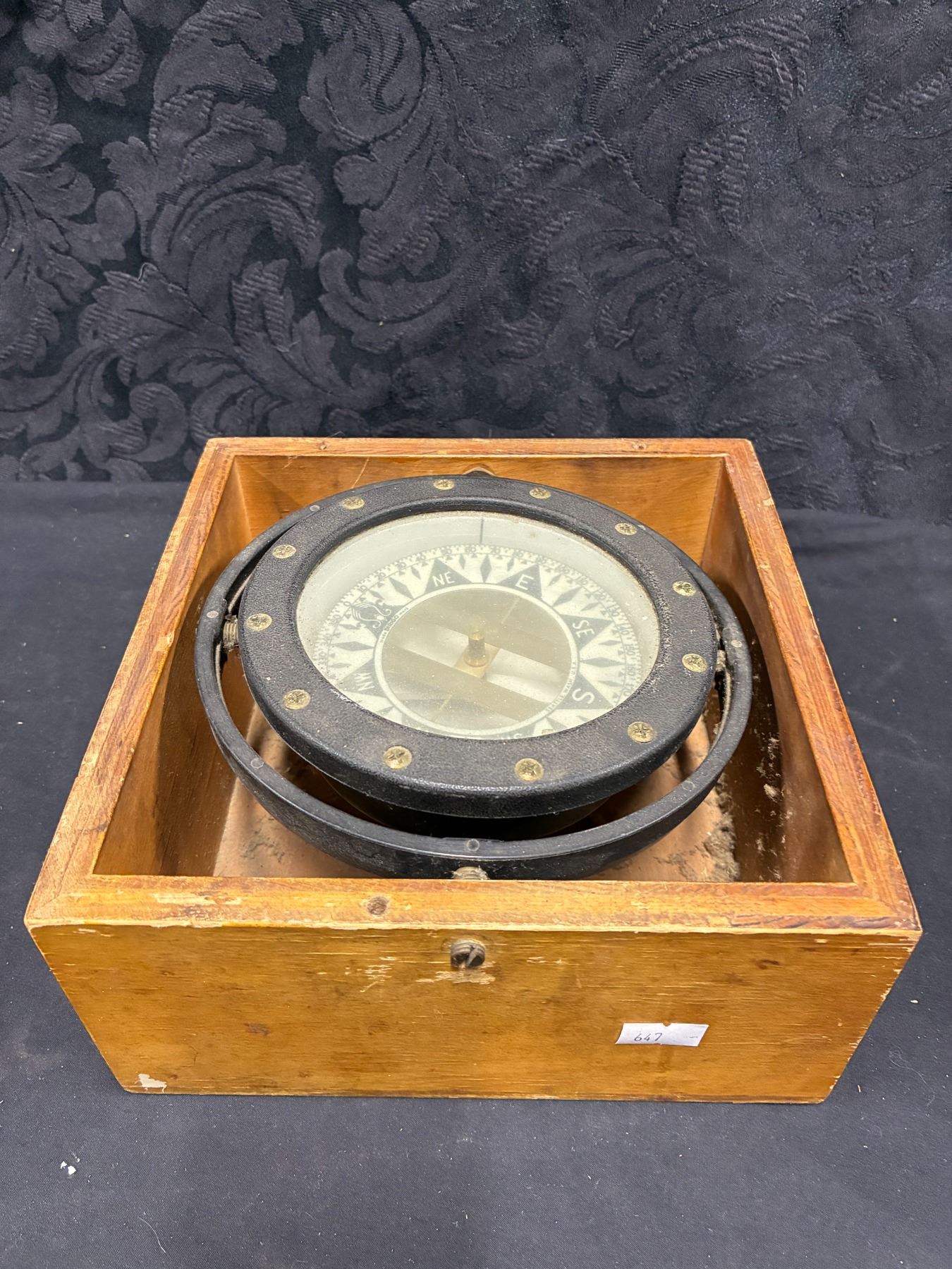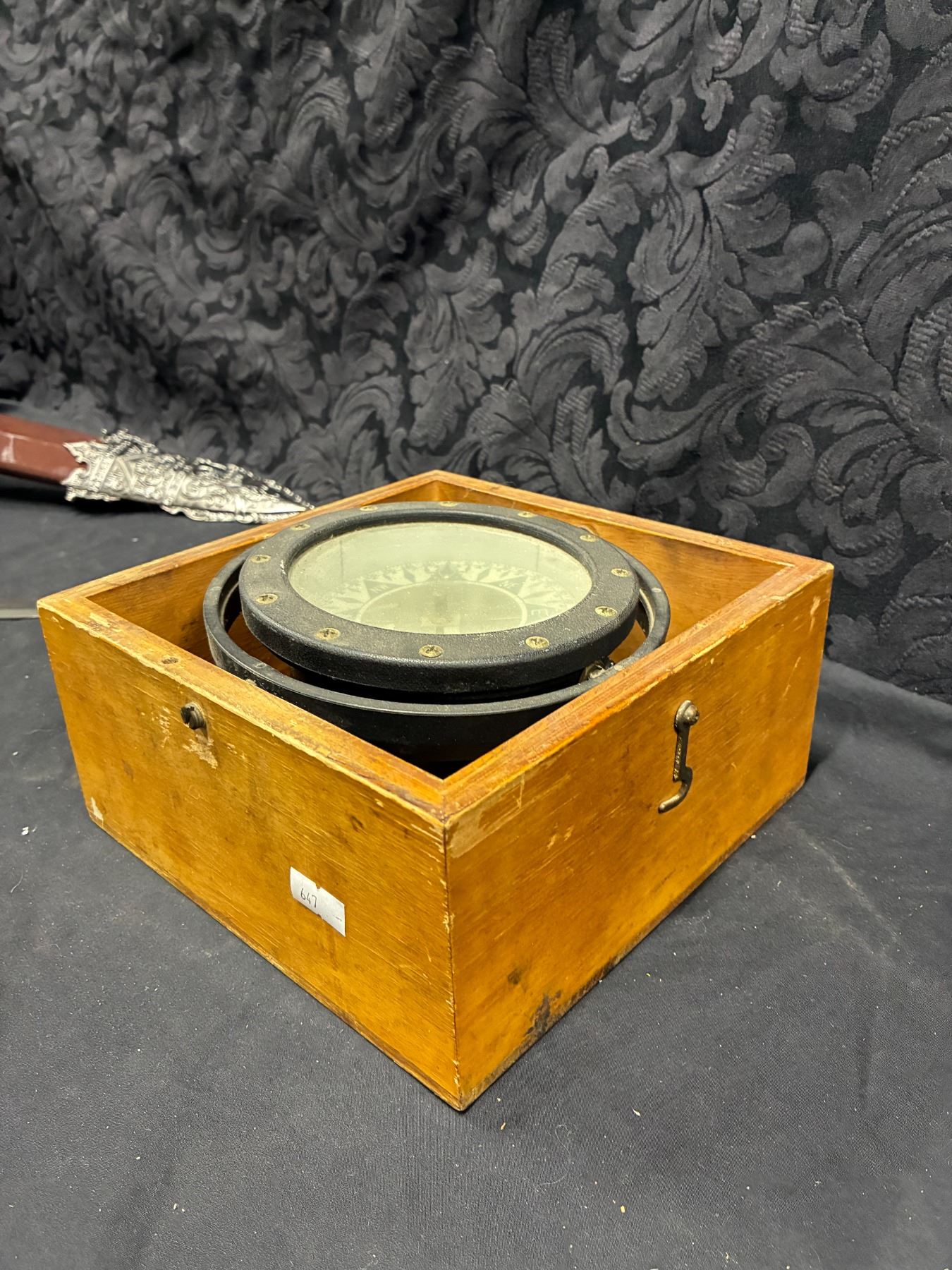 Lot 61 Vintage nautical compass suspended in wooden box, 8"