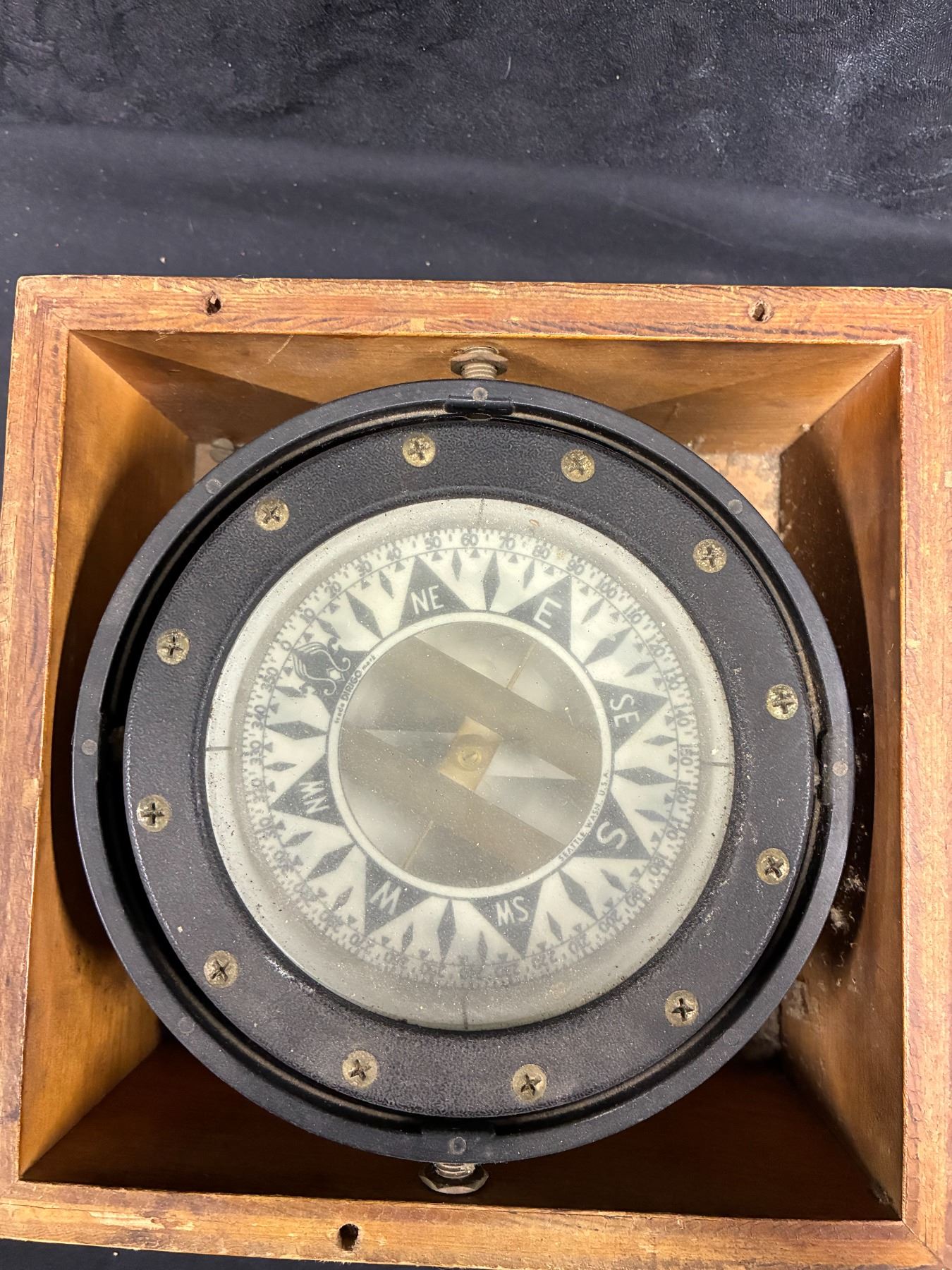 Vintage nautical compass suspended in wooden box, 8"