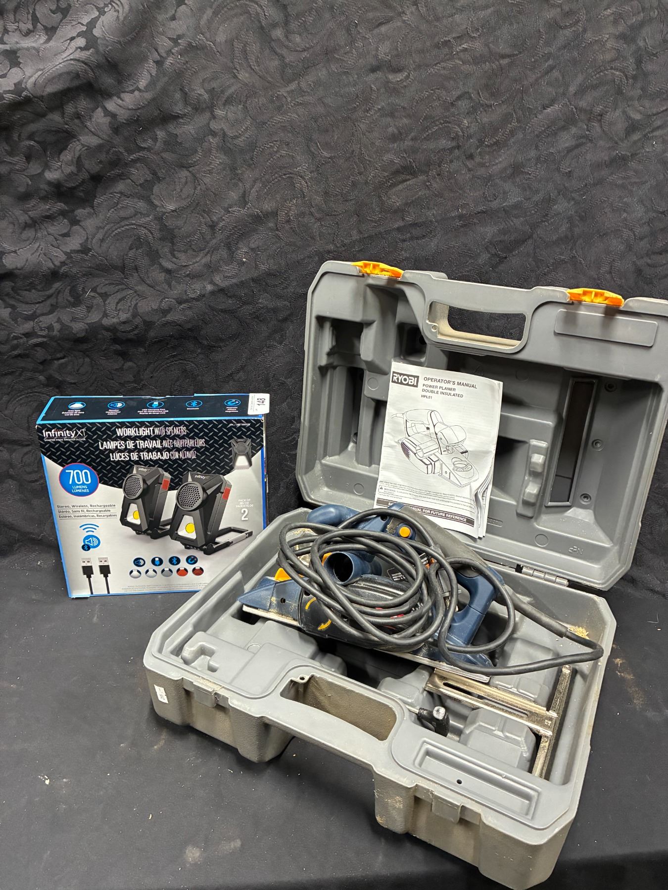 Lot 148 Ryobi hand plainer and 2 new work lights
