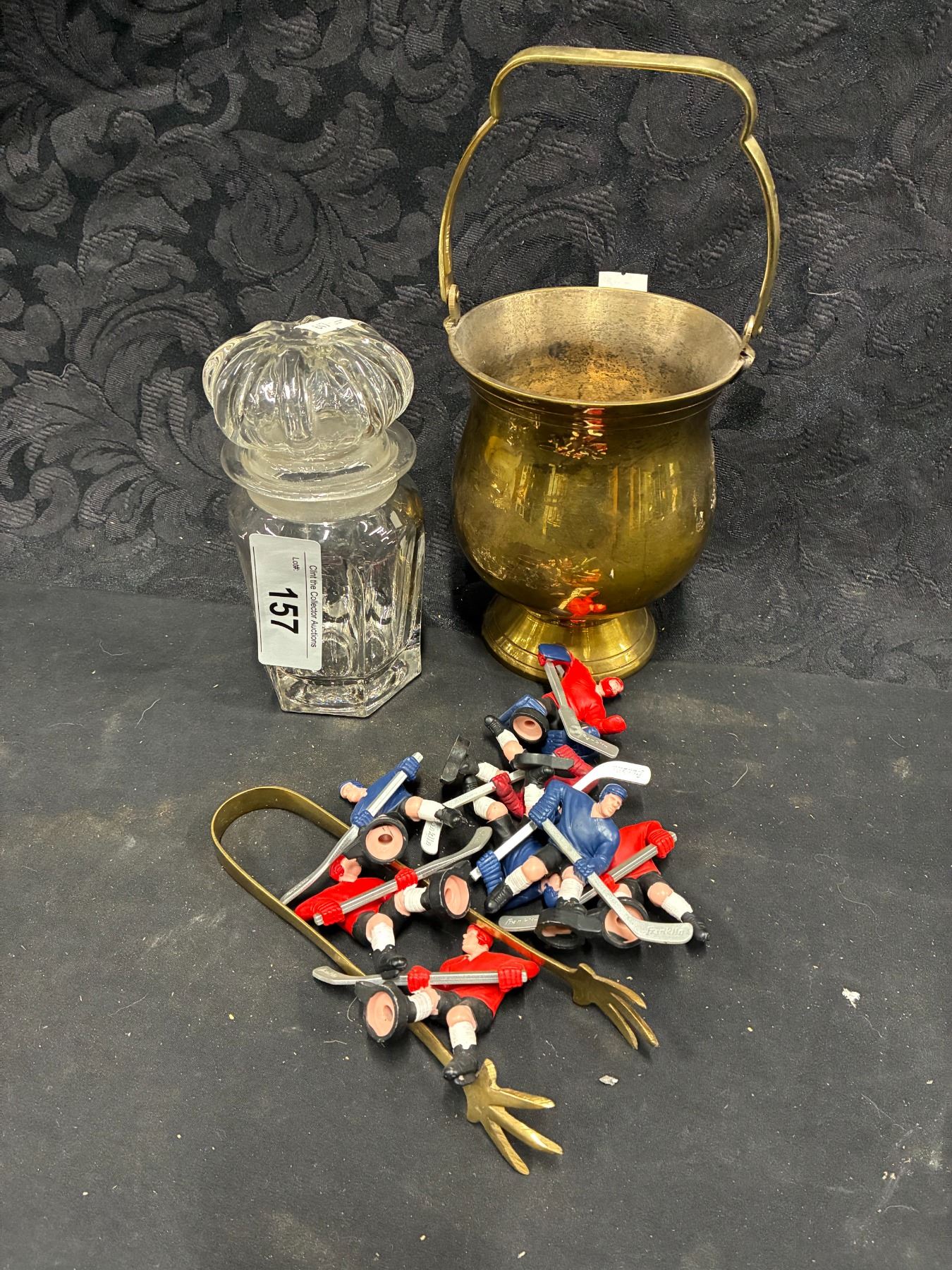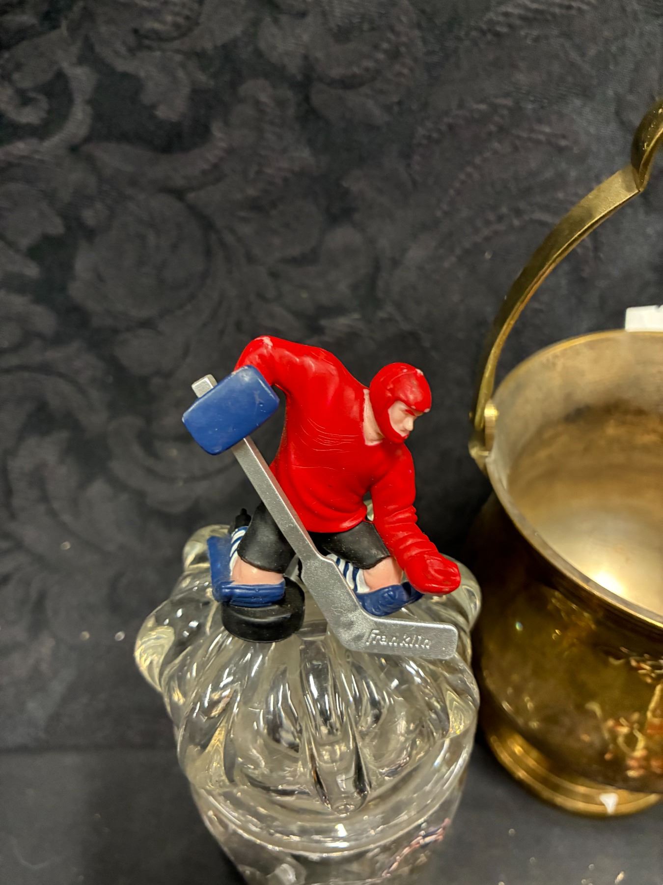 Lot 157 Brass pale with hockey figures and beautiful glass decanter