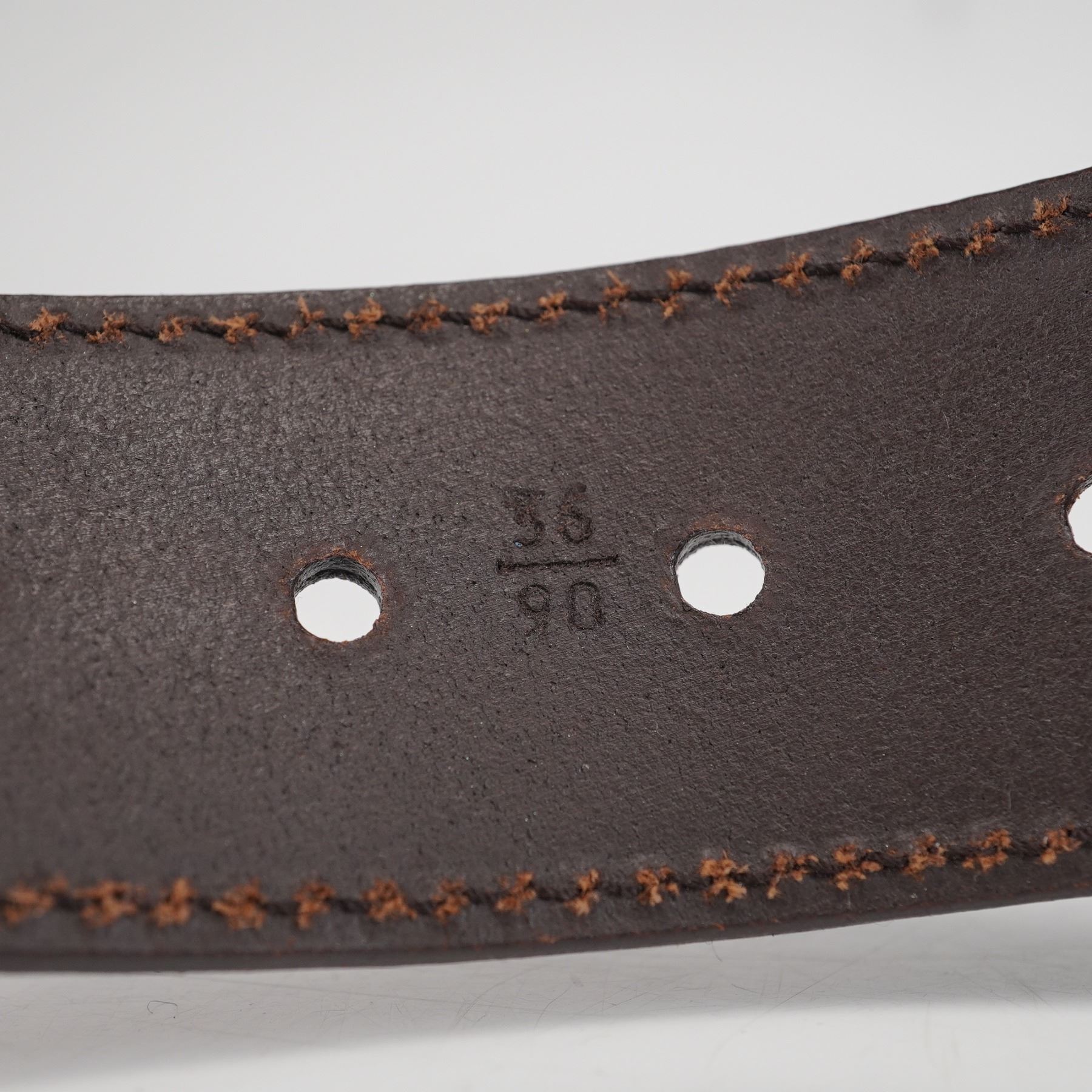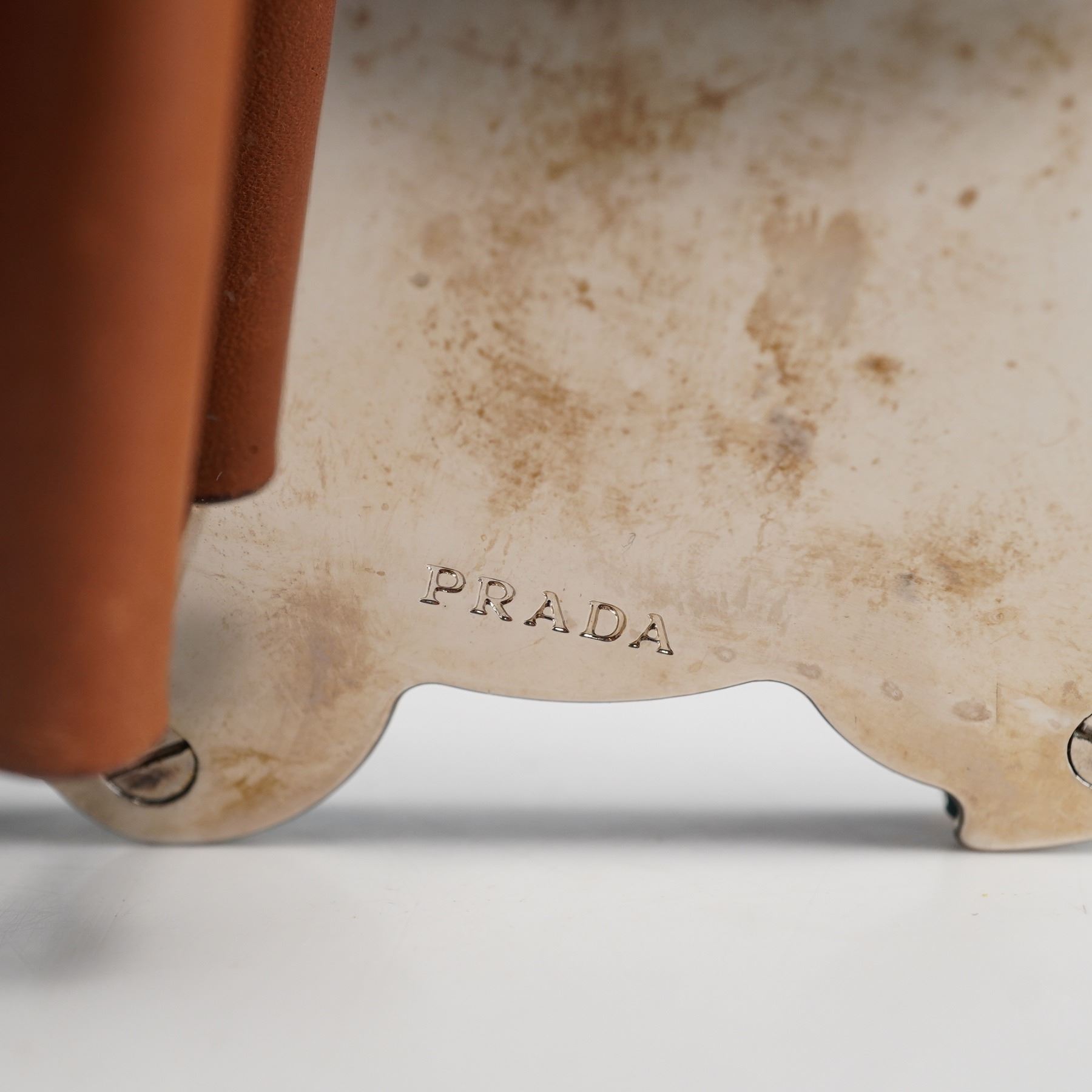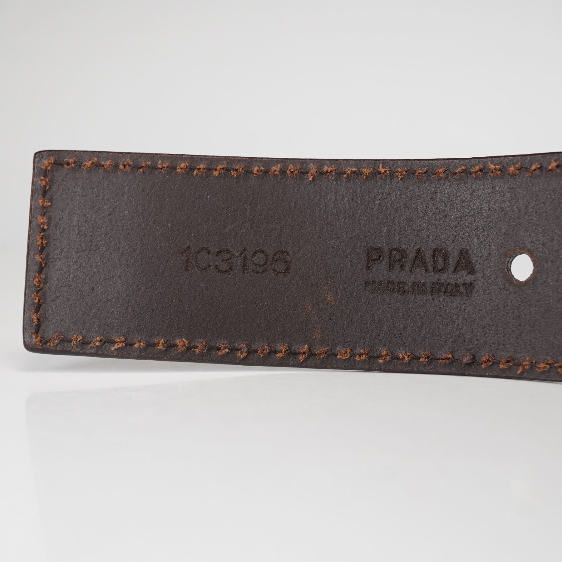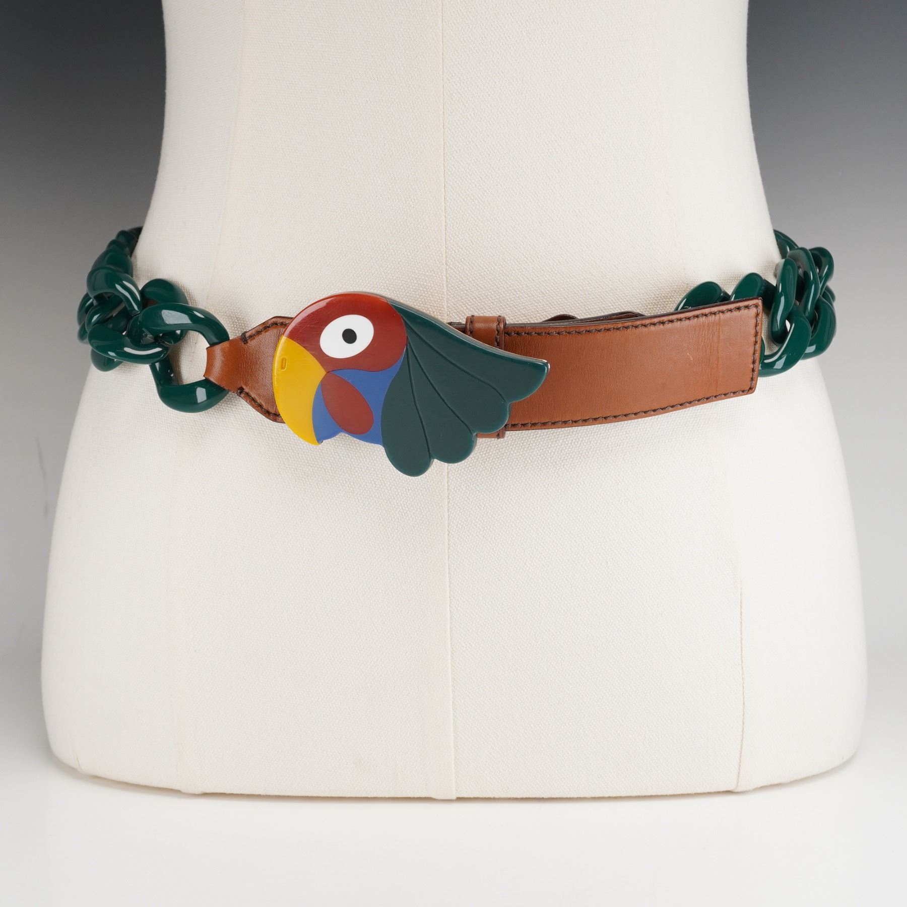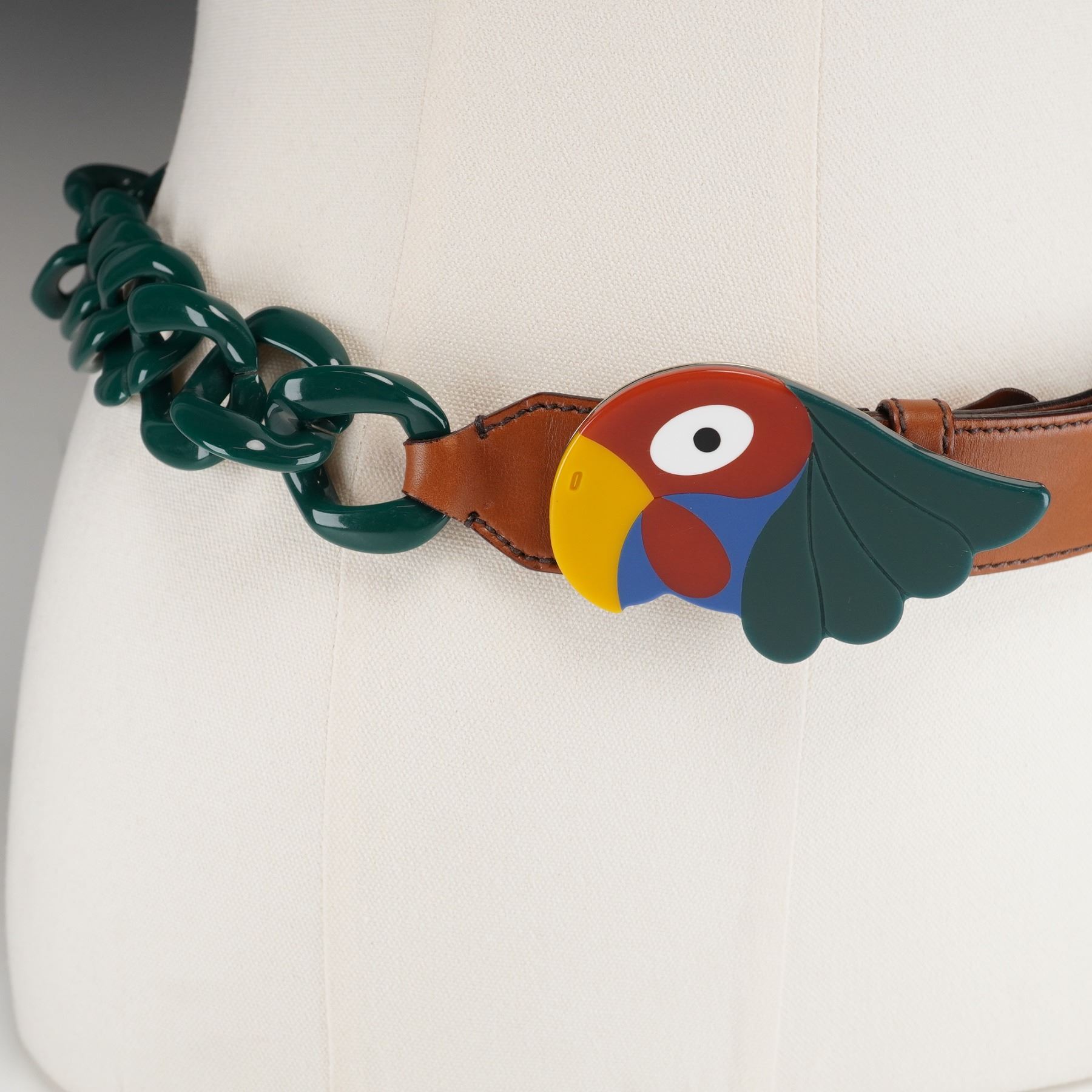 This Prada Toucan belt with bag is an accessory from the Spring/Summer 2005 collection. The belt features a cognac brown leather strap joined to an oversized dark green resin chain link section. The focal point is a multi-colored resin buckle in the shape of a bird head, featuring shades of red, yellow, blue, and dark green with a white eye. The leather portion features tonal brown contrast stitching. The interior of the leather strap is stamped with the model number 1C3196, PRADA, and MADE IN ITALY. The size is stamped as 36 over 90. The reverse of the buckle features a silver-toned metal plate stamped PRADA. This lot includes the associated bag.