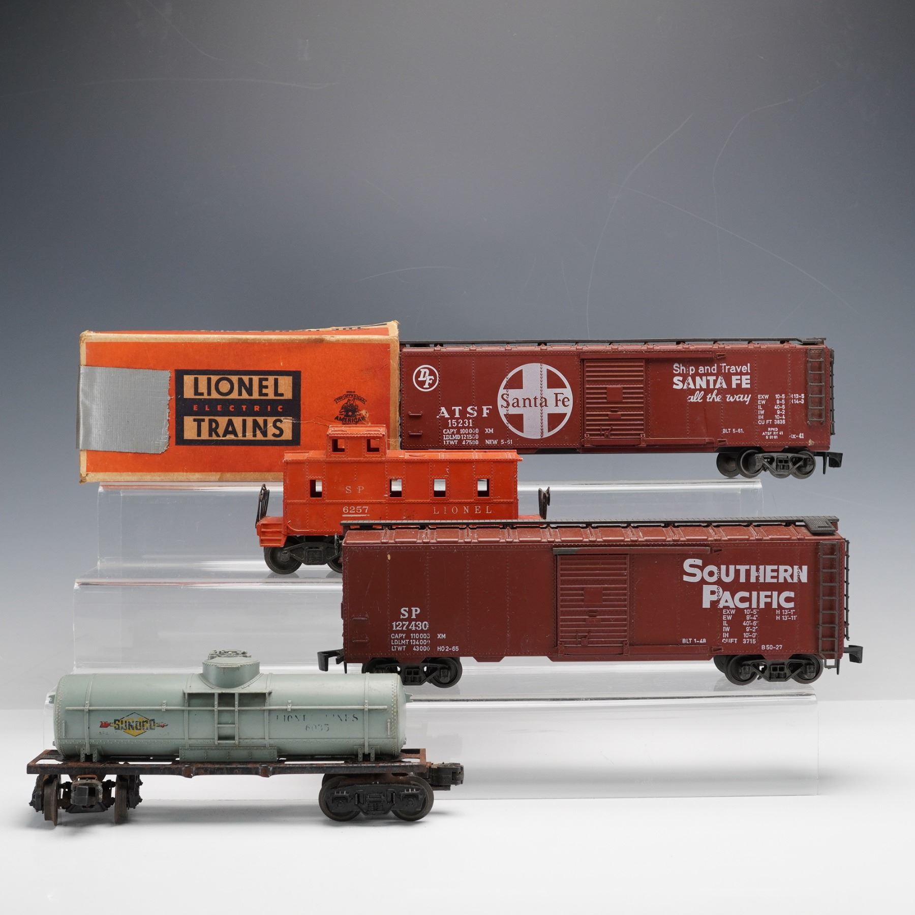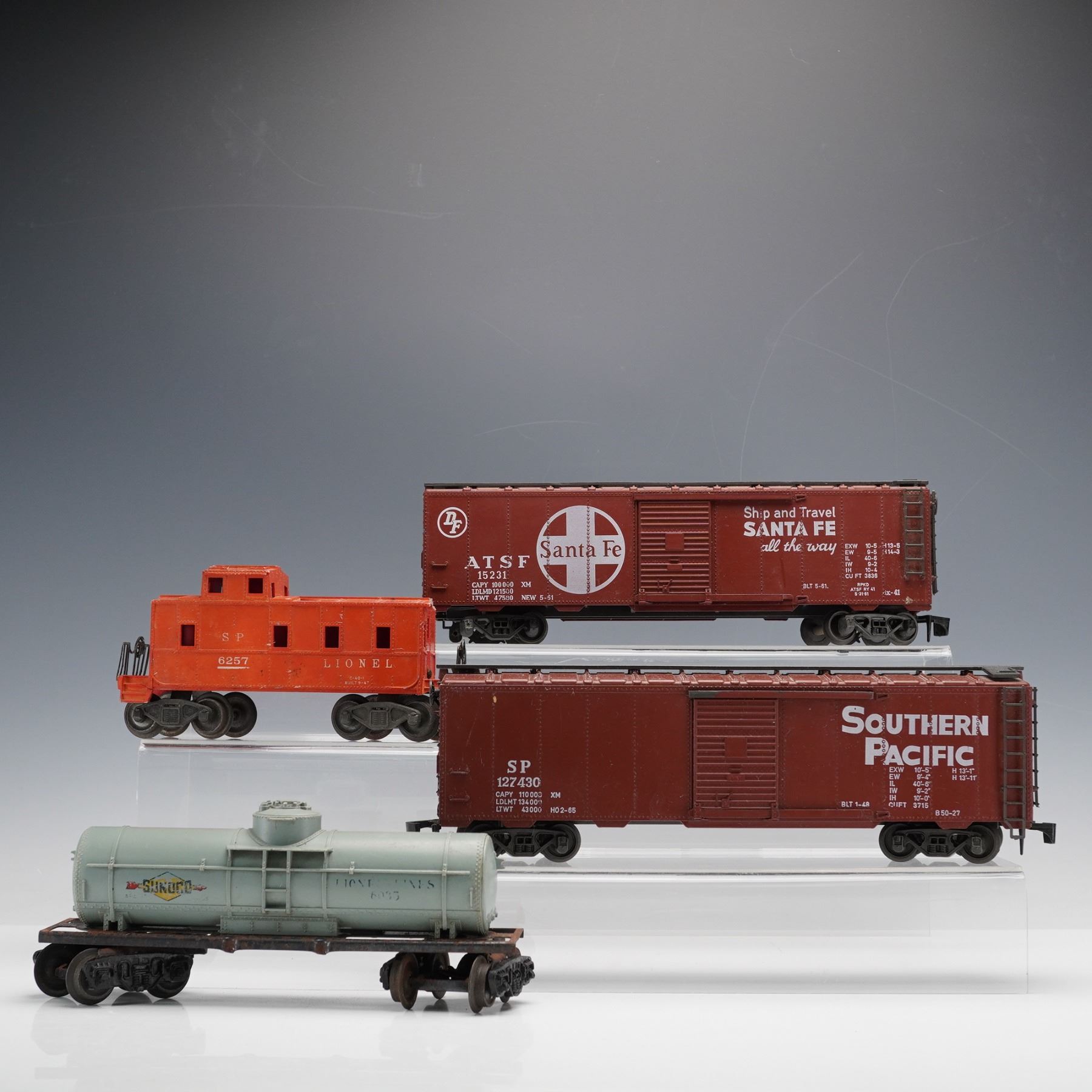 A lot of four vintage Lionel O-gauge freight cars including a Southern Pacific caboose No. 6257, a Santa Fe boxcar No. 15231, a Southern Pacific boxcar No. 127430, and a Sunoco gray tank car No. 6035. Each car features molded details, metal trucks, and couplers, showcasing classic Lionel craftsmanship from the mid-20th century. The Southern Pacific caboose includes its original Lionel box