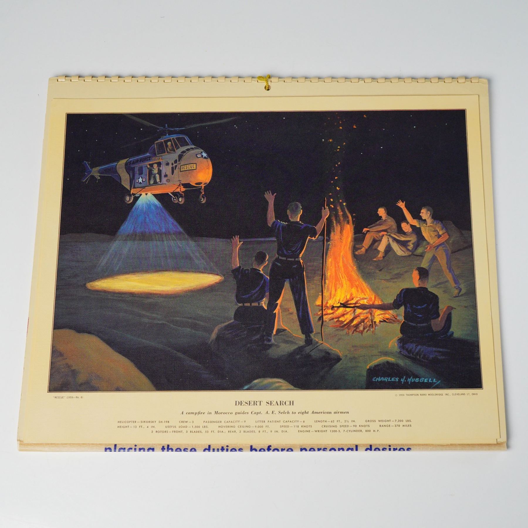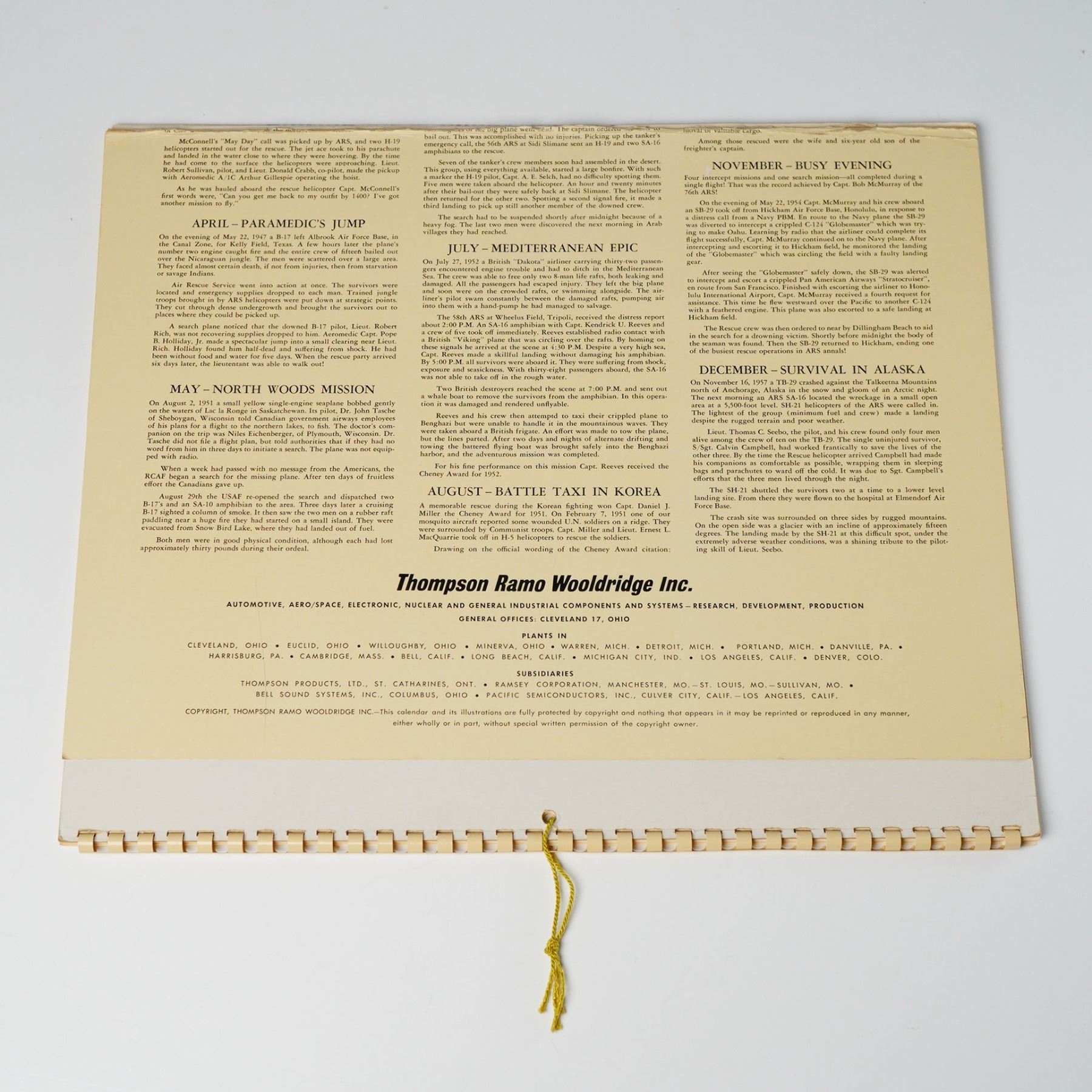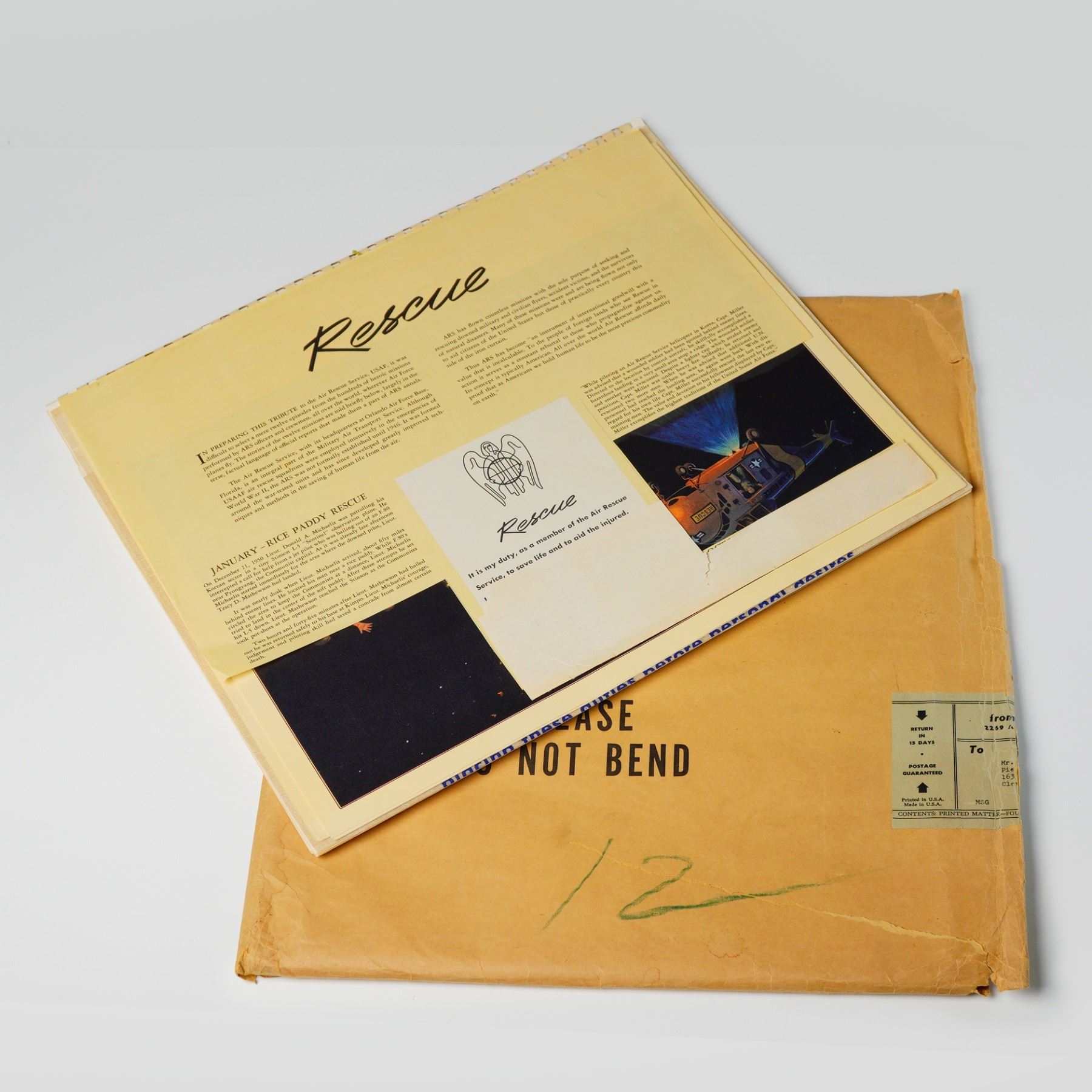 A large-format portfolio of U.S. Air Rescue Service illustrations by Thompson Ramo Wooldridge Inc., circa 1958. Includes prints such as BATTLE TAXI IN KOREA and DESERT SEARCH. Includes original mailing envelope.