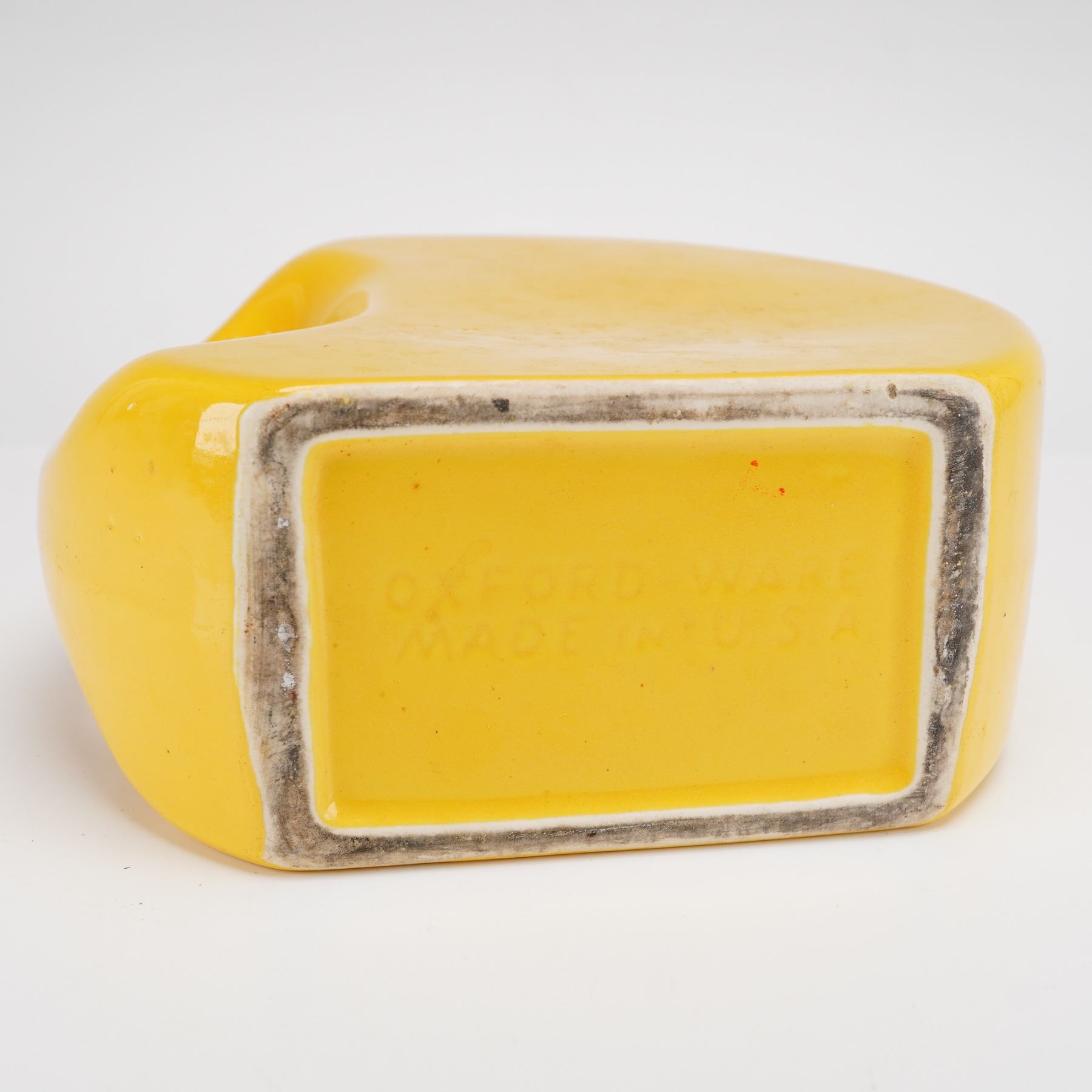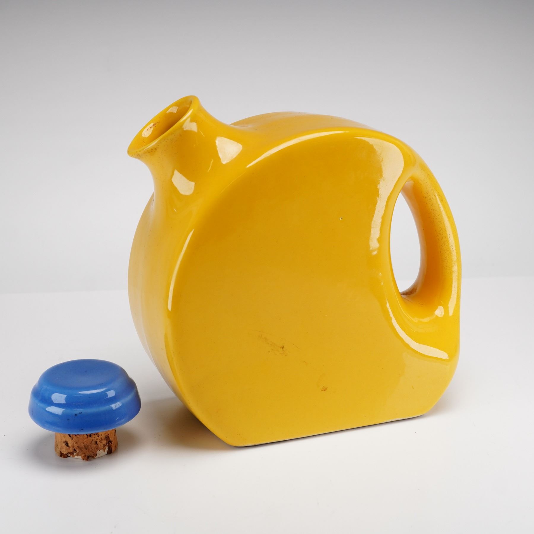 This vintage Oxford-Ware refrigerator jug, manufactured by Universal Pottery Co., features a mid-century modern disk-shaped design in a solid yellow glaze. The pitcher is made of Oxfordware and includes its original contrasting blue-glazed stopper. The piece is designed with an integrated circular handle and an angled pour spout for space-saving refrigerator storage. The base is marked Oxford-Ware Made in U.S.A.