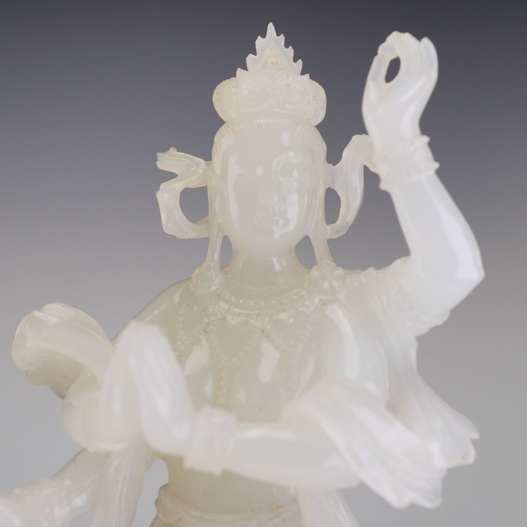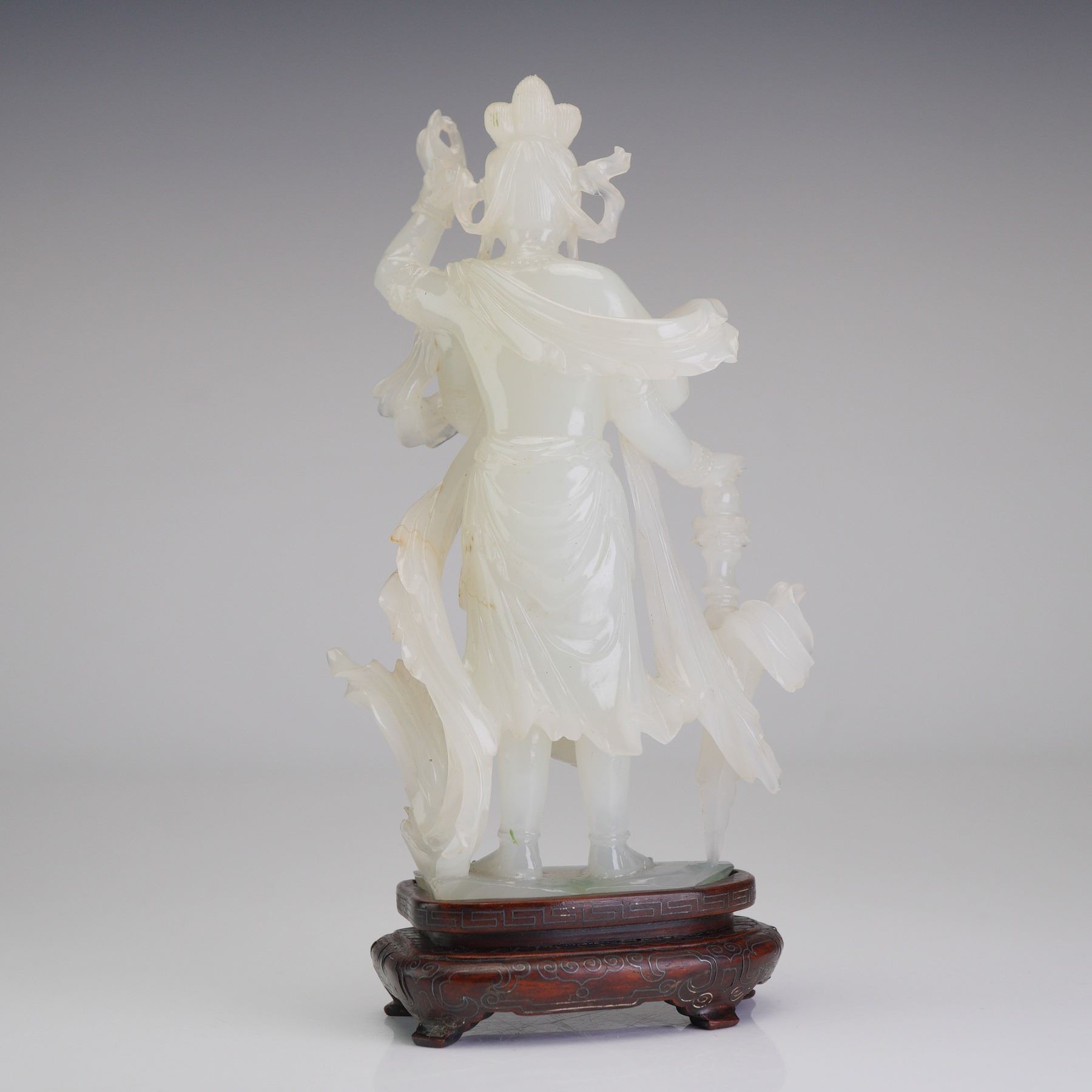 The deity is depicted in a graceful posture upon a rocky base. The primary pair of hands is held in a mudra at the chest, while the secondary pair is raised, with one hand holding a mala and the other a lotus sprig. This carved stone Buddhist figurine is skillfully rendered from a single piece of semi-translucent jade-like of an even pale white tone. The carving features extensive undercutting and piercing to define the billowing celestial ribbons and multilayered robes. The figure is adorned with an elaborate foliate crown, beaded necklaces, and bangles. The dark hardwood stand is intricately carved with ruyi-head scrolls, cloud scrolls, and a key-fret border.