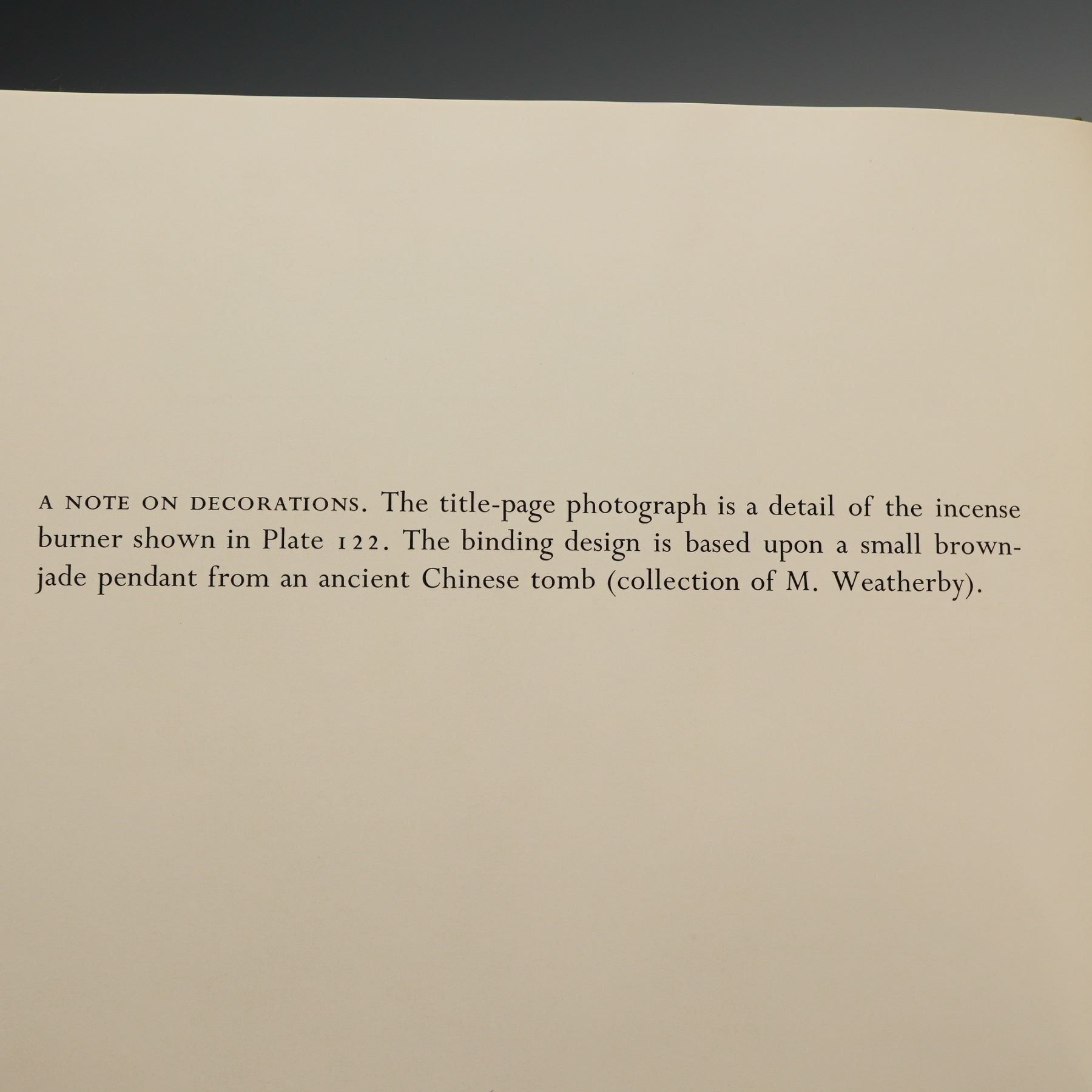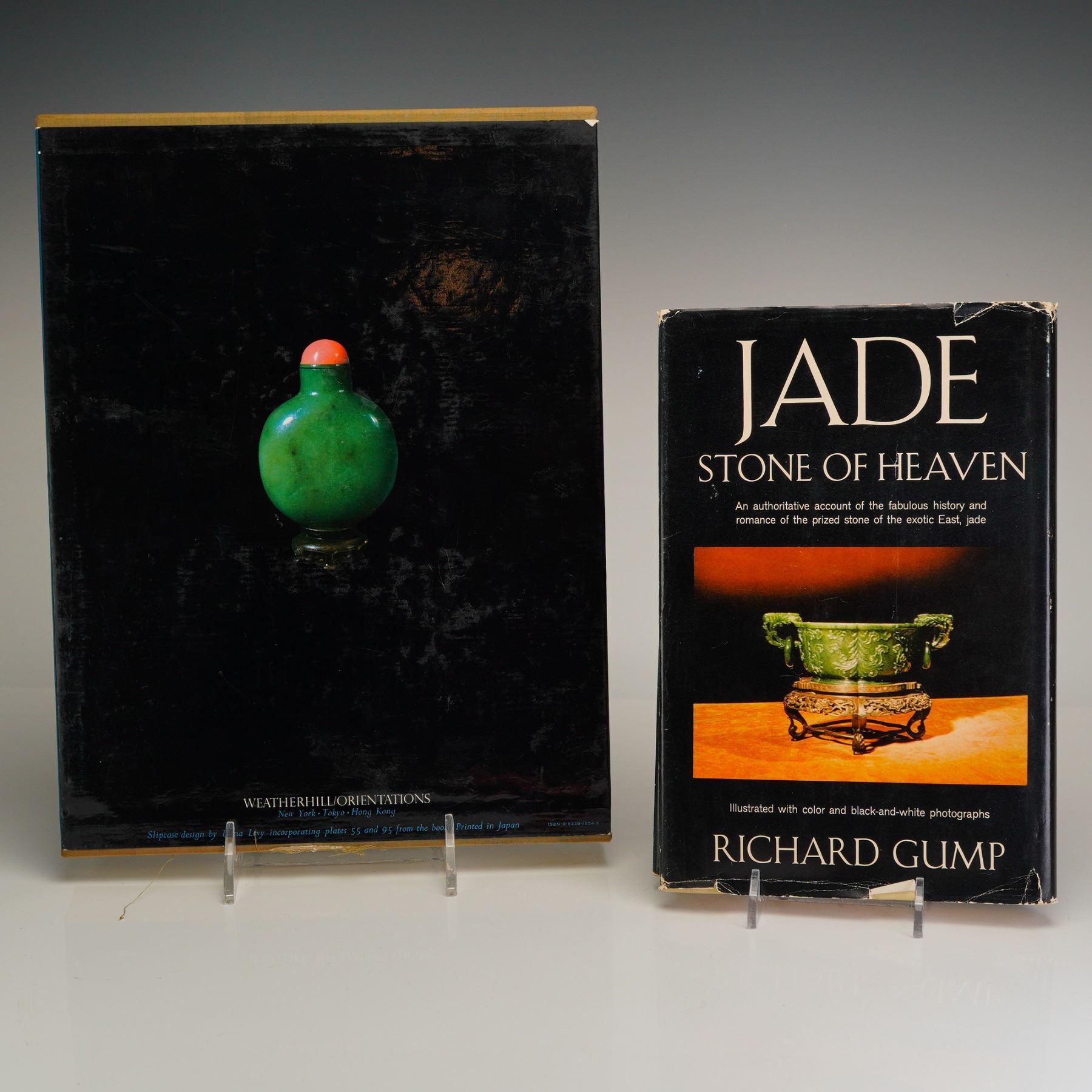 Wills, Geoffrey. Jade of the East. New York, Tokyo, Hong Kong: Weatherhill/Orientations, 1972. First Edition. Quarto. Publisher's olive green cloth with a tonal green design on the upper board based on a small brown-jade pendant from an ancient Chinese tomb (collection of M. Weatherby). Housed in the original pictorial slipcase with design by Hana Levy incorporating plates 55 and 95 from the text. 196 pages. Extensively illustrated with color and black-and-white plates, including a title-page photograph detailing the incense burner shown in Plate 122. Printed in Japan. ISBN: 0-8348-1854-1. The second book; Gump, Richard. Jade: Stone of Heaven. Garden City, NY: Doubleday & Company, 1962. First Edition. Octavo. Publisher's hardcover in original black pictorial dust jacket. 260 pages. An authoritative account of the history and artistry of jade, illustrated with color and black-and-white photographs.