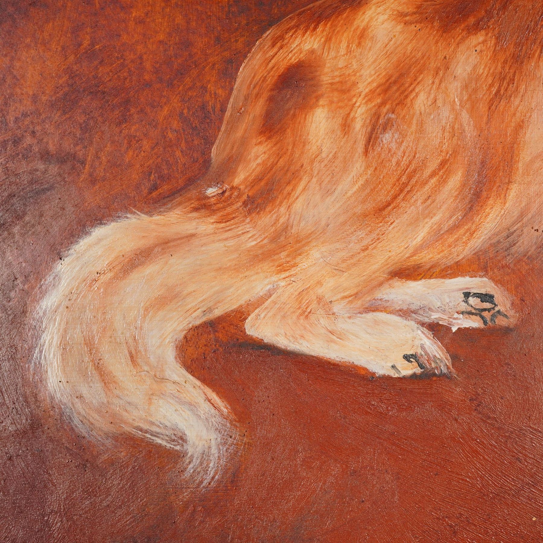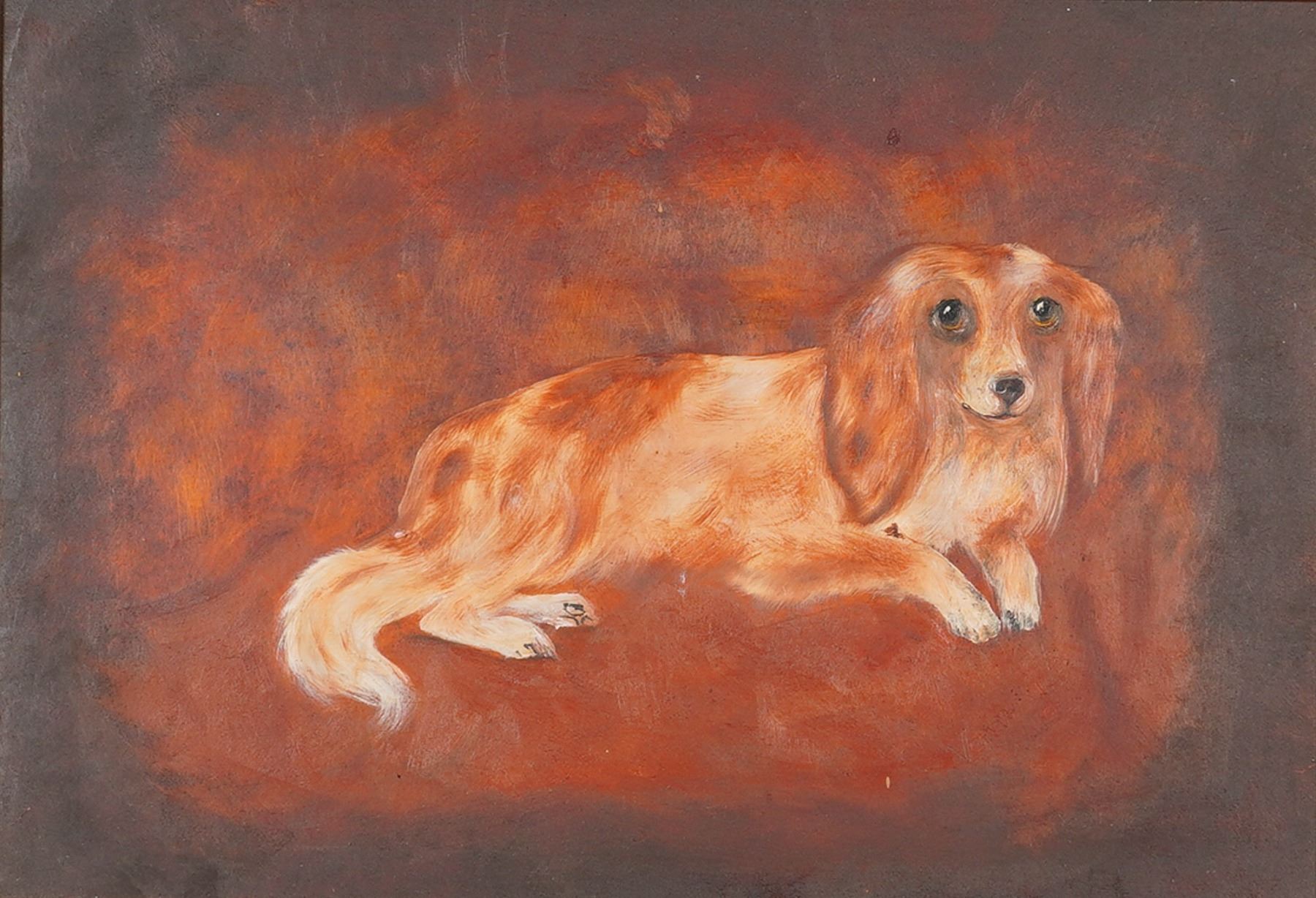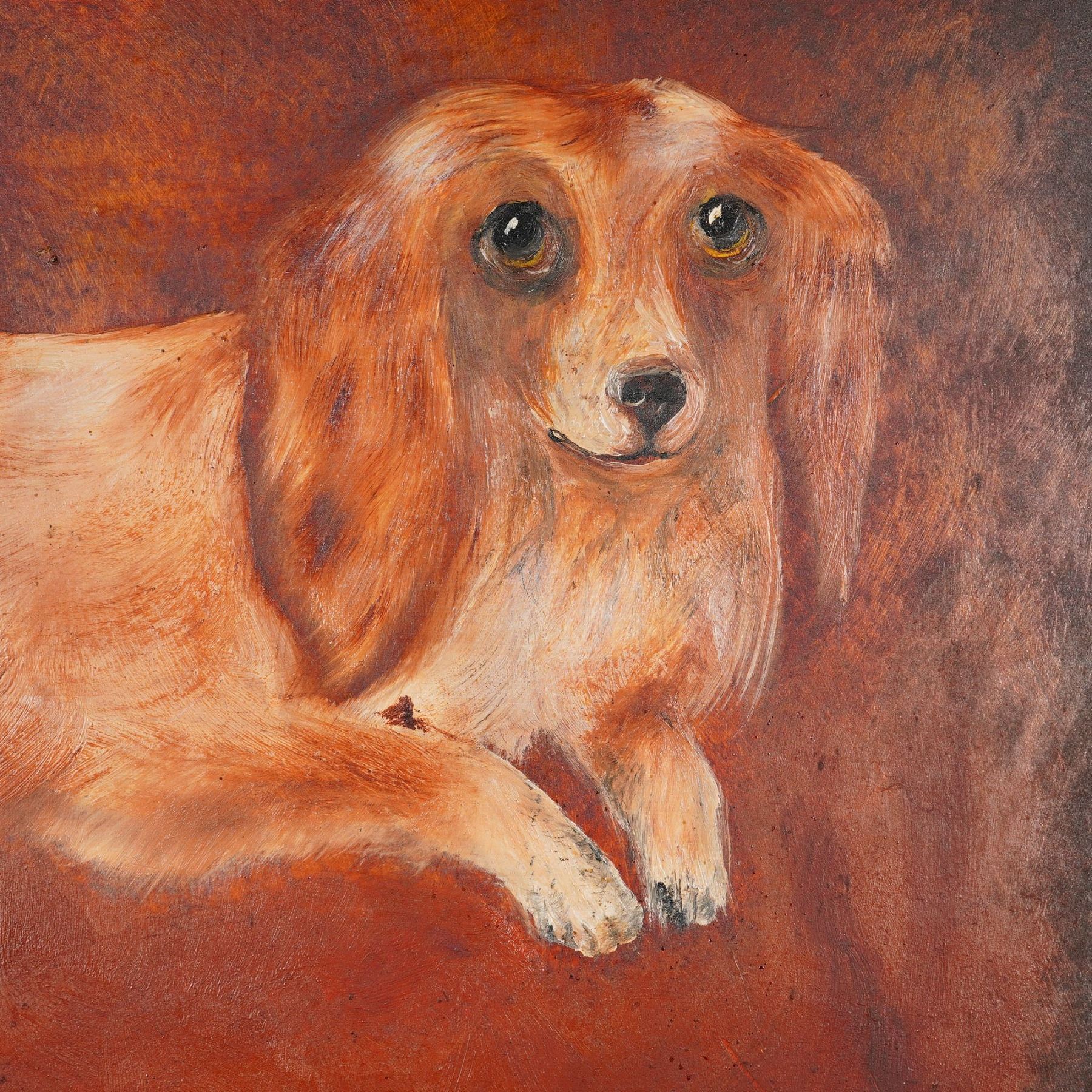 Lot 23 A Framed Folk Art Oil on Panel Portrait of a Long-Haired Dachshund