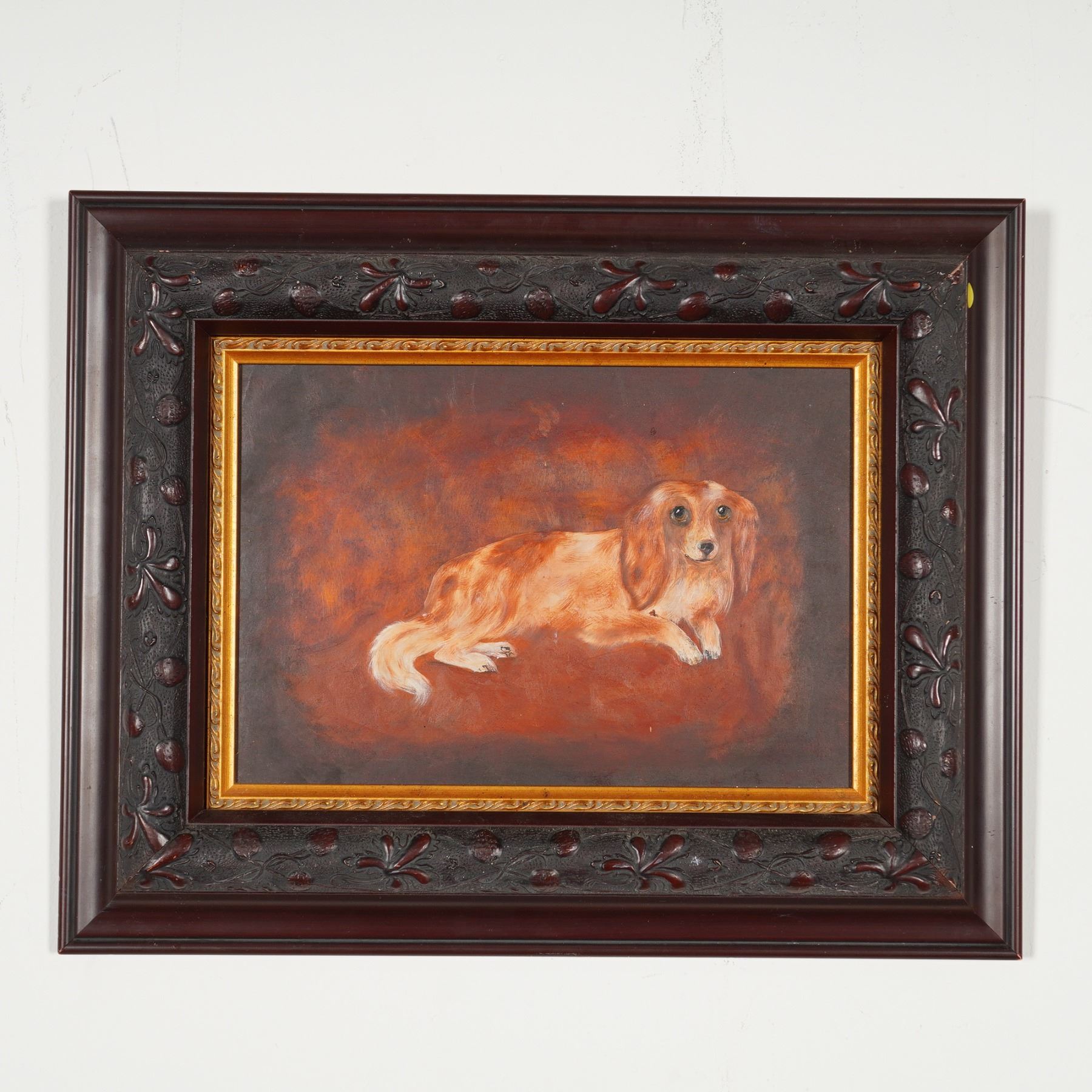 A folk art painting executed in oil on panel depicting a reclining long-haired dog, identified as a dachshund. The work is rendered in a naive style featuring textured brushwork and prominent, expressive eyes. The subject is positioned against a mottled reddish-brown background. The painting is housed in an ornate, dark-stained wooden frame characterized by deep-relief carvings of floral and foliate motifs and a thin gilded inner slip. No signature or maker marks are visible on the front of the panel.