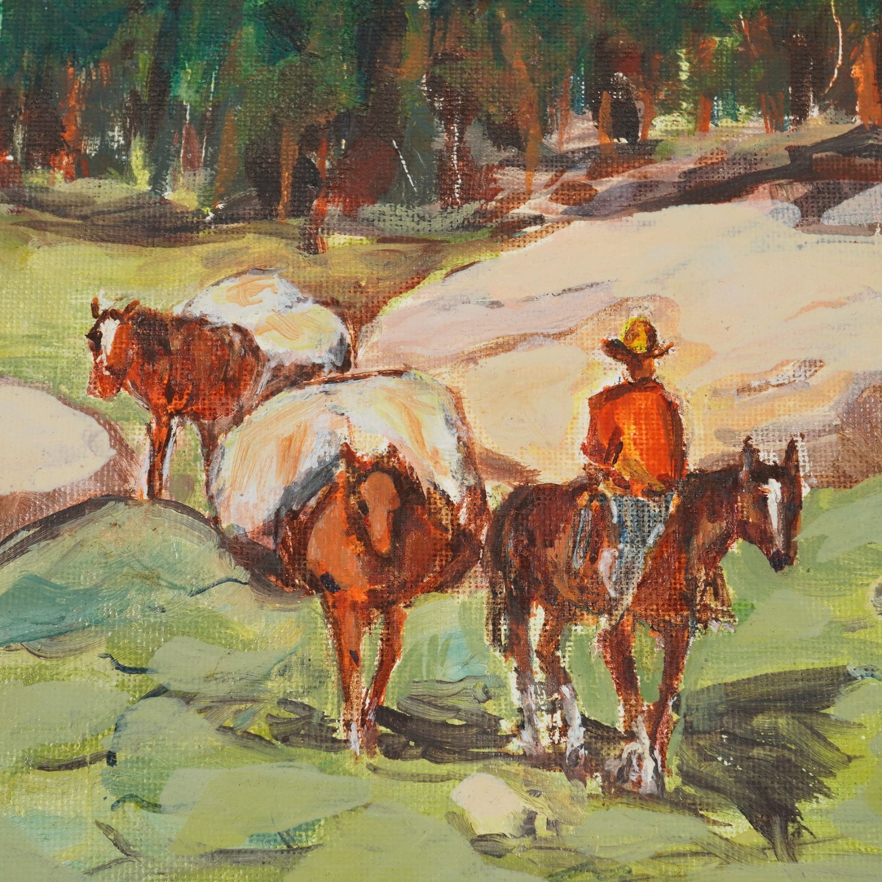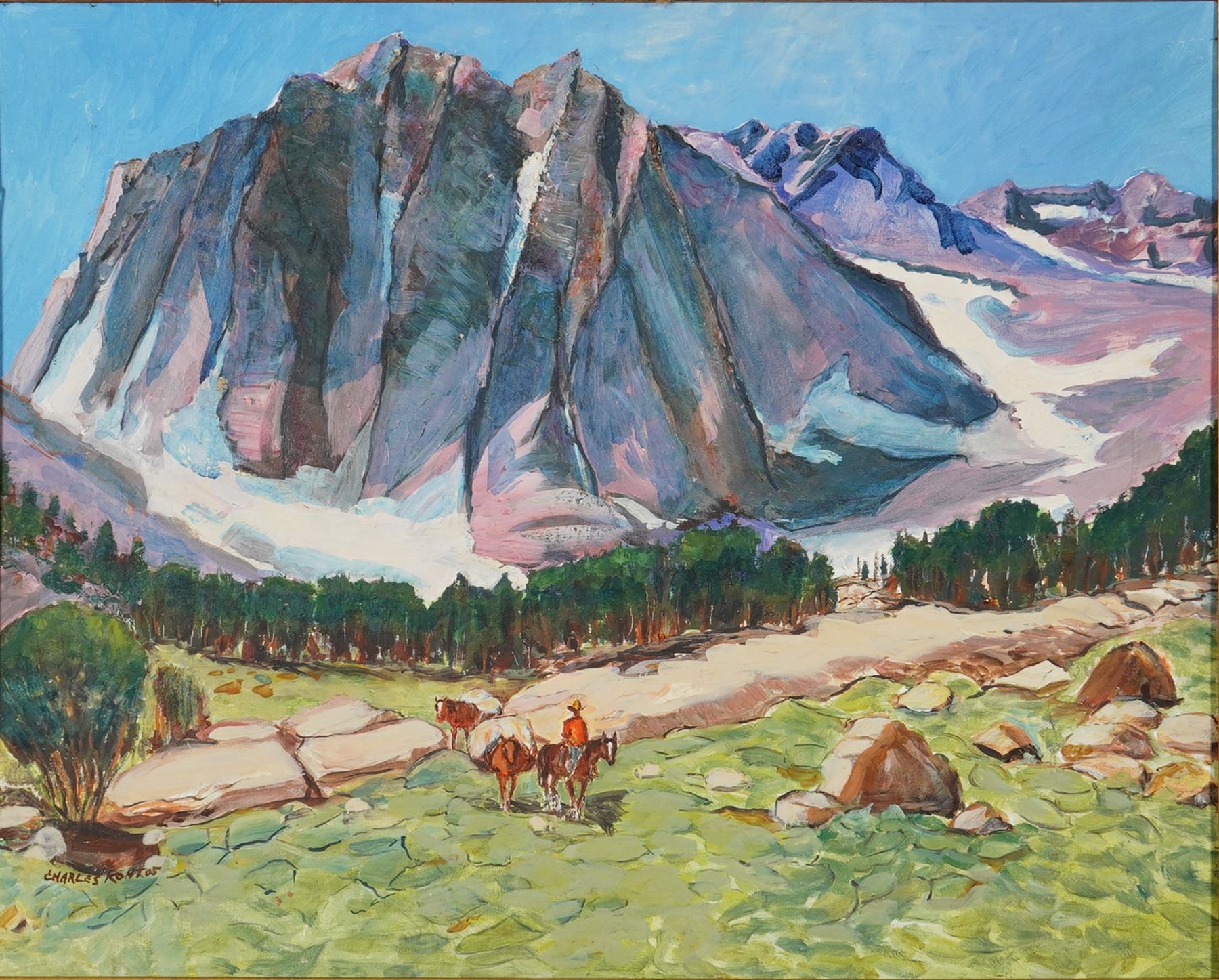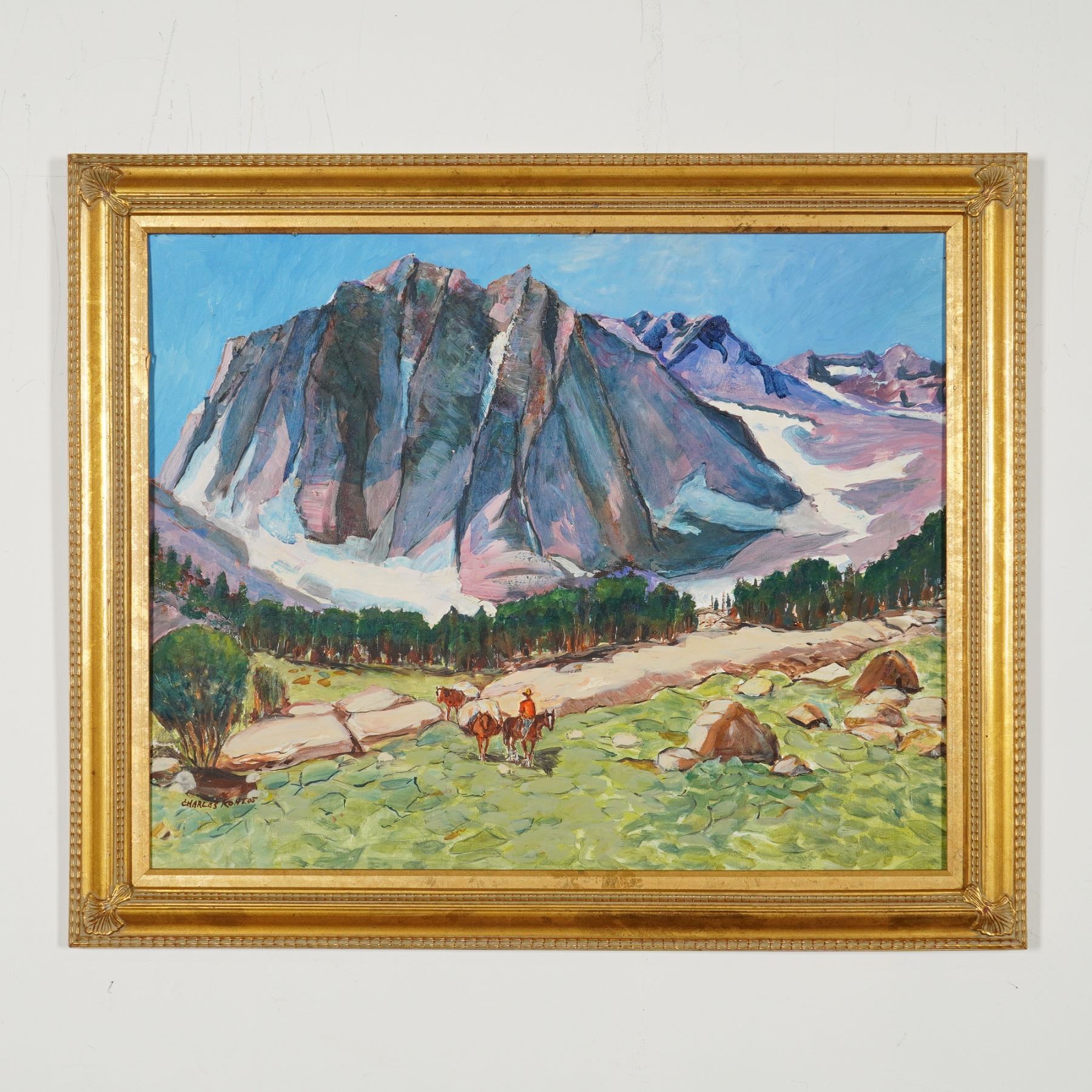 This oil on board painting depicts a Western mountain landscape featuring a craggy mountain peak with snow fields situated behind a line of evergreen trees. In the foreground, a figure on horseback leads two pack animals through a rocky and grassy terrain. The work is executed with visible brushstrokes and impasto. The painting is presented in a gilt-finished wooden frame with decorative corner motifs. Signed Charles Kontos in the lower-left corner.