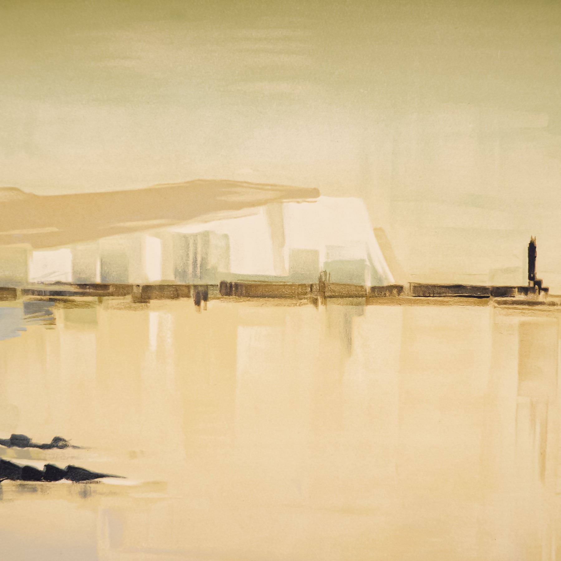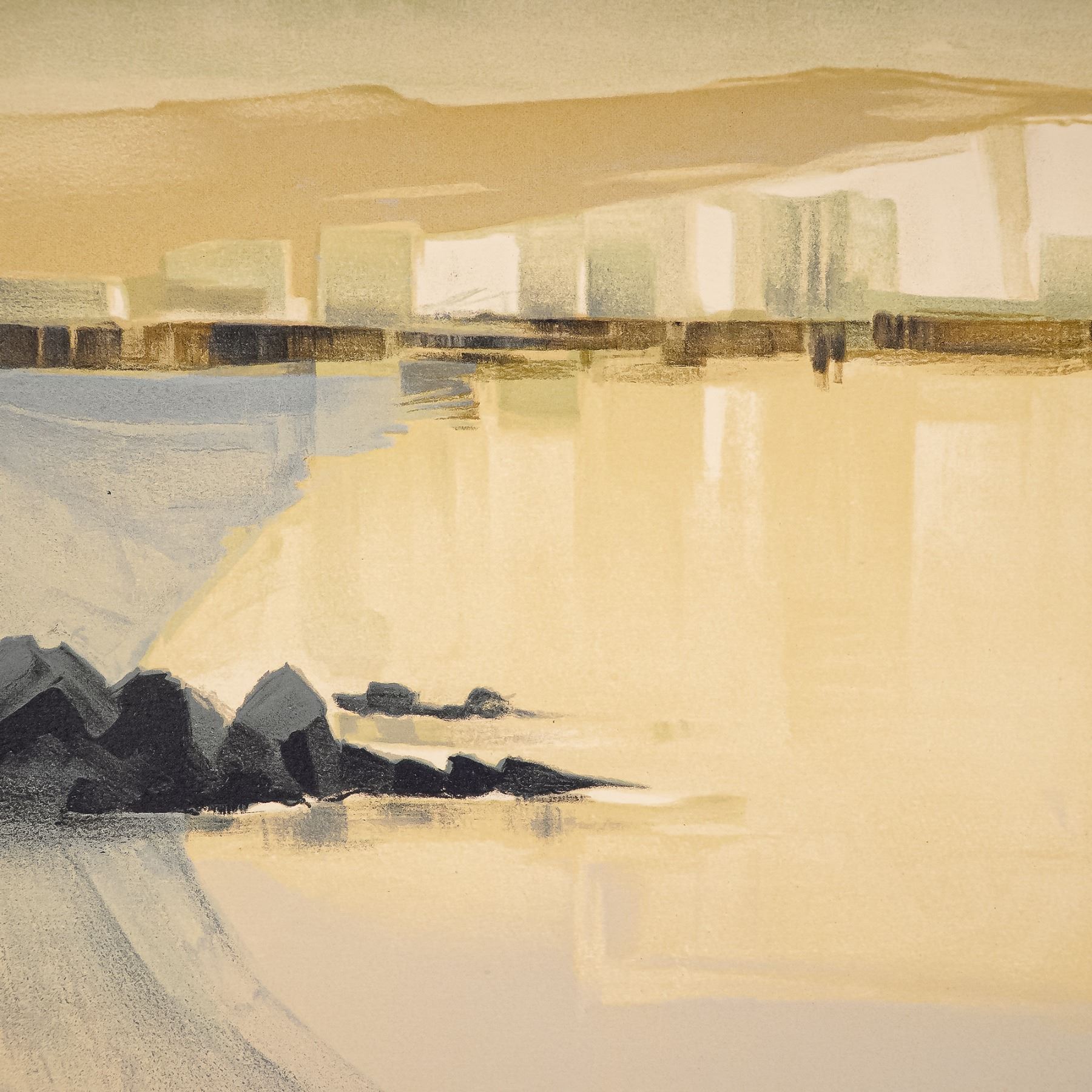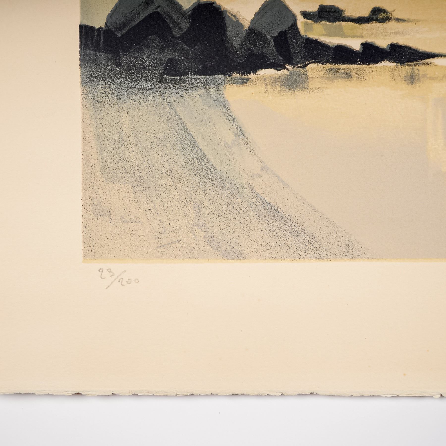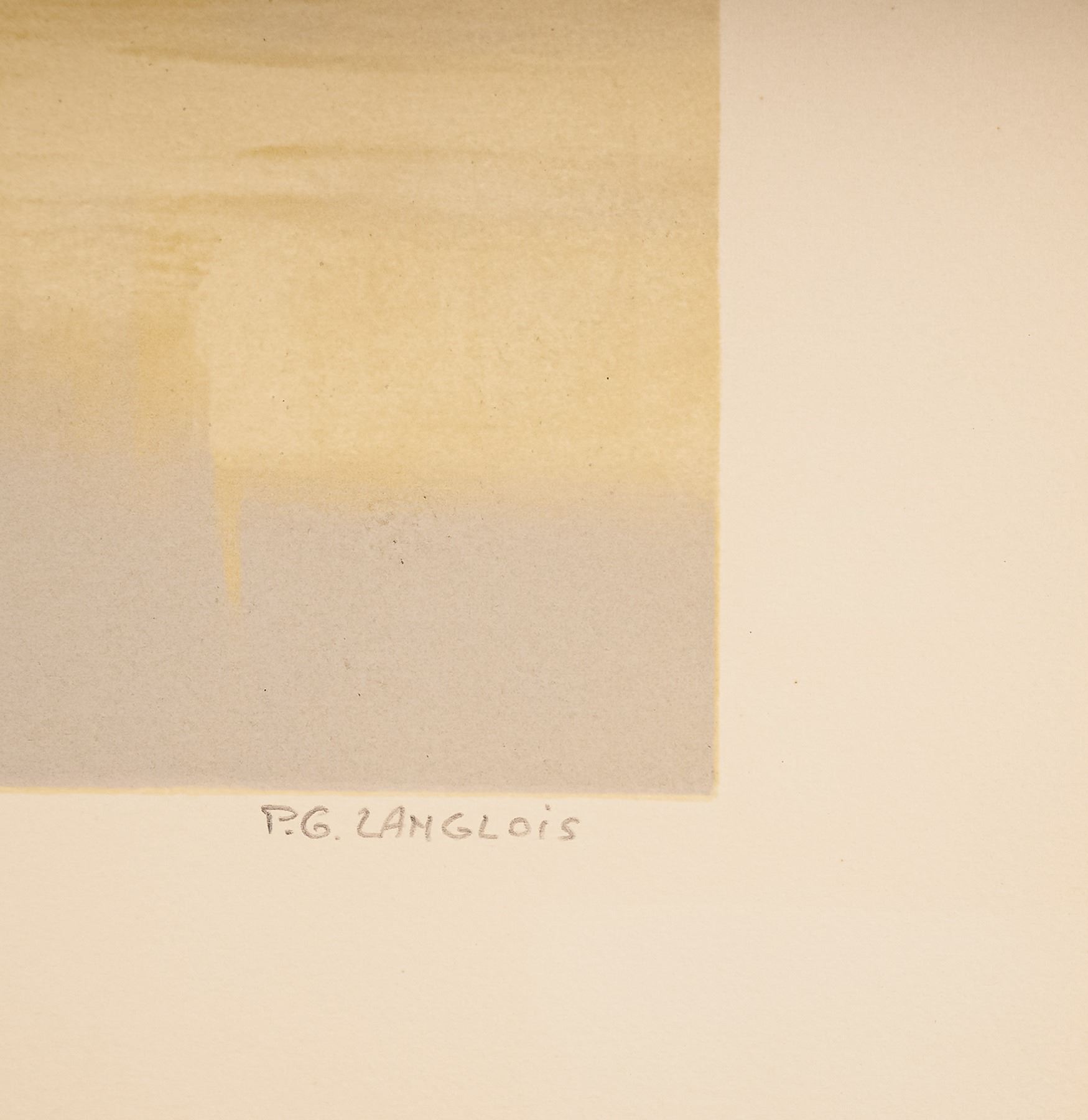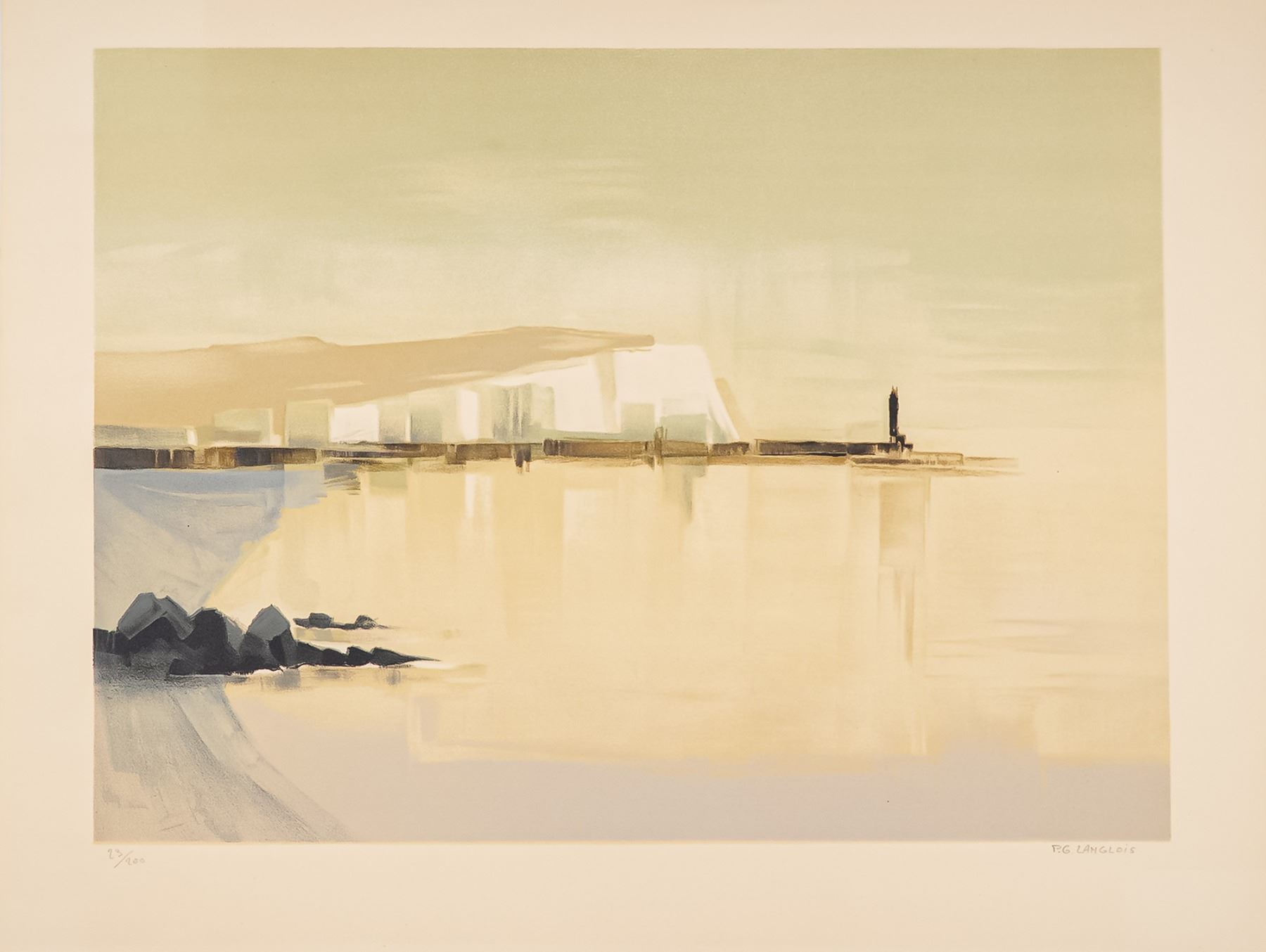 French artist Pierre Gerard Langlois's atmospheric lithograph on paper, coastal scene, captures Langlois' mastery of light and reflection, blending abstract tonal fields with recognizable elements of shoreline and architecture. The subtle gradations of color and geometric forms evoke both serenity and modernity, hallmarks of Langlois' refined style. A limited edition work that highlights his contribution to 20th-century French printmaking, this work is numbered 23/200 and signed in pencil by the artist on lower right.