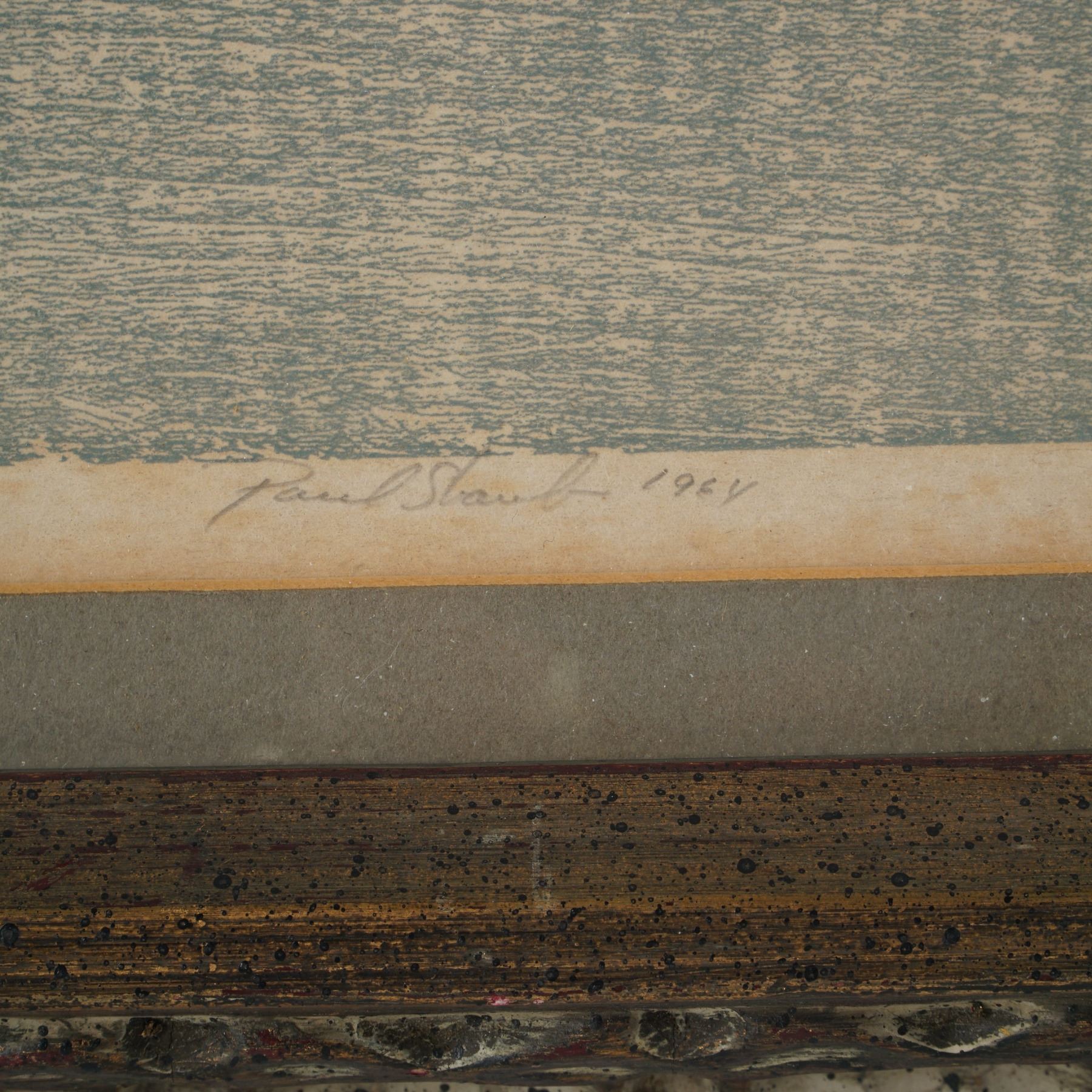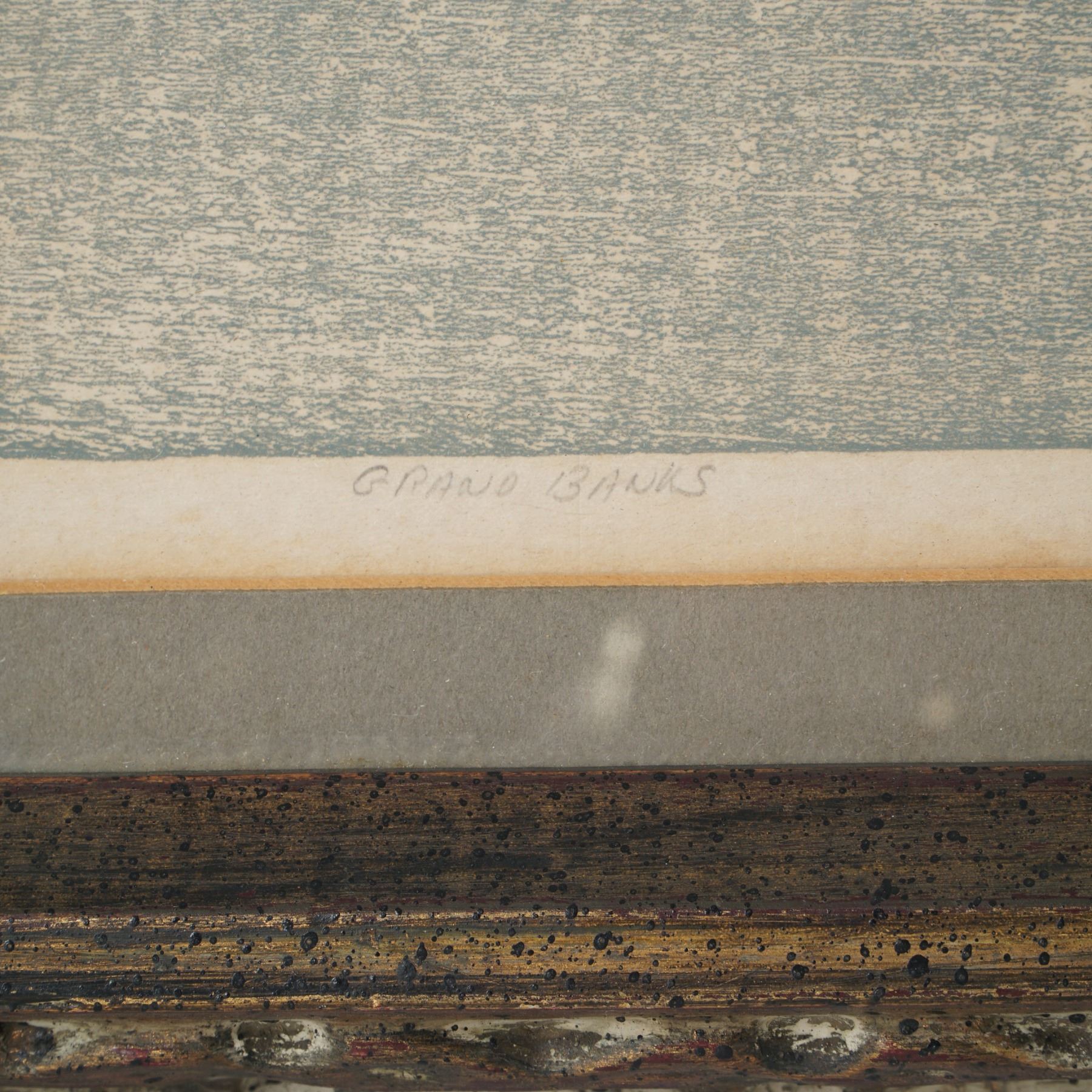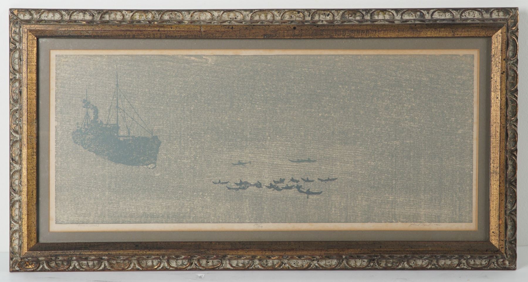Framed woodblock print titled Grand Banks by Paul Staub, dated 1964. This serene maritime composition depicts a large fishing schooner on the left and a cluster of dories scattered across calm waters to the right, evoking the traditional Grand Banks fishing fleets. Executed in soft blue and cream tones, the textured surface and minimalist details convey a quiet, reflective atmosphere. The print is pencil signed "Paul Staub 1964" at lower right, titled at center, and numbered 10/210 at lower left. Housed in an ornate carved wood frame with a distressed gilded and whitewashed finish and double matting.