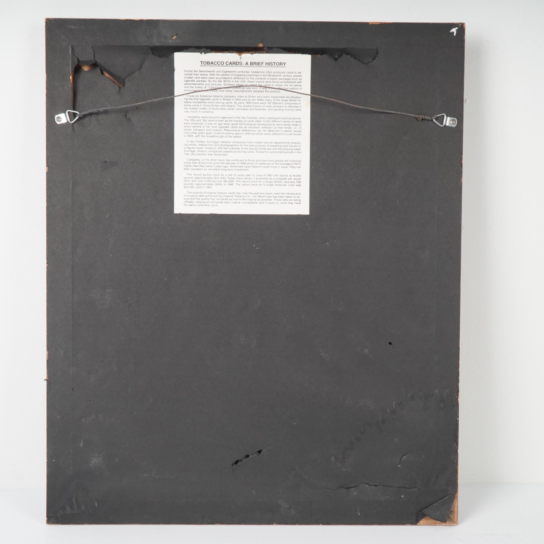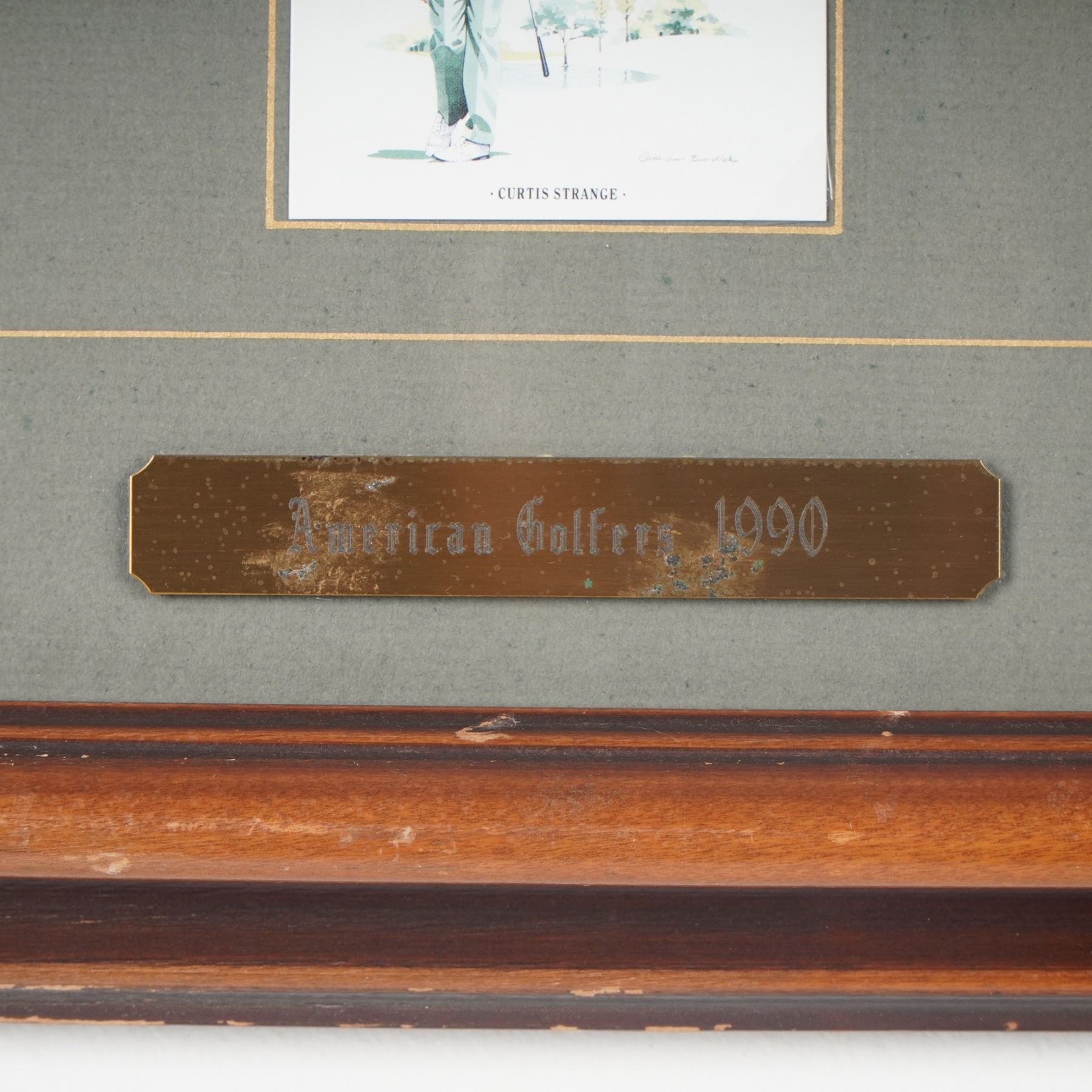 Framed set of eleven color illustrations titled American Golfers 1990 by Scottish artist Graeme Baxter, known for his golf-themed artworks. This set features notable professional golfers including Jack Nicklaus, Curtis Strange, Scott Hoch, Mark O'Meara, Craig Stadler, and others. Each player is depicted in a portrait and action pose, arranged on a green mat board with gold accent trim. Accompanied on the reverse by a printed history of tobacco cards, underscoring the collectible appeal of such sports illustrations. Displayed in a dark wood frame.