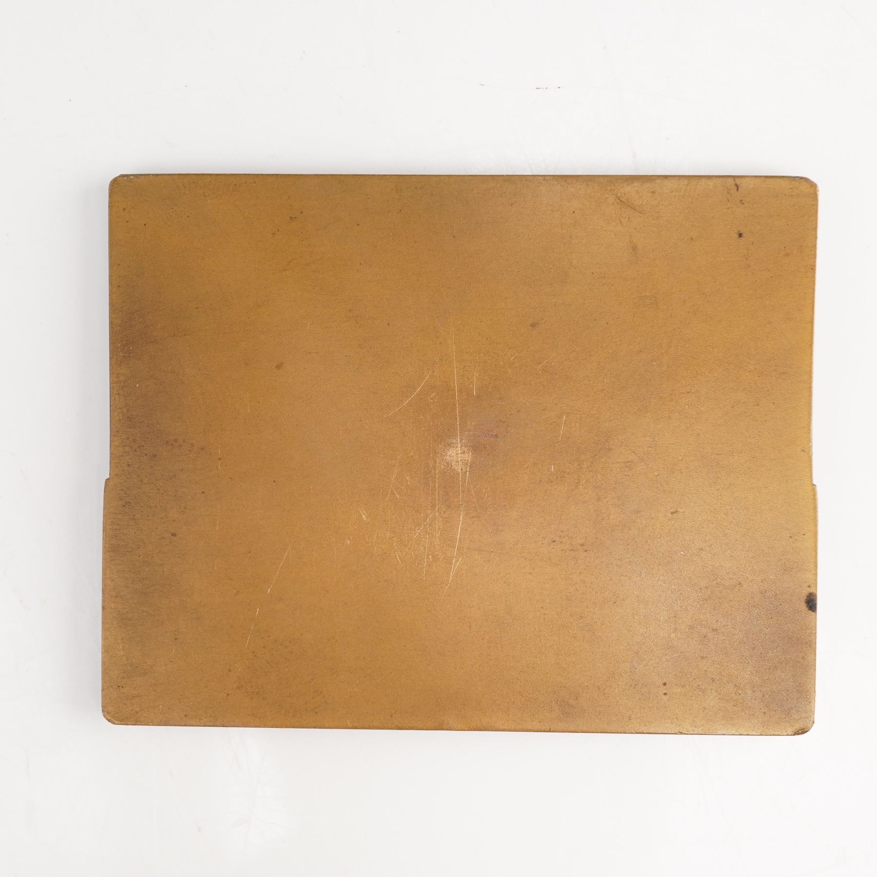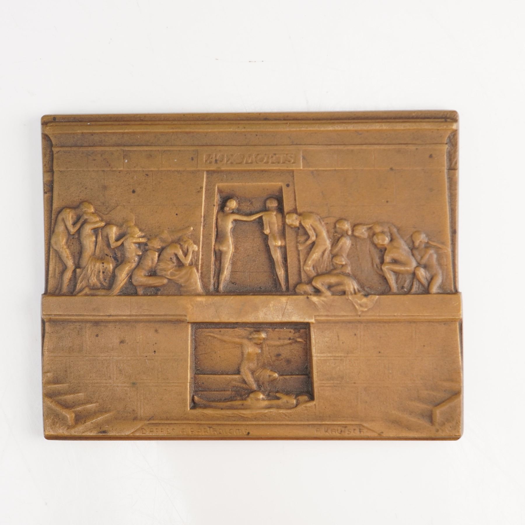 This bronze relief plaque was created by the medallist Alexander Kautsch (Austrian, 1867-1930) after the celebrated 1899 monument by Paul-Albert Bartholome (French, 1848-1928) located in the Pere Lachaise Cemetery in Paris. Executed in the Symbolist style, the work depicts a central doorway inscribed AUX MORTS toward which a group of mourning figures congregate in various expressive states of grief. A smaller recessed scene below shows a deceased couple in repose. The plaque is cast in bronze with a consistent golden-brown patina. It is inscribed along the lower edge D APRES A. BARTHOLOME to the left and signed A. KAUTSCH to the right. There are no visible foundry marks or edition numbers. The plaque is self-contained without a separate base or plinth. 3.15 x 4.33 x 0.20 inches.