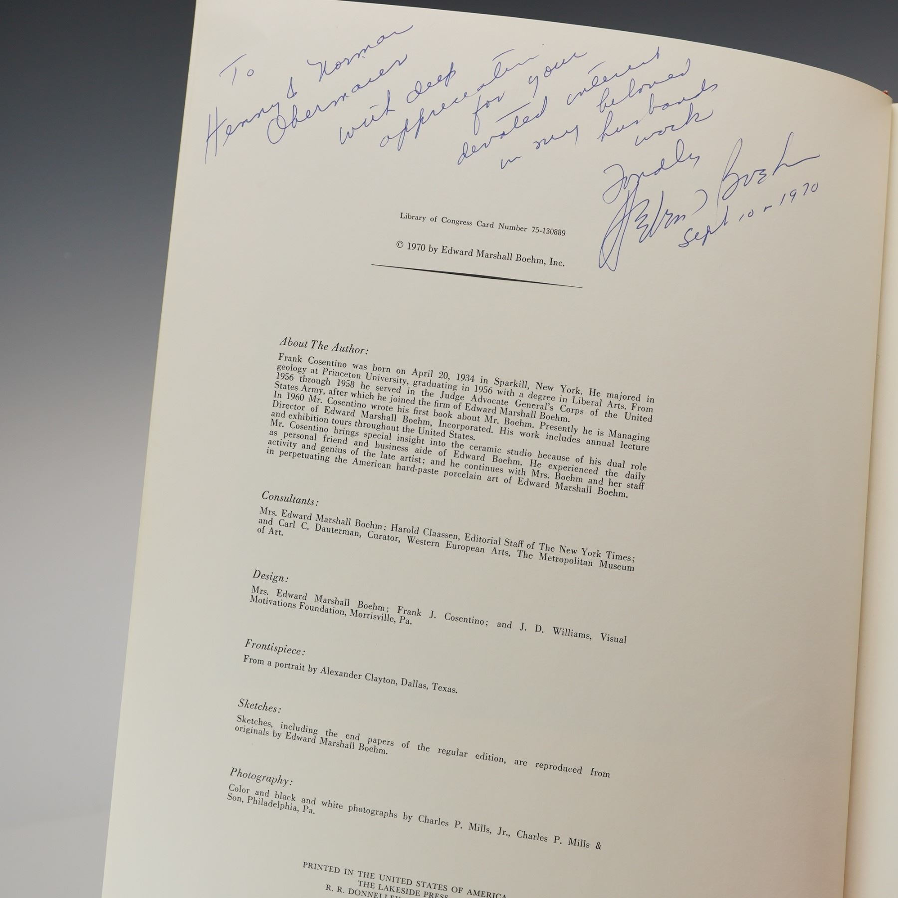 Lot 48 First Edition Frank J. Cosentino Book, Edward Marshall Boehm, 1913-1969, Helen Boehm Signed and Insc