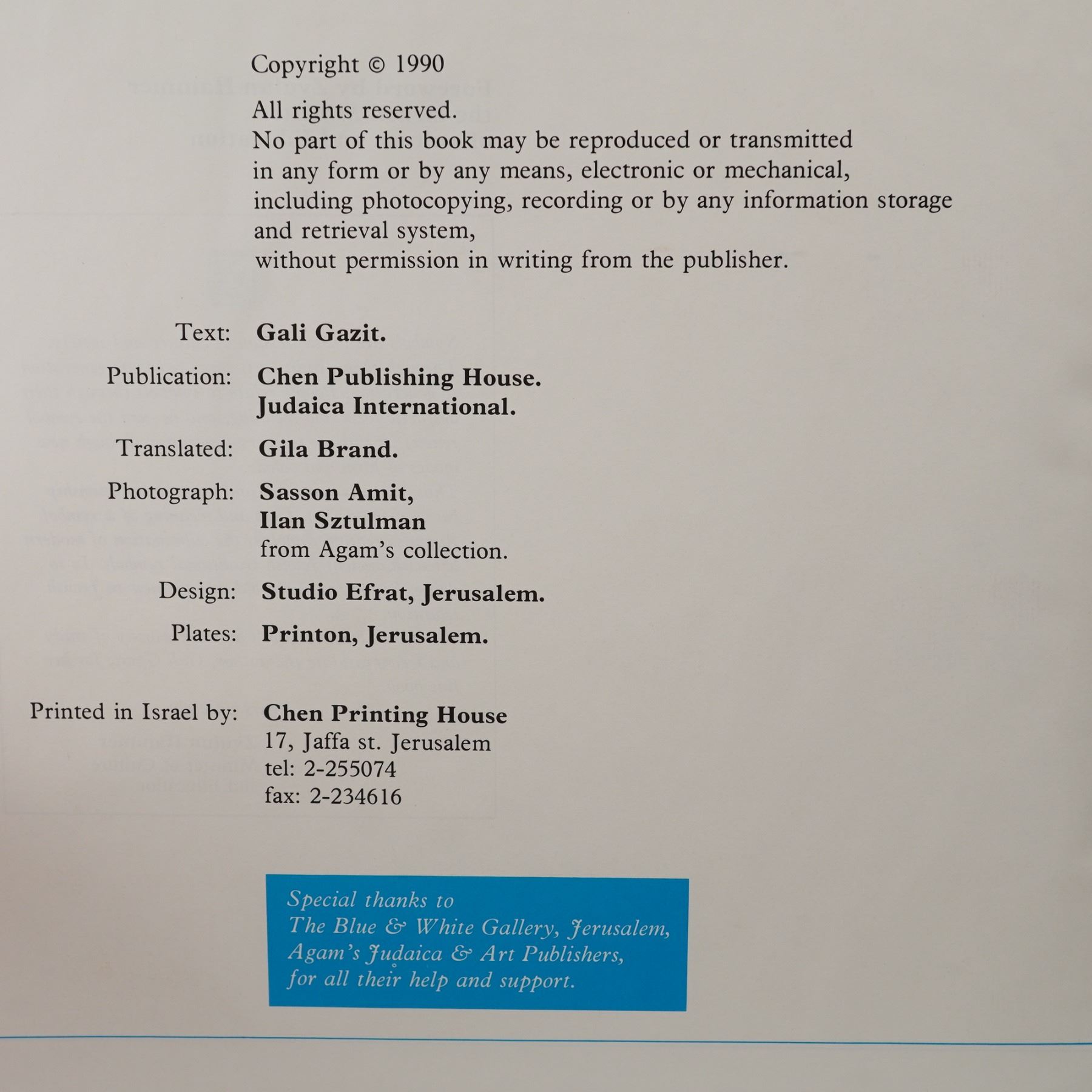 Jewish Motifs in the Work of Agam by Gali Gazit, published by Chen Publishing House, 1990. This hardcover book, with 75 pages, explores the Jewish motifs present in the works of Israeli artist Yaacov Agam. The book features full-color images of his works, highlighting the use of Jewish symbolism and themes within his art.