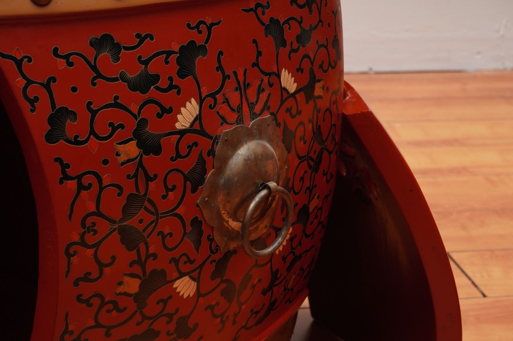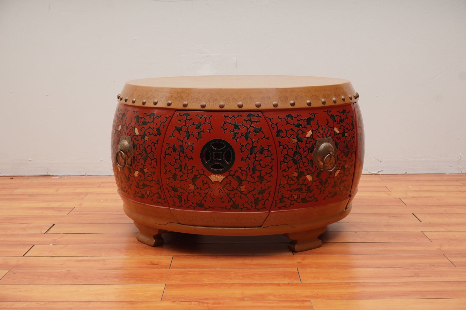 An Oriental red Coromandel drum coffee table set dating to the 1960s. This set includes one central drum-form coffee table, four matching stools, and four side panels designed to close the table openings completely, totaling nine pieces. The pieces feature a vibrant red lacquered finish decorated with intricate black, beige, and orange floral and foliate scrollwork. The flat circular tops are finished in a light tan color and feature finely detailed geometric and floral line-art patterns. The construction includes rows of metal nailhead bosses around the top perimeters and metal ring pull handles on the sides. The central table contains open compartments to store the stools and coverings for the openings. Measurement is for the table.