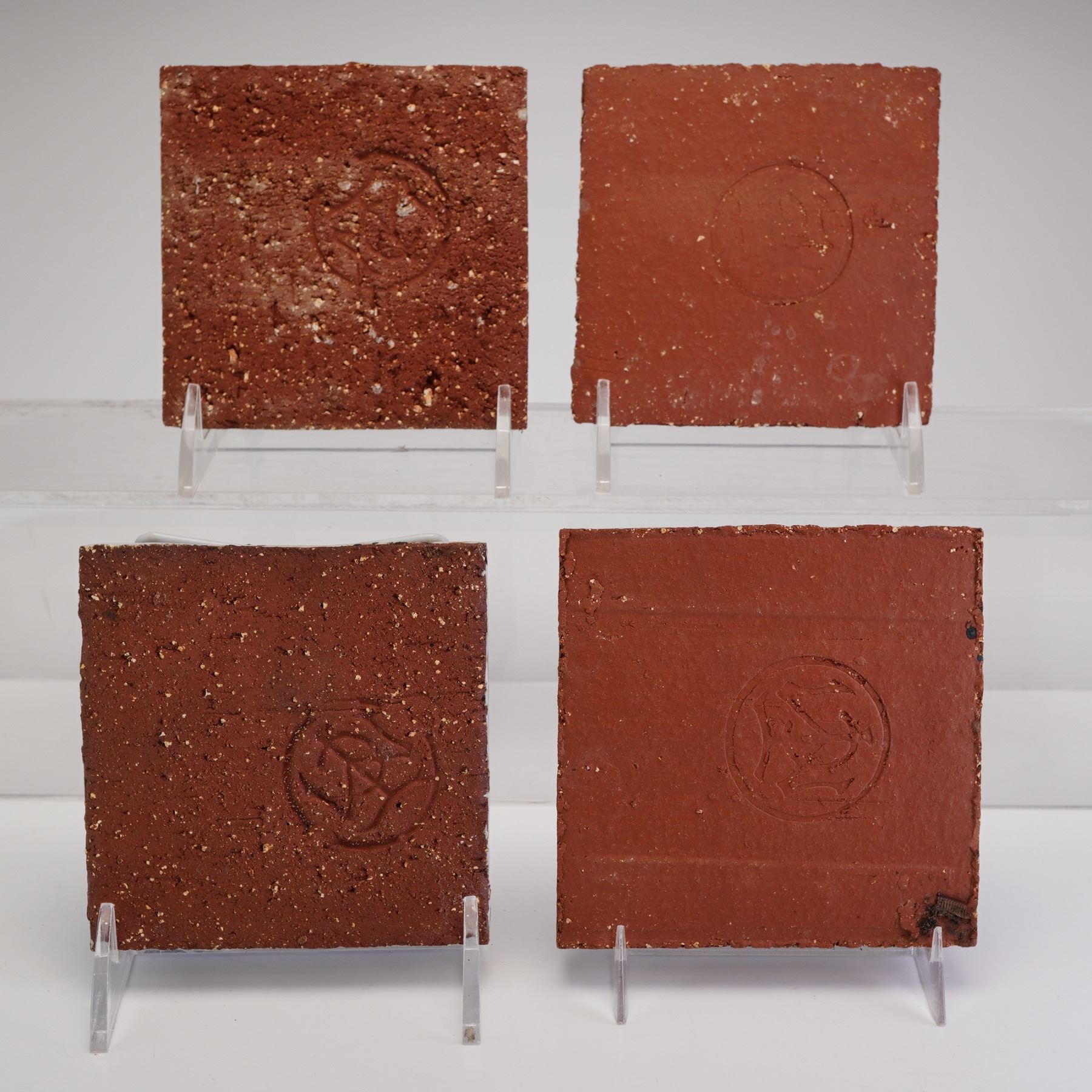 A set of Delft-inspired faience tiles manufactured by the Mosaic Tile Co. featuring a seaside cottage pattern. Each tile is constructed from a coarse-textured red earthenware body with a white glaze finish. The decoration is executed in blue and white transfer-print, depicting a rural coastal scene with a cottage and sailboats, framed by stylized foliate corner motifs in the Dutch tradition. The reverse of each tile bears the impressed circular manufacturer's mark of a stylized rose. Dimensions: 4.25 x 4.25 inches.