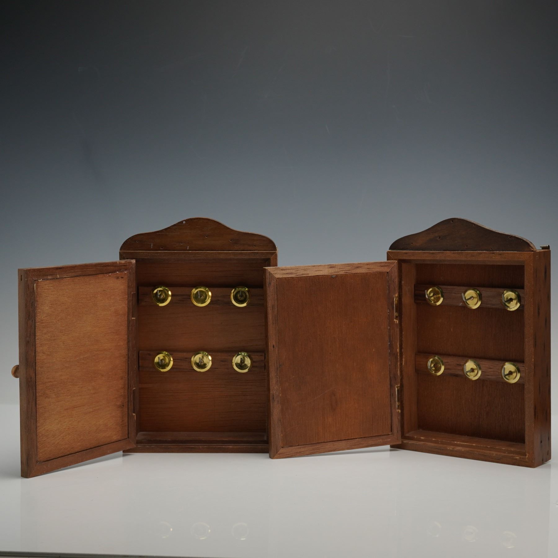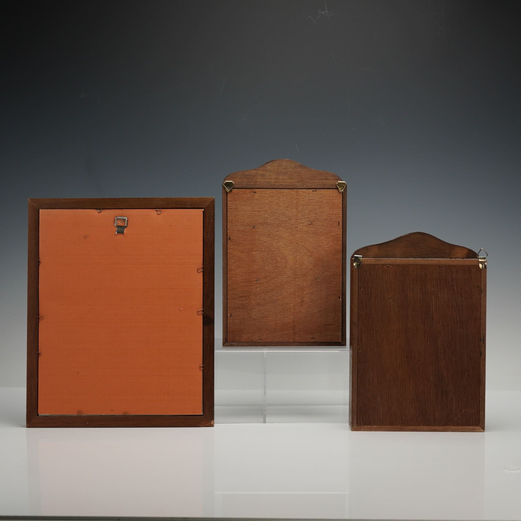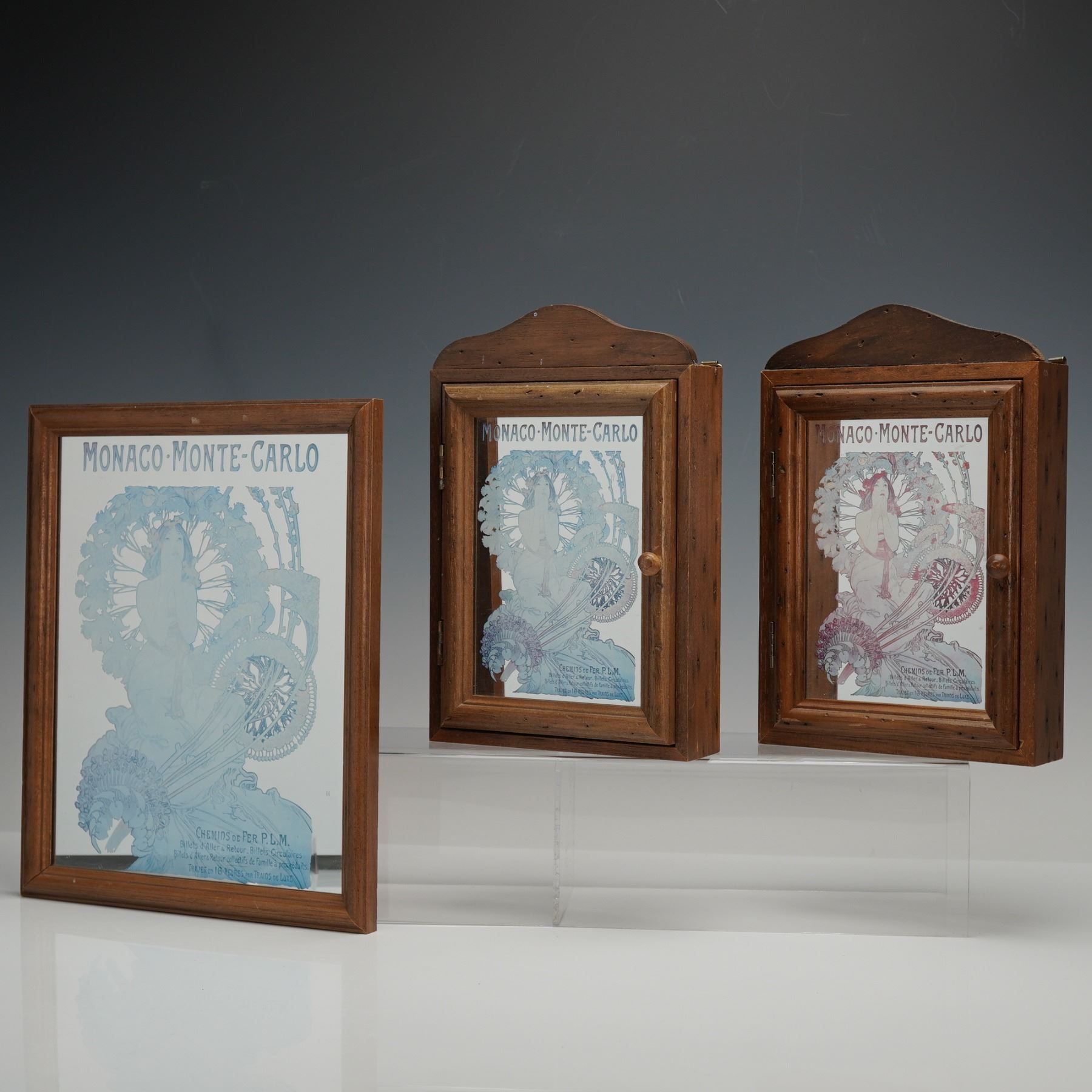 A group of two wall-mounted key cabinets and one wall mirror, each incorporating a mirror image of Alphonse Mucha's 1897 Art Nouveau poster "Monaco-Monte-Carlo," originally produced for the P.L.M. railway to publicize travel to the Mediterranean coast. The imagery presents a central female figure with surrounding floral motifs associated with the poster's representation of movement and location. The key cabinets open to interiors fitted with brass hooks for key storage, and the reverse sides include metal hangers for wall mounting.