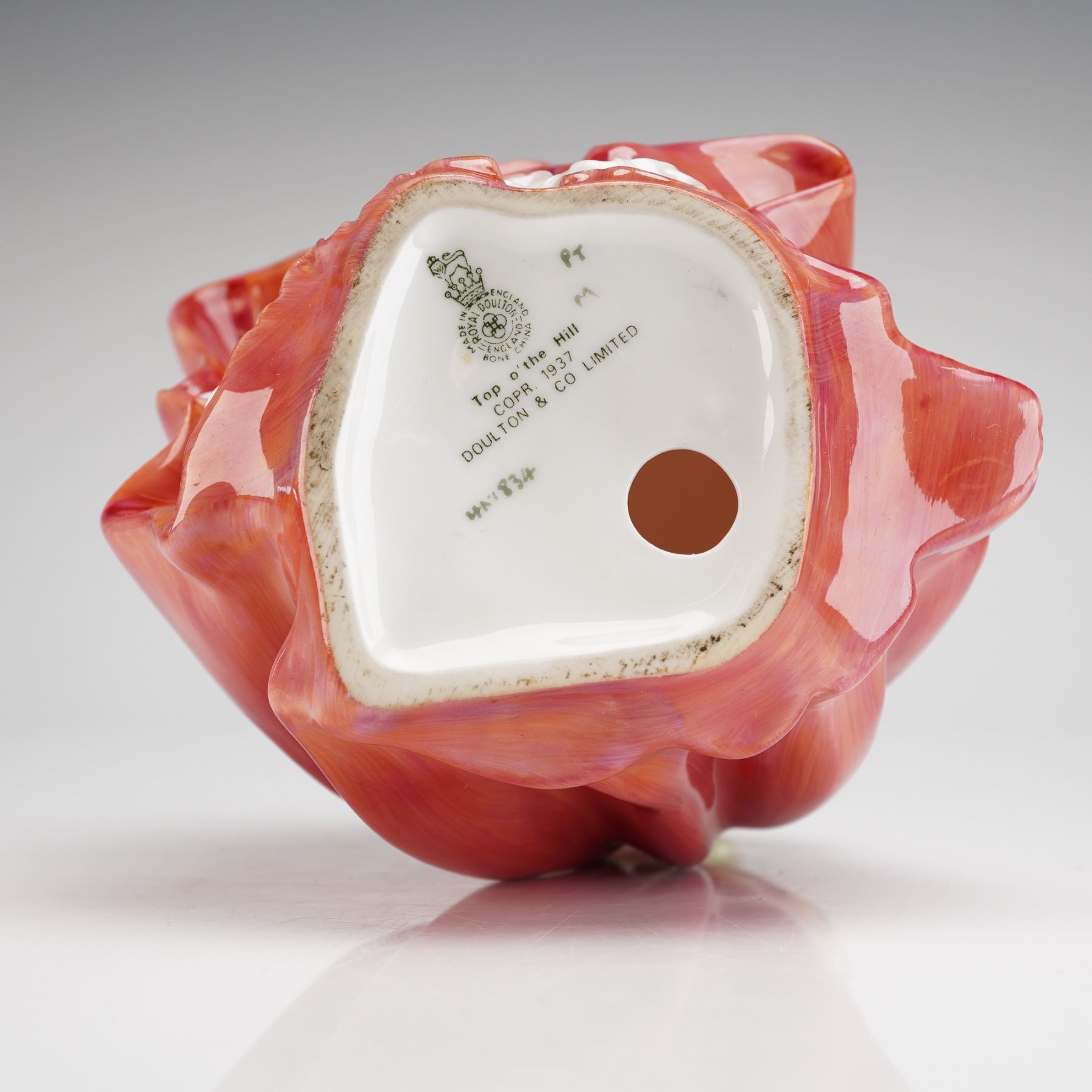 A single glazed bone china figurine manufactured by Royal Doulton, titled Top O' The Hill, model number HN 1834. The figurine depicts a woman in a formal, flowing gown primarily decorated in a glossy reddish-orange color, accented with cream and white detailing on the underskirt and bodice ruffle. She wears a wide-brimmed hat lined in light green. The underside of the figurine features the printed Royal Doulton crown mark, along with the inscriptions Top o' the Hill, COPR 1937, DOULTON & CO LIMITED, and the model number HN 1834.