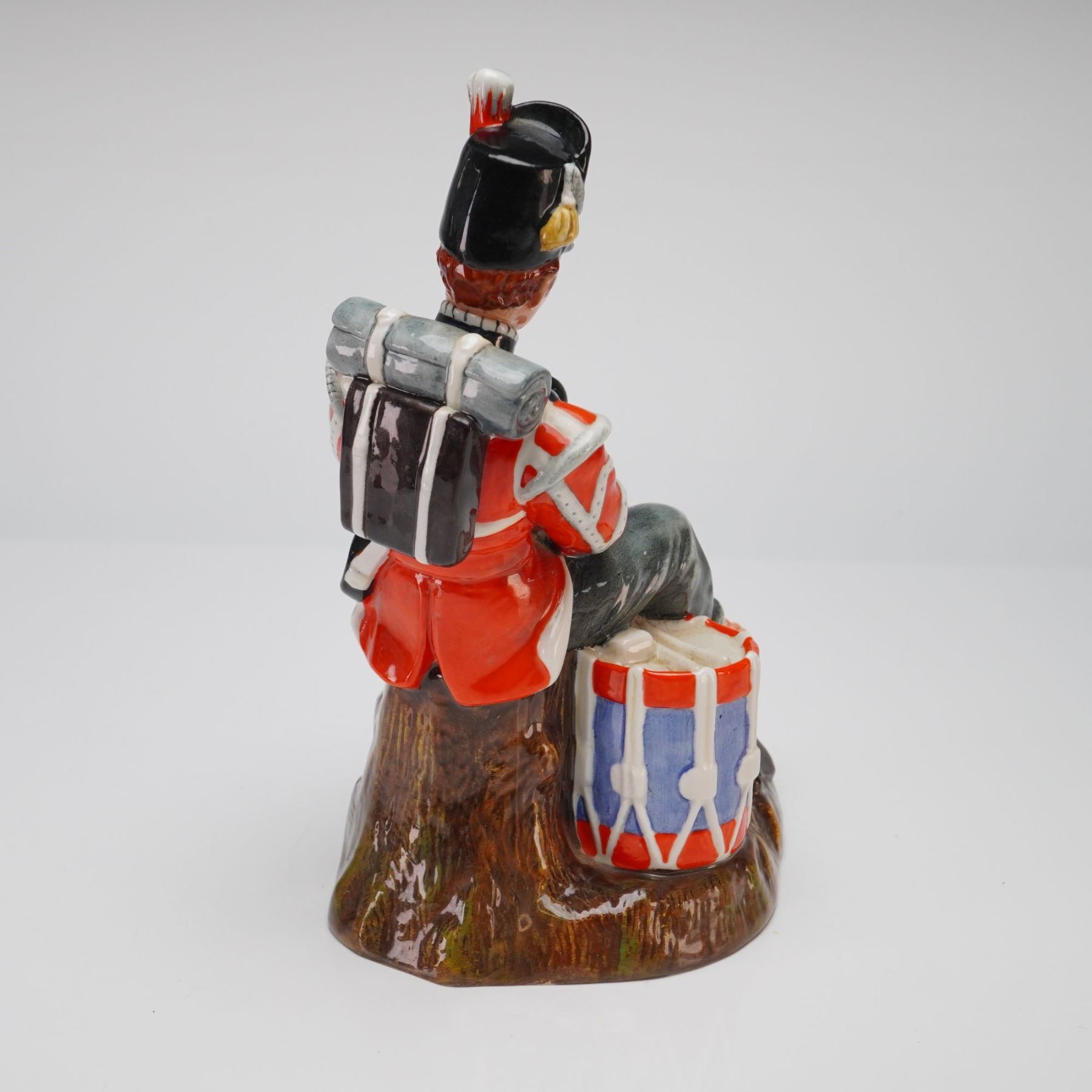 The figure is seated on a tree stump in a fatigue pose, inspecting a boot with one foot bare. The uniform features a red coat with white horizontal braid and shoulder wings, gray trousers, and a black stovepipe shako with a red-over-white plume. Equipment includes a side drum with blue and red hoops and a black knapsack with a rolled gray greatcoat. The underside features the green Royal Doulton backstamp.