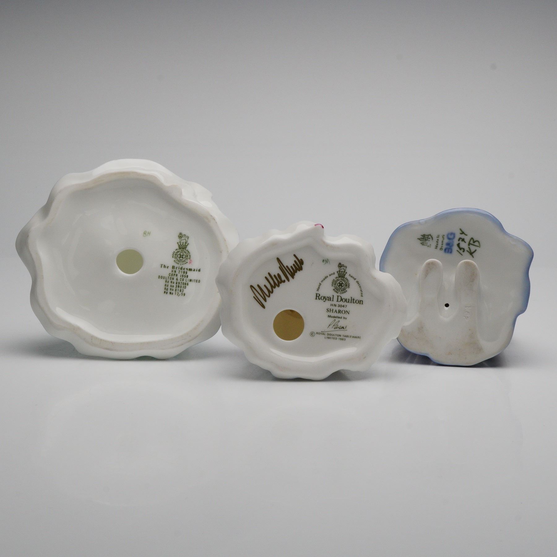 Offered is a 3-piece assortment of vintage porcelain figurines including Royal Doulton's The Bridesmaid HN2196 and Sharon HN2978, together with Bing & Grondahl's Else 1574. Each figure is crafted in fine glazed porcelain with detailed hand-painted decoration and carries its respective maker's mark on the base.