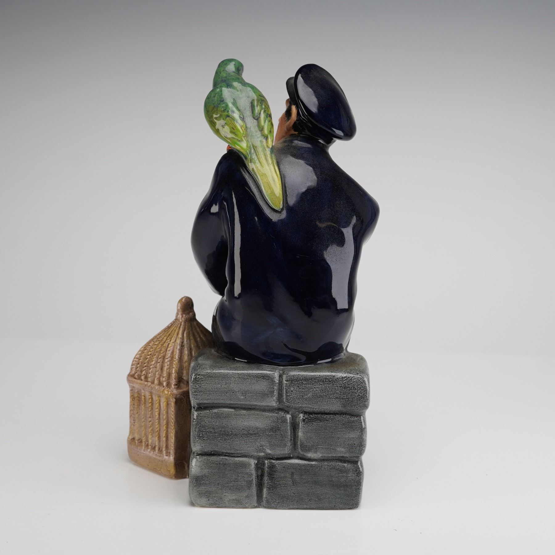 A single glazed porcelain figurine by Royal Doulton, titled "Shore Leave" and modeled as HN 2254. This figurine depicts a sailor in a deep navy blue uniform and cap, seated on a grey brick base, feeding a brightly colored parrot perched on his shoulder. The sailor is accompanied by a woven wicker-style birdcage and a brown satchel resting beside him. The piece utilizes a high-gloss glaze finish throughout. The underside bears the green printed Royal Doulton crown mark and text identifying the piece: "SHORE LEAVE," "HN 2254," "COPR 1964," "DOULTON & CO LIMITED," and several Registered Design numbers.