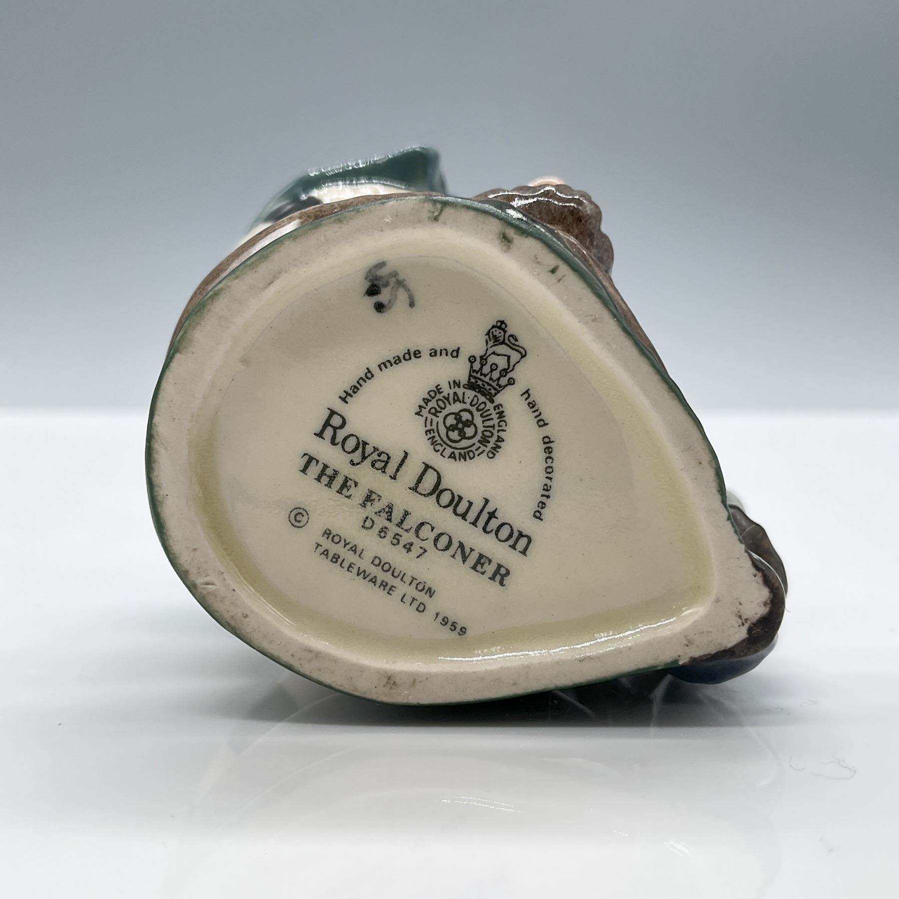 Variation One, green with black and white striped fur hat; green coat; grey and white falcon. Royal Doulton backstamp.