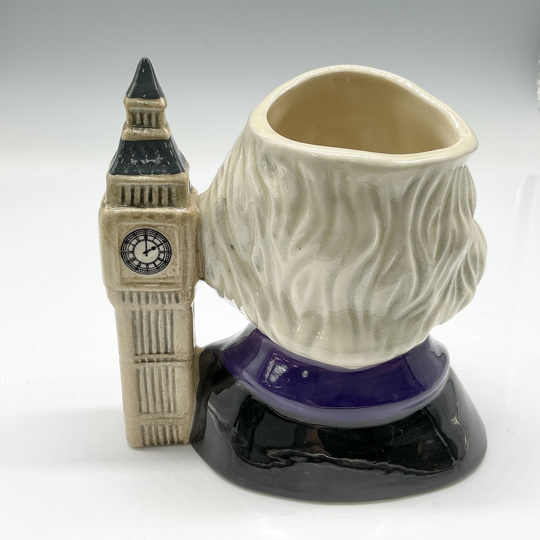 Variation Two, Big Ben is at Two O'clock. Black coat with purple collar; yellow cravat; Big Ben is dark brown. Royal Doulton backstamp.
