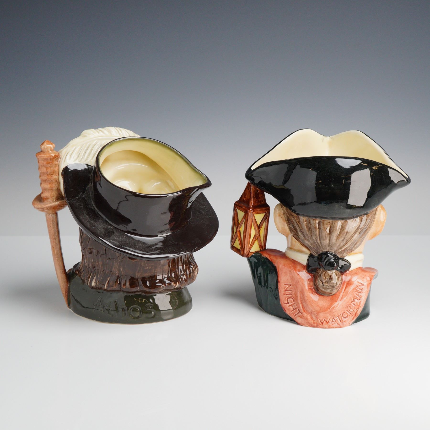 A pair of large Royal Doulton character jugs crafted in fine earthenware at the Burslem, England factory. Both pieces were modeled by Max Henk and feature molded, hand-painted underglaze decoration with a high-gloss finish. The first jug, Athos (D6439), is part of The Three Musketeers series and depicts the character in a dark brown wide-brimmed hat with a prominent white ostrich feather, featuring a handle shaped like a sword hilt and blade. The base is marked with the green Royal Doulton lion, crown, and roundel backstamp, titled Athos (One of the Three Musketeers), model D 6439, and COPR 1955, with registration numbers Rd No 877328, Rd No 34106, Rd No 7245, and Rd No 298/55. The second jug, Night Watchman (D6569), is from the Character Jugs from Williamsburg series, depicting the figure in a black tricorn hat and red-collared cloak over a dark green coat with a lantern-form handle. The base bears the green Royal Doulton backstamp, titled Character Jugs from Williamsburg, subject Night Watchman, model D 6569, and COPR 1962, with registration numbers Rd No 906338, Rd No 43446, Rd No 8225, and Rd No 285/62. Dimensions: Each approximately 7 to 7.5 inches in height.