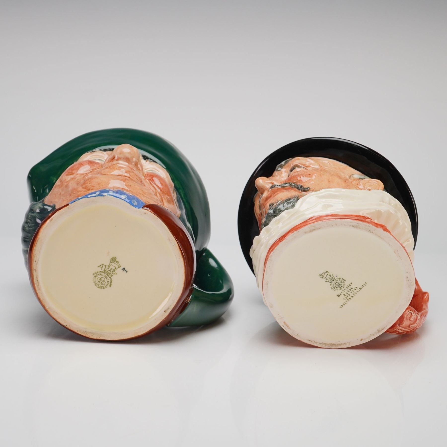 The first jug depicts Toby Philpots (D5736) shown wearing a dark green tricorn hat and a blue polka-dot neckerchief. The second jug depicts a Beefeater (D62026) in ceremonial dress with a crown-form handle and marked ER. Royal Doulton backstamp on each base.