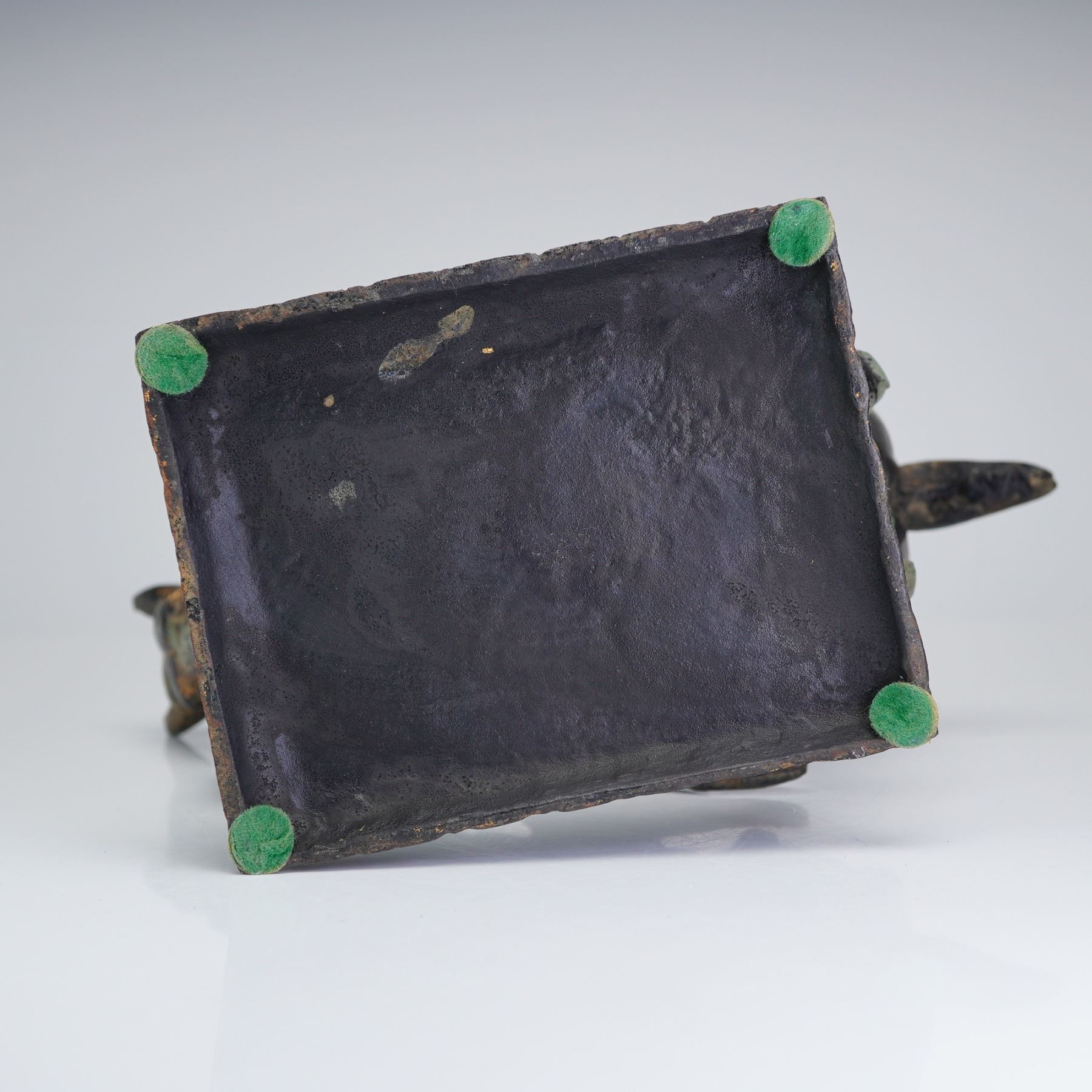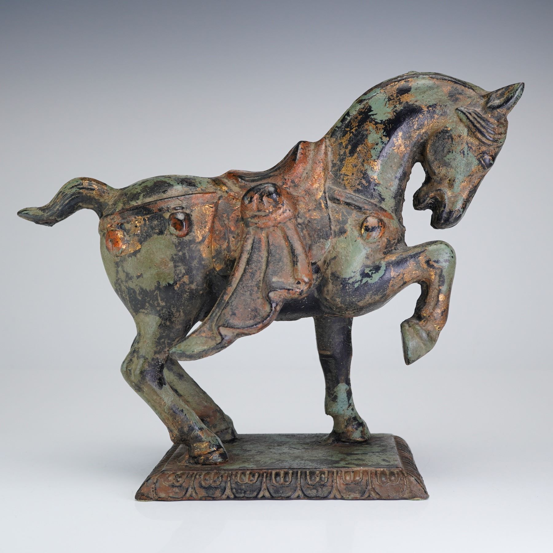 This Chinese parcel-gilt bronze metal horse figurine is executed in the archaistic style of the Tang Dynasty. The sculpture depicts a celebrated dancing horse in a spirited prancing posture with the front right leg raised and the head slightly turned. The animal is fully caparisoned, featuring a detailed saddle and a long, pleated saddlecloth draped over its flanks. The mane is defined by incised vertical lines. The figure is integrated into a rectangular plinth base decorated with a band of relief-cast stylized lotus petals around the perimeter. The surface exhibits a heavy, mottled patina with significant green malachite and reddish-brown cuprite oxidation. Extensive loss to the original parcel-gilding is present, with gold leaf remaining primarily in recessed areas. The underside of the base shows a dark, uniform surface and is fitted with four modern green felt pads.