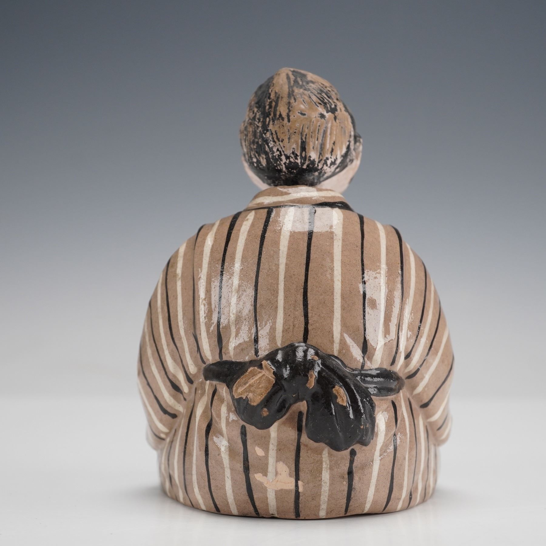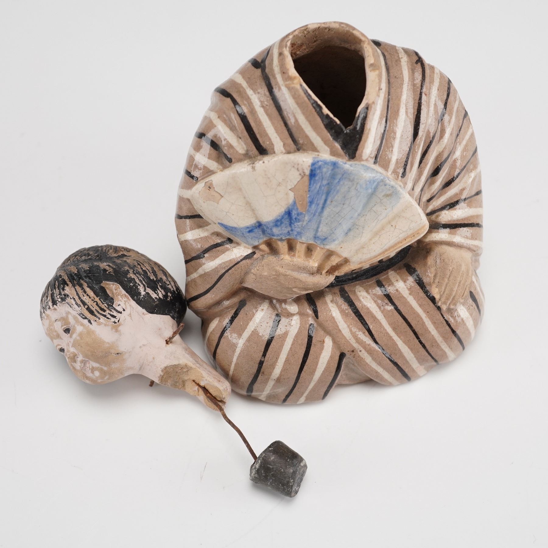 Depicts a seated Asian figure adorned in traditional striped attire and holding an open fan. The piece is decorated with a beige ground, black and white stripes on the garment, and blue accents on the fan. The head, featuring painted facial details and hair, is designed to nod, connected to the hollow body by an internal wire and block mechanism.