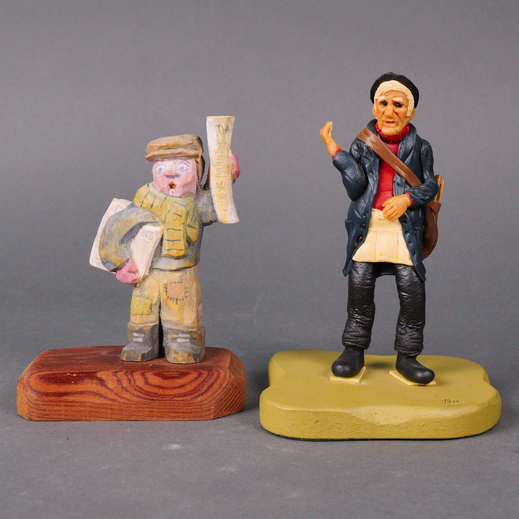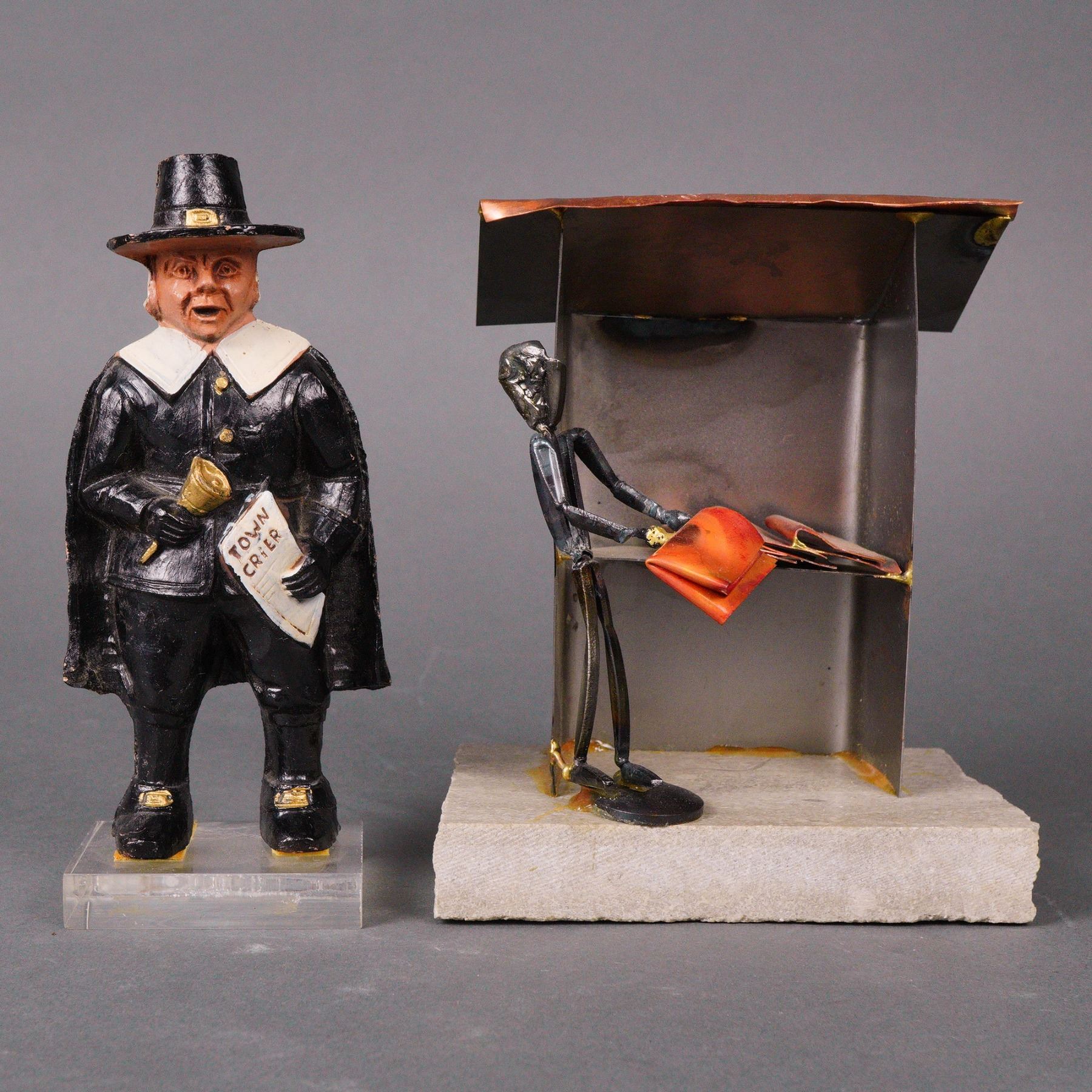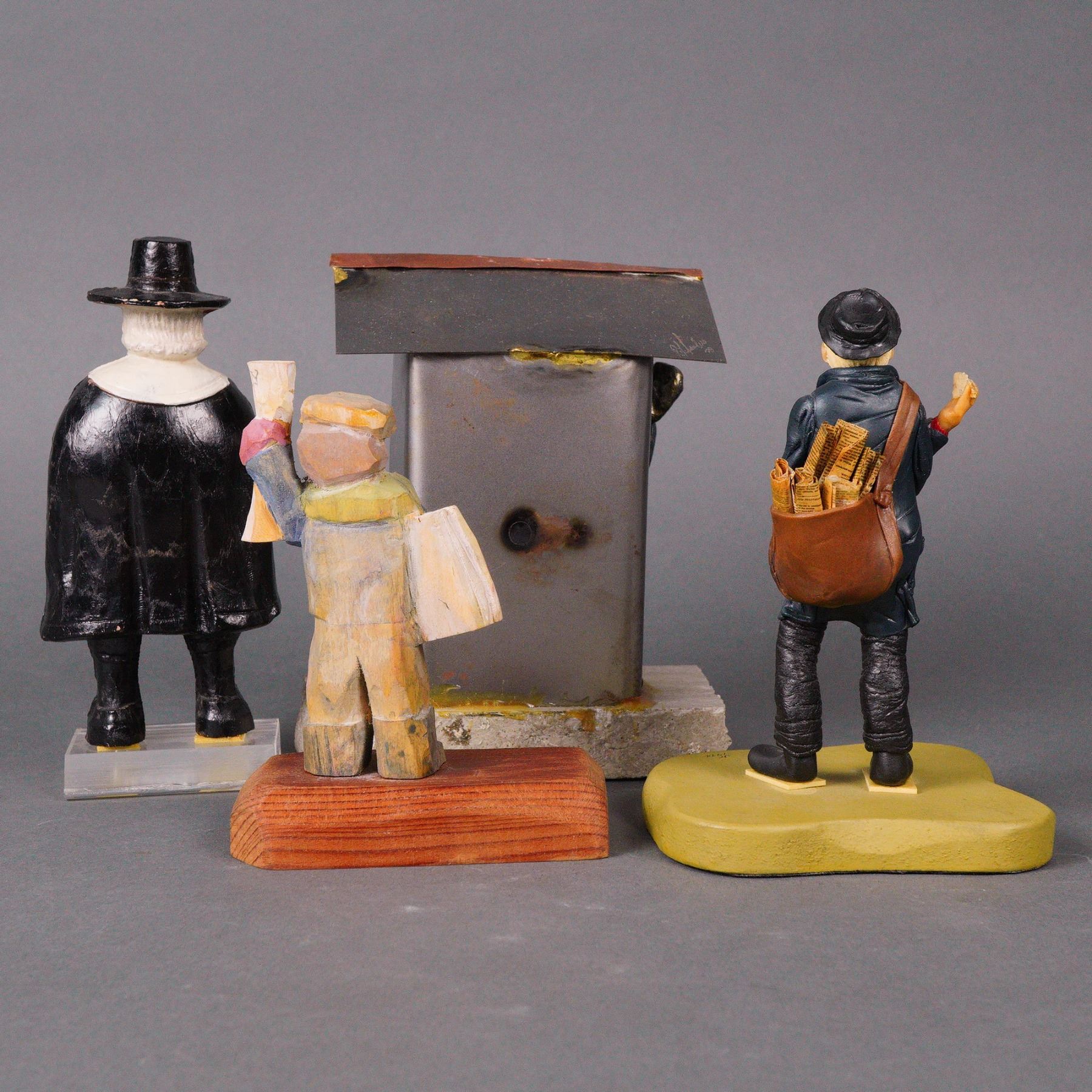 A collection comprising three folk art-style figurines and a mixed media newspaper stand sculpture. The mixed-media sculpture features a stylized blackened metal figure holding a newspaper while standing by a stand mounted on a rough-hewn stone base. An etched signature and date are visible on the roof. The three folk art-style figurines, are crafted from wood (signed and dated) and resin. They depict traditional characters: a Town Crier figure holding a bell and a scroll reading TOWN CRIER, a newsboy with a rolled newspaper, and an older male figure carrying a satchel filled with papers.