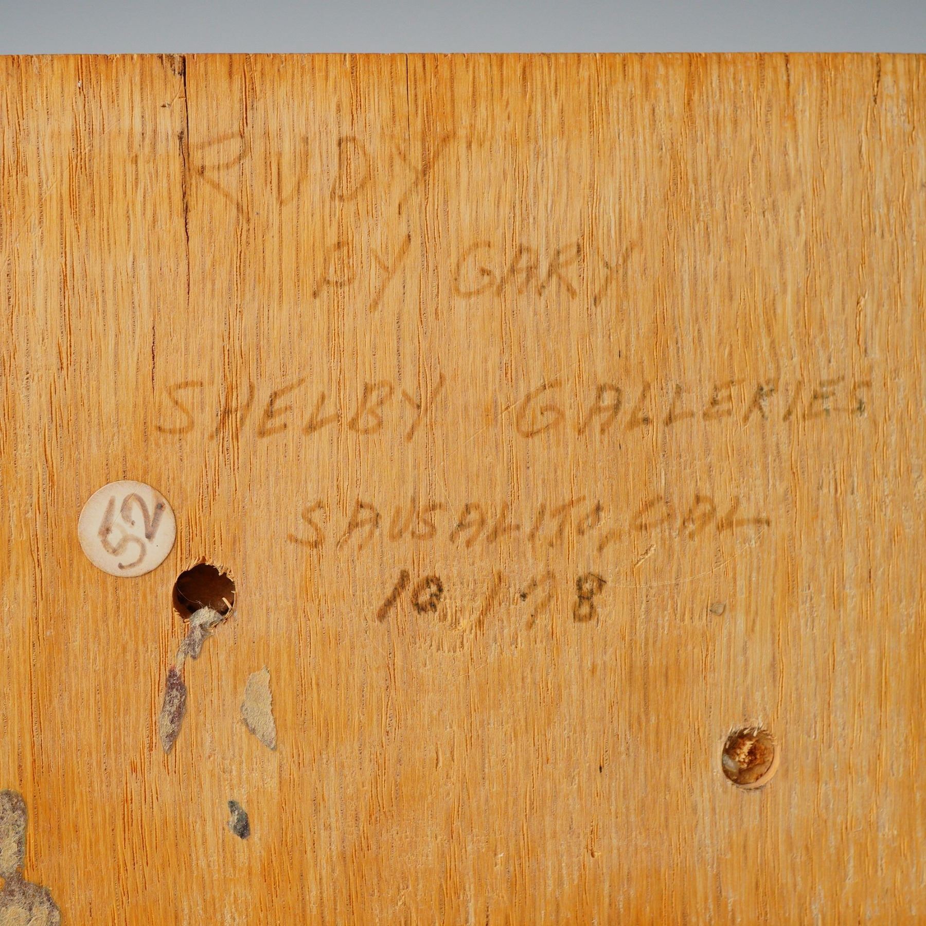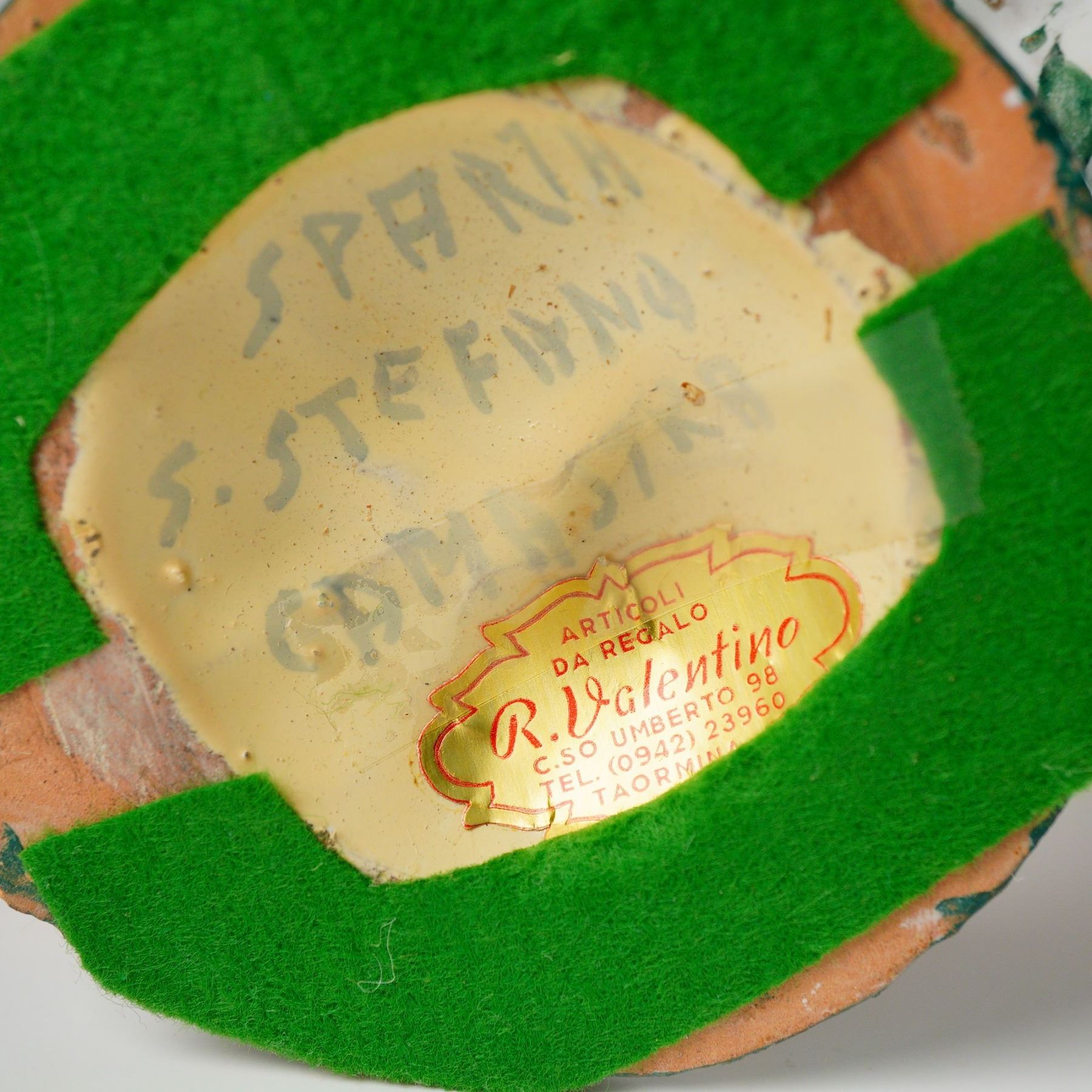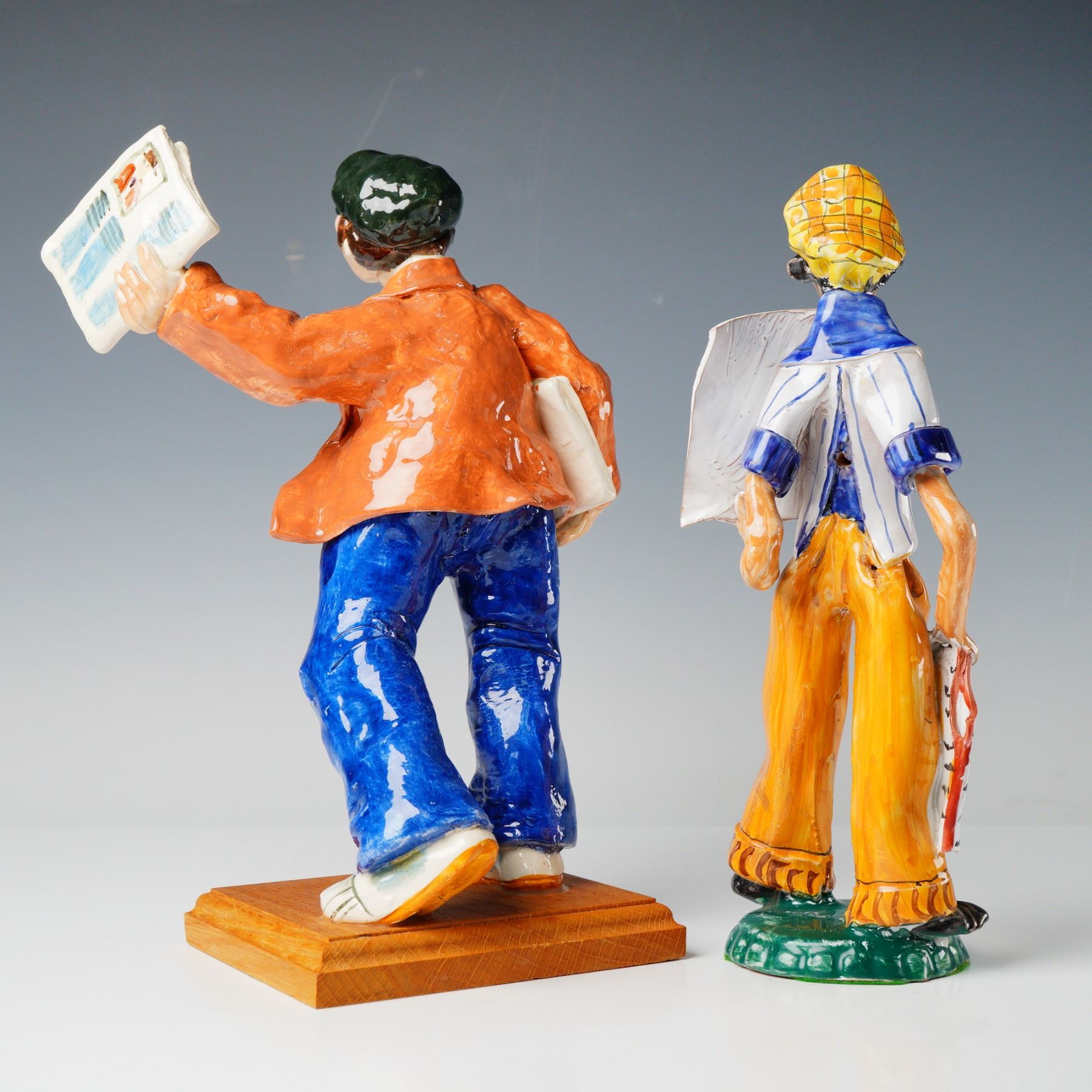 A grouping of 2pc figurines crafted from brightly glazed and polychrome painted ceramic, executed in an expressive, stylized manner, depicting newsboys holding papers. The larger figure is mounted on a rectangular wooden base. The underside of this base is inscribed "RUBY BY GARY SHELBY GALLERIES SAUSALITO, CAL 10/78". The second figure stands on an irregular green ceramic base and bears a retailer's label from "R. Valentino ARTICOLI DA REGALO" (Giftware) located in Taormina, Italy. Largest item: 8.5"L x 5"W x 11.75"H.