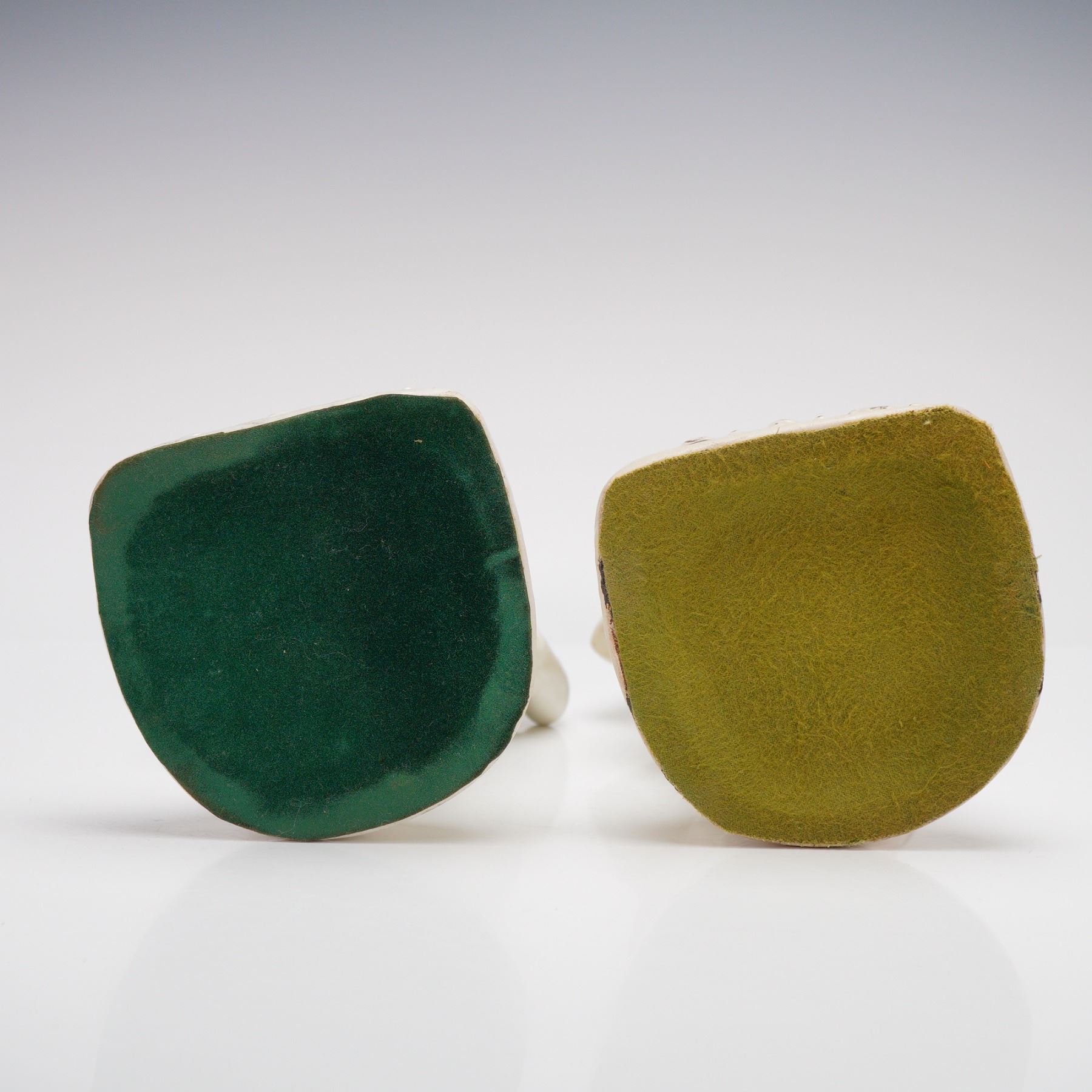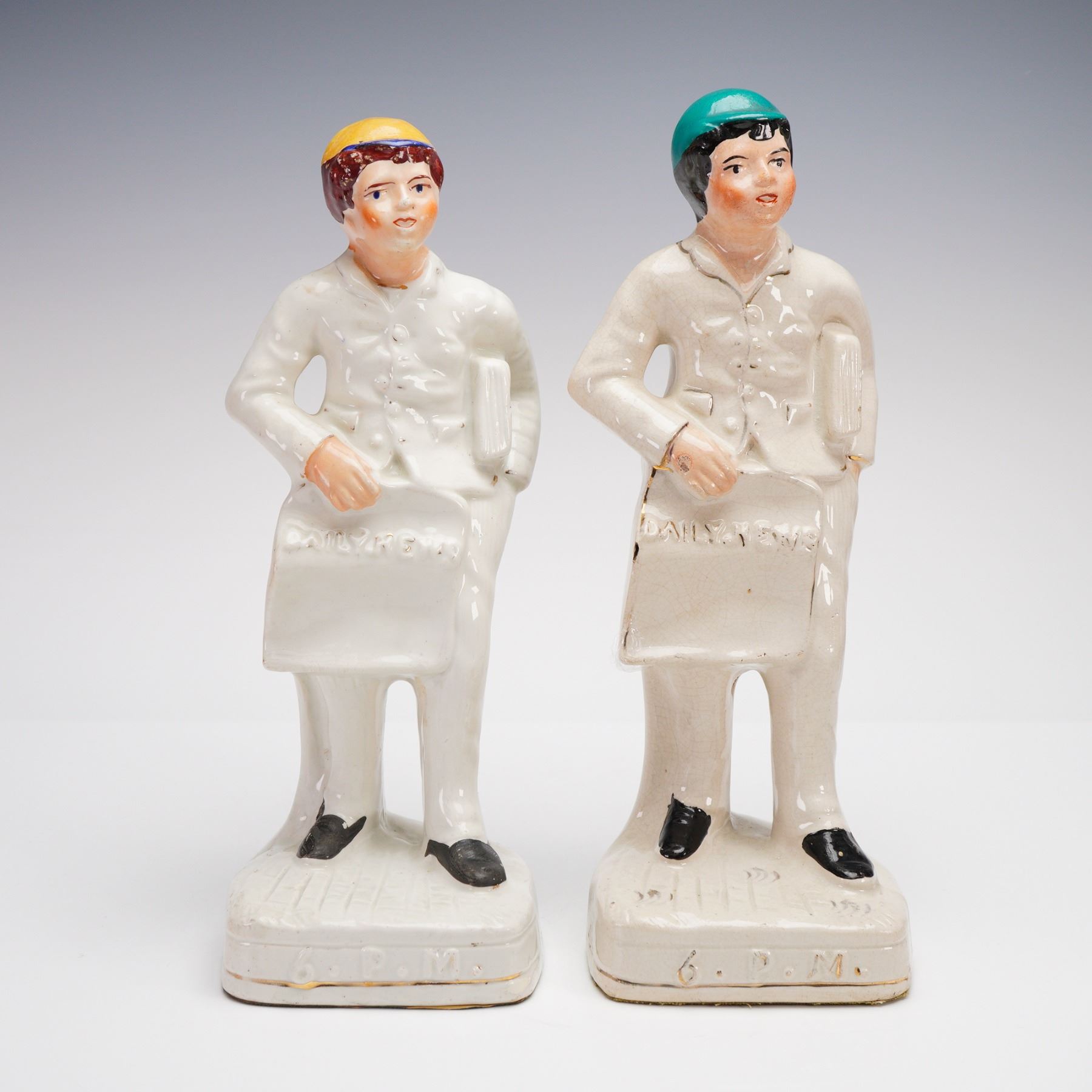 Victorian-era Staffordshire porcelain figurines depicting young newspaper delivery boys, each holding a "Daily News" bag marked 6 P.M. at the base. These figures, commonly attributed to Staffordshire by multiple reference sources, feature hand-painted details including colored caps, expressive facial features, and individually modeled satchels and newspapers. The pair displays the characteristic glaze, palette, and folk-style modeling associated with 19th-century Staffordshire pottery. Both figures stand on molded bases and retain later green felt underside coverings. No maker's backstamp is present, consistent with many period Staffordshire pieces.