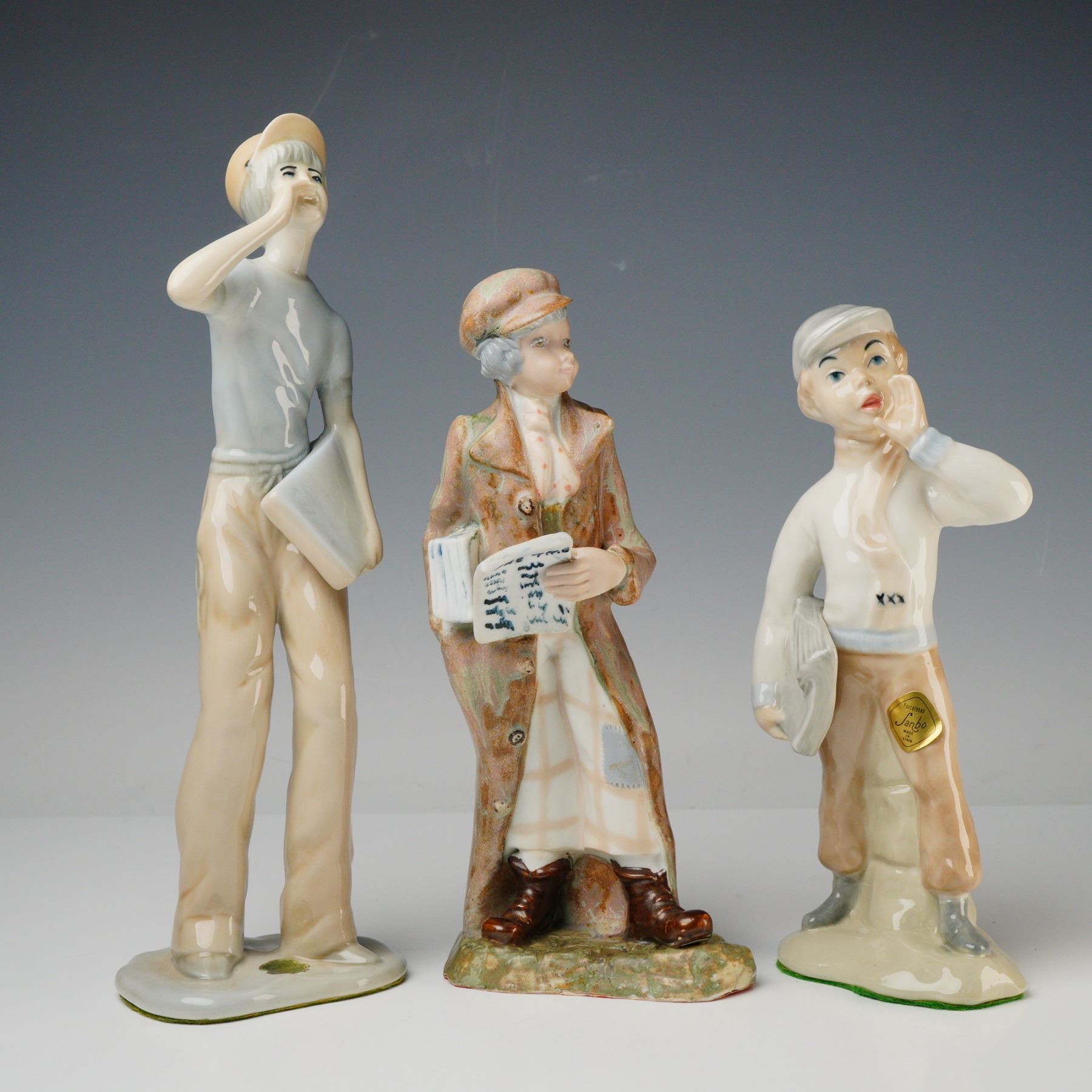 Lot 106 Three Spanish Glazed Porcelain Figural Statuettes of Newspaper Sellers