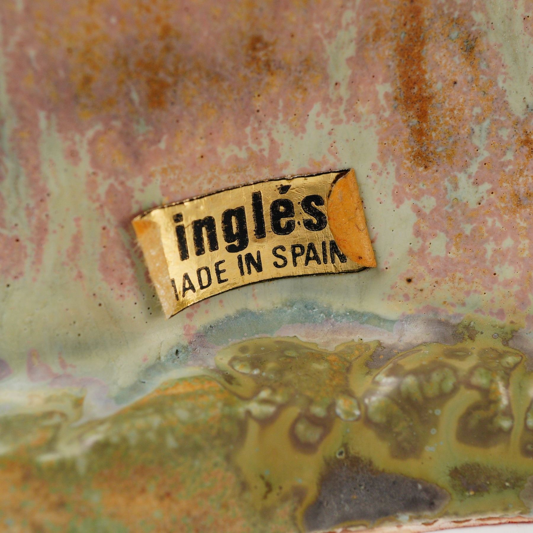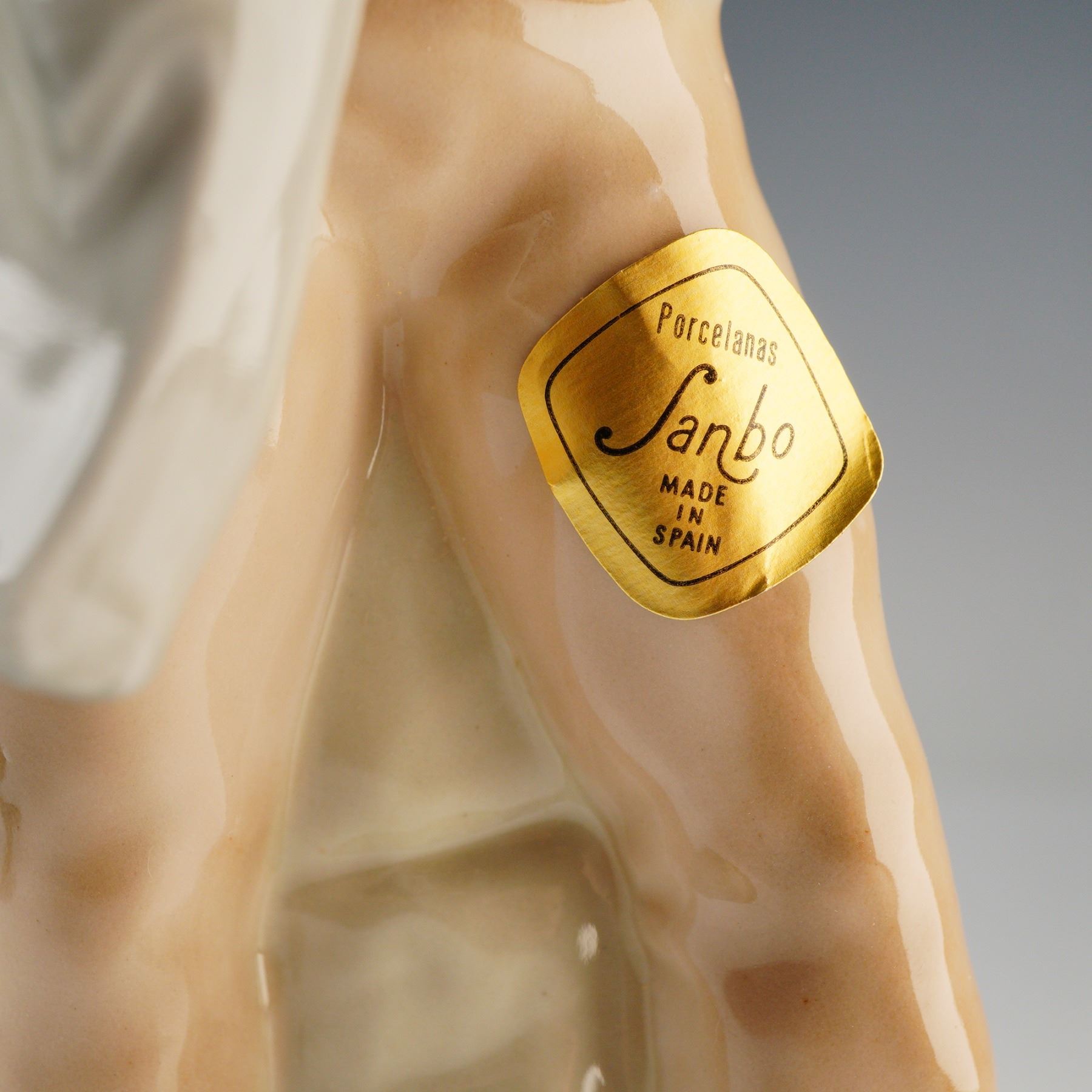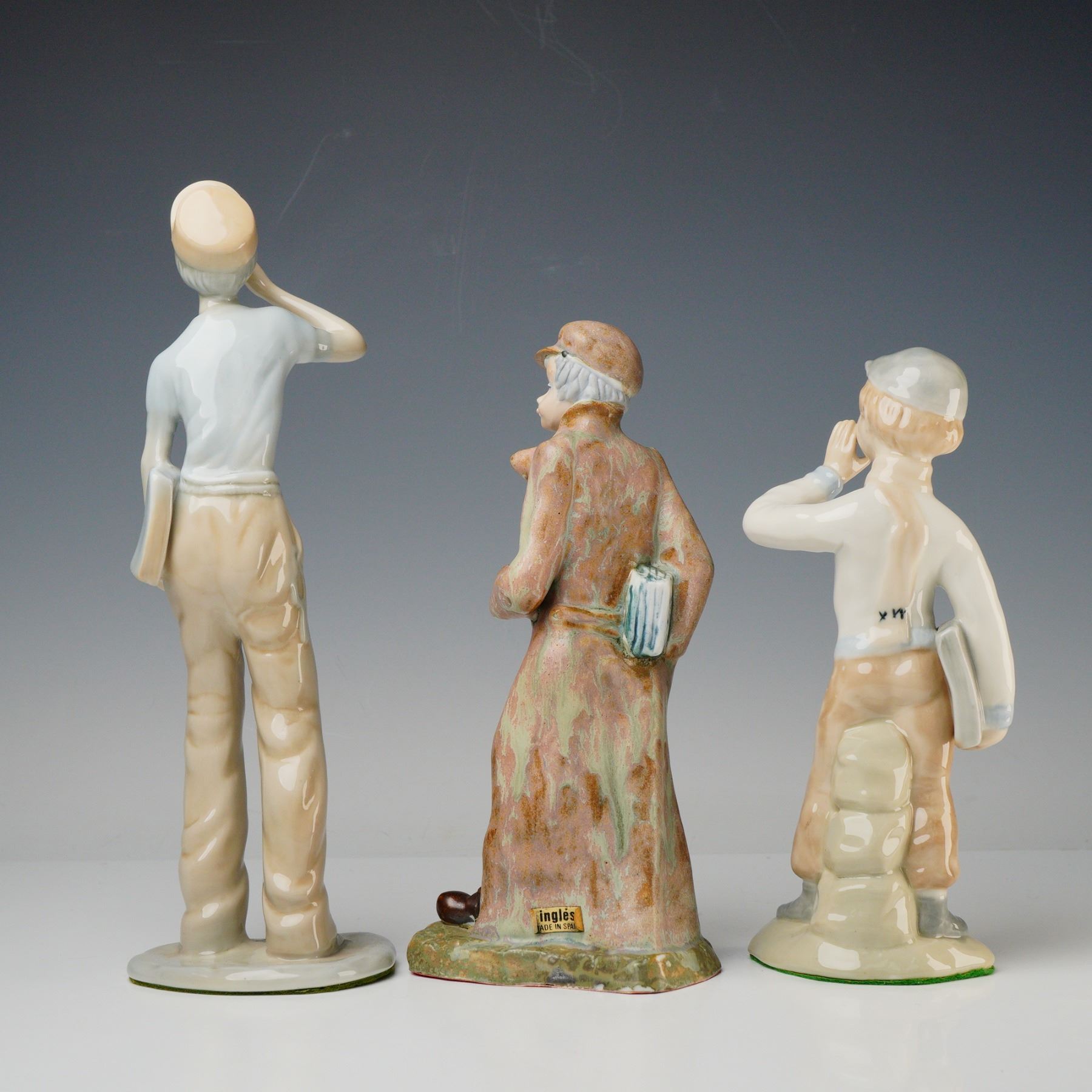 A trio of glazed porcelain figural statuettes depicting newspaper sellers, likely mid-to-late 20th century Spanish production. The figures are rendered in a realistic style with a high-gloss glaze and muted coloring. The group includes two male youths and one adult figure, all posed holding papers as if shouting or reading. Visible markings confirm Spanish origin. The right-most figure bears a gold foil label reading Porcelanas Sanbo MADE IN SPAIN. The center figure features a gold foil label reading ingles MADE IN SPAIN. The tallest figurine bears a label marked Fantasia. The undersides of the bases are covered with green or red felt. Largest item: 3.75"L x 3.25"W x 11.5"H