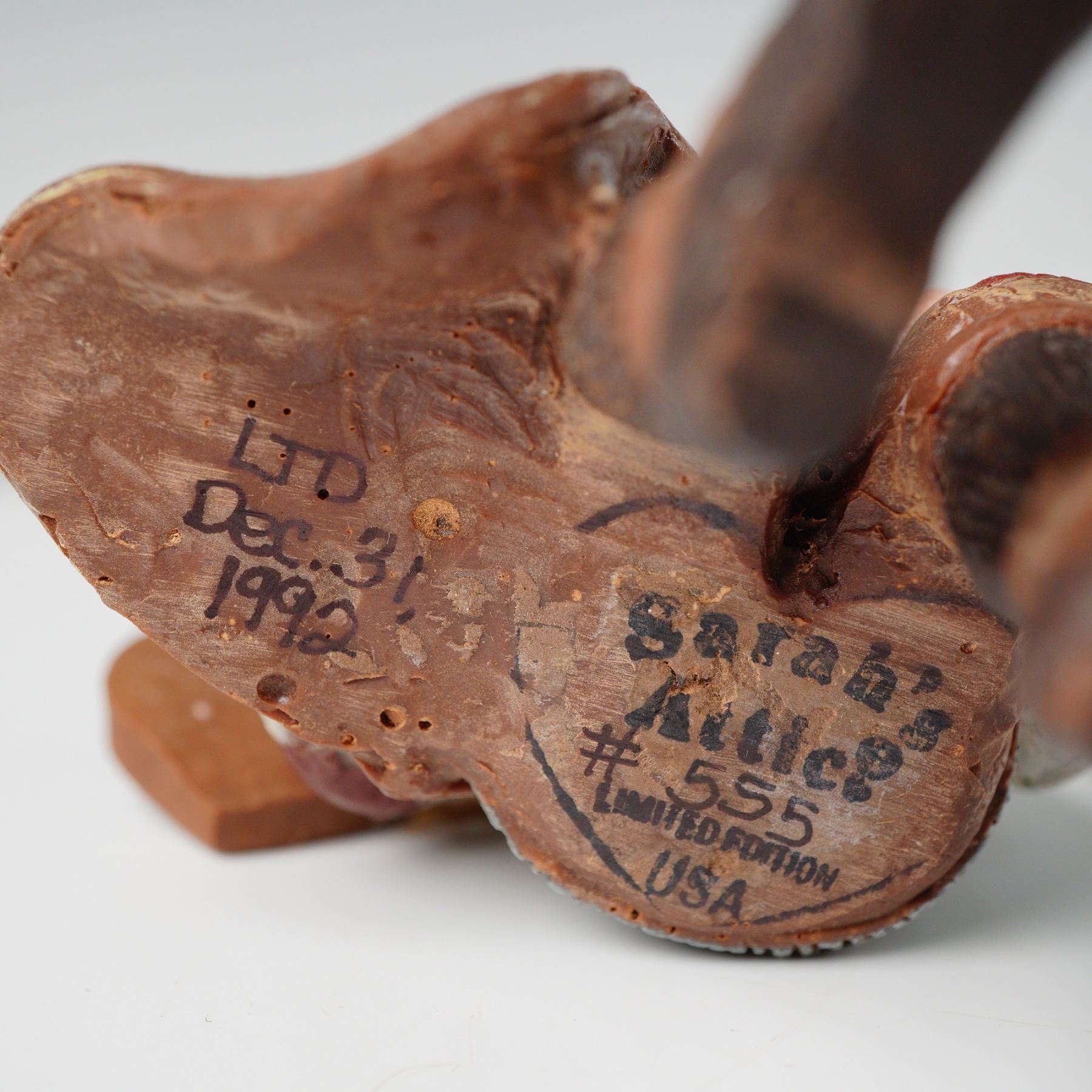A collection of three collectible figurines. The group comprises two folk-art style figures and one glossy white porcelain figure. The two multi-colored figures depict newsboys constructed of painted wood or resin, featuring intentional surface distressing and patched clothing details. Both newsboy figures are marked on the base as "Sarah's Attic" Limited Editions, dated December 31, 1992. The seated newsboy is numbered #555 and holds a bag marked "POST." The standing newsboy is numbered #615 and holds a bag marked "OUR NEWS." The third figure is a white ceramic or porcelain statue depicting a standing man in a long coat holding a package behind a counter. The base of this white figure is incised with the name "FRANKLIN." The largest item is the white porcelain figurine it measures.
