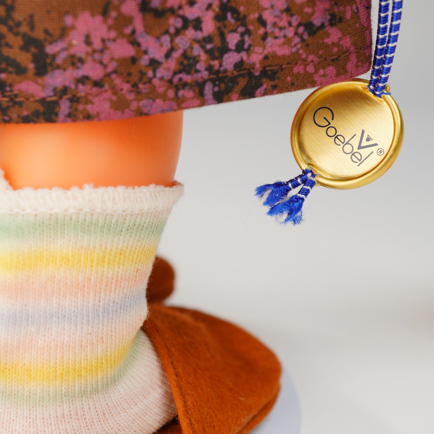 A vintage collectible set featuring the Goebel Hummel Goose Girl vinyl doll, identified as the Ganseliesl model. The doll is constructed of hard plastic or vinyl, depicting a young girl in traditional folk costume, including an orange patterned bonnet, a dark jumper over a white blouse, a floral yellow apron, striped knit socks, and brown felt slippers. The doll is accompanied by two separate white molded geese figurines featuring orange beaks and feet. A gold-tone medal is tied to the doll's wrist via a blue and green cord. The medal is visibly stamped "Goebel V" (registered trademark) on one side and "HANSE GOEBEL" on the reverse. The lot includes the original clear tubular plastic packaging.