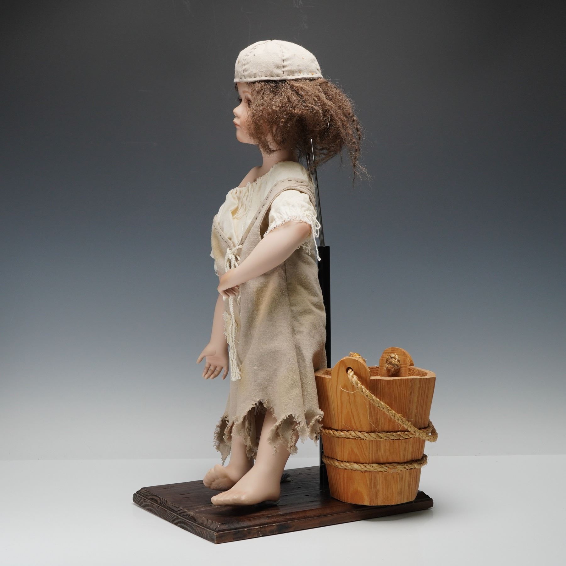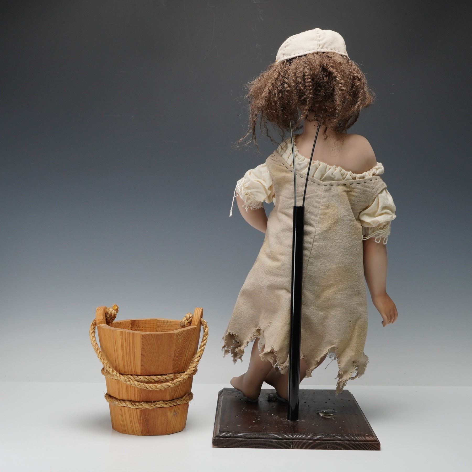 A finely crafted porcelain doll depicting a young girl in tattered period attire, posed & affixed on a wooden base with a rustic bucket accessory. The figure features expressive brown eyes, hand-painted facial details, and curly brown hair beneath a simple cloth cap. Dressed in a distressed beige dress with patch and lace-up detailing, the doll conveys a sense of innocence and humility. Artist signatures of Helen M. Carr appear on the back of the neck, accompanied by the model number 2610A.