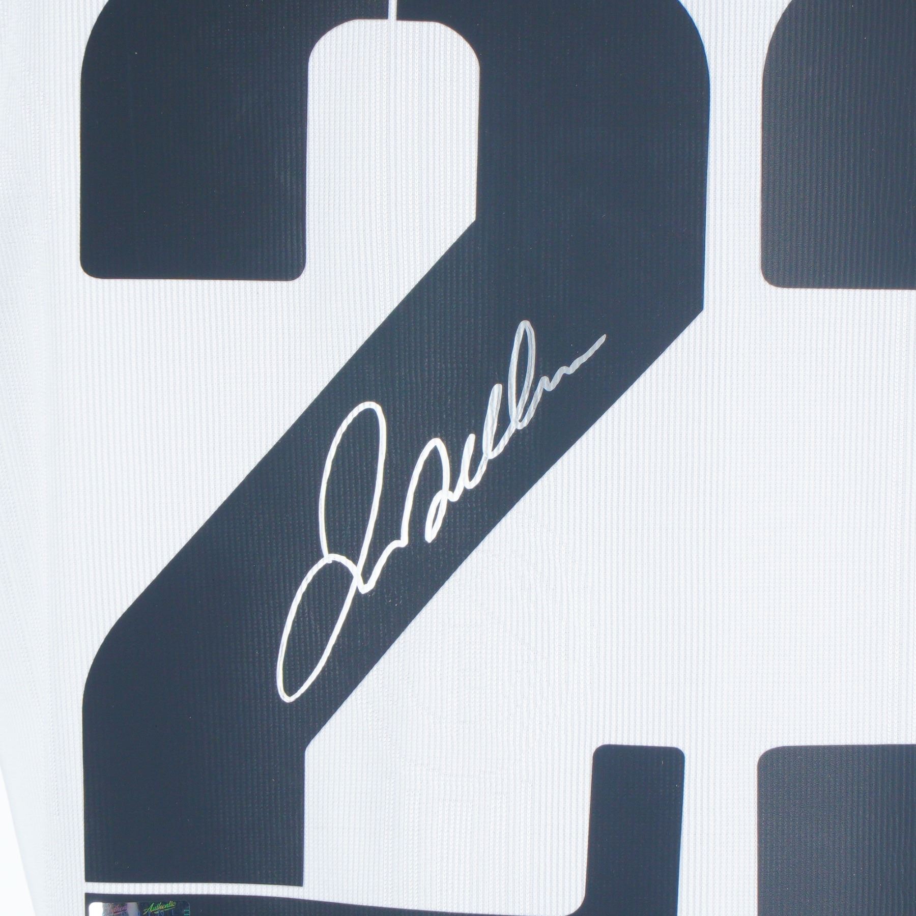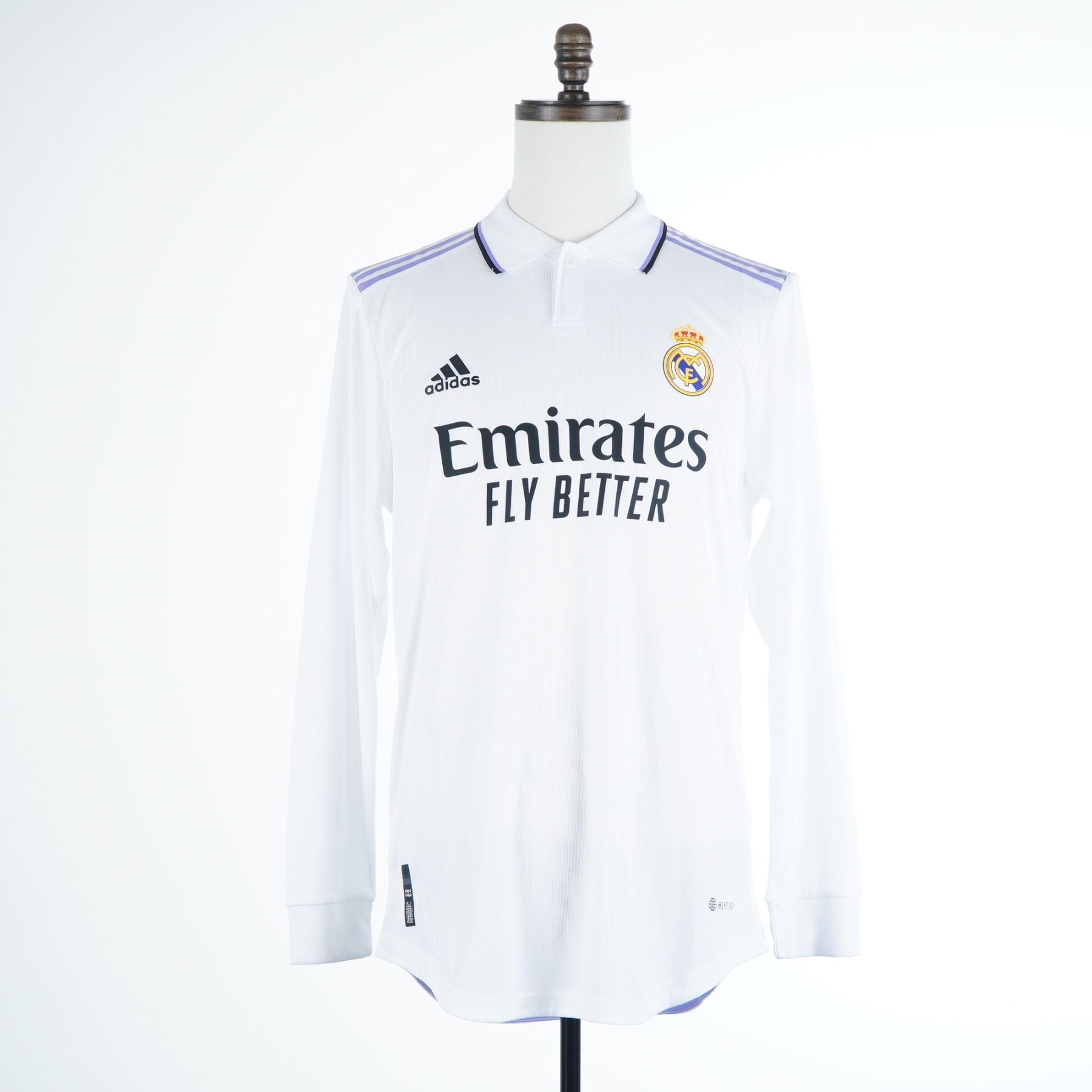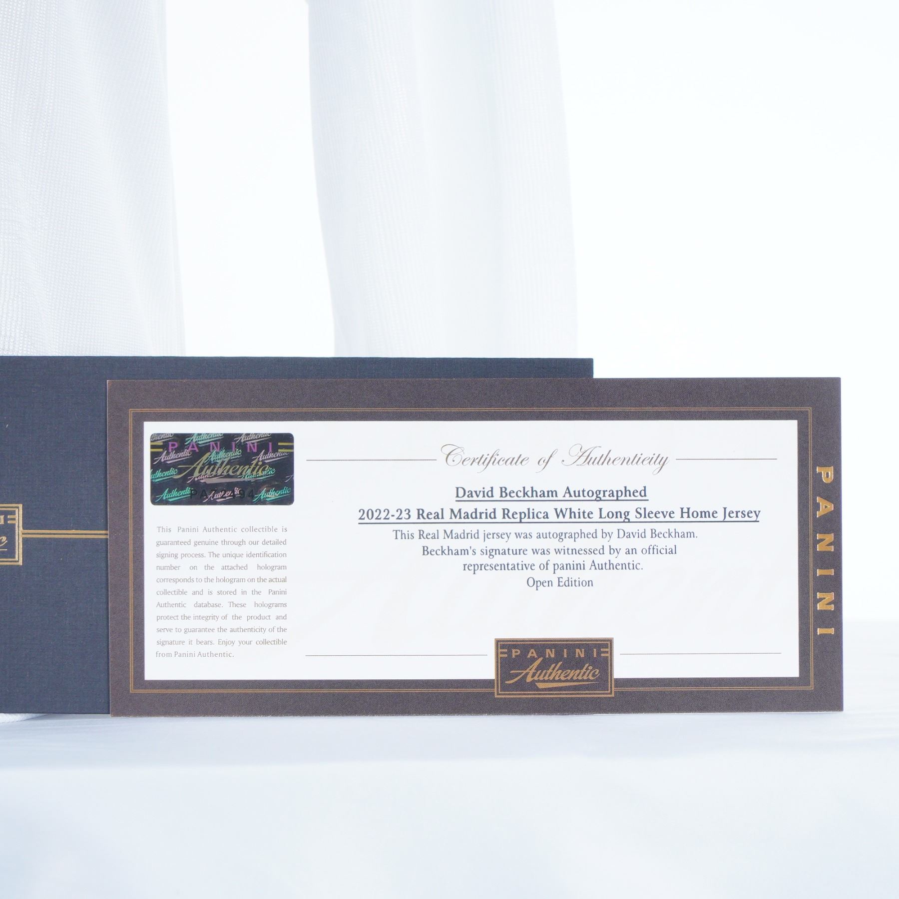 This is an official Adidas 2022-23 Real Madrid replica long-sleeve home jersey hand-signed by club legend David Beckham. The jersey features the traditional white color scheme with purple accents on the collar and the signature three-stripe branding on the shoulders. The front displays the embroidered Real Madrid crest and Adidas logo, with the "Emirates FLY BETTER" sponsor printed across the center. The reverse features Beckham's name and his iconic number "23" in the official team font. While this is a modern 2022-23 season kit"the same era associated with the arrival of English star Jude Bellingham"it serves as a tribute to the original English Galactico who famously occupied the number 23 slot from 2003 to 2007. The signature is rendered boldly in silver marker across the back number. This item is a premier piece of Madrid memorabilia, bridging the club's historic past with its modern aesthetic. Authentication is provided by Panini Authentic, featuring a Certificate of Authenticity with a matching tamper-evident hologram, confirming the signature was witnessed by an official representative.